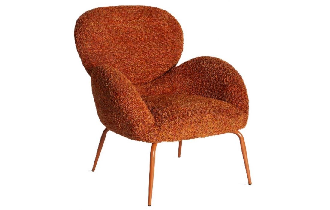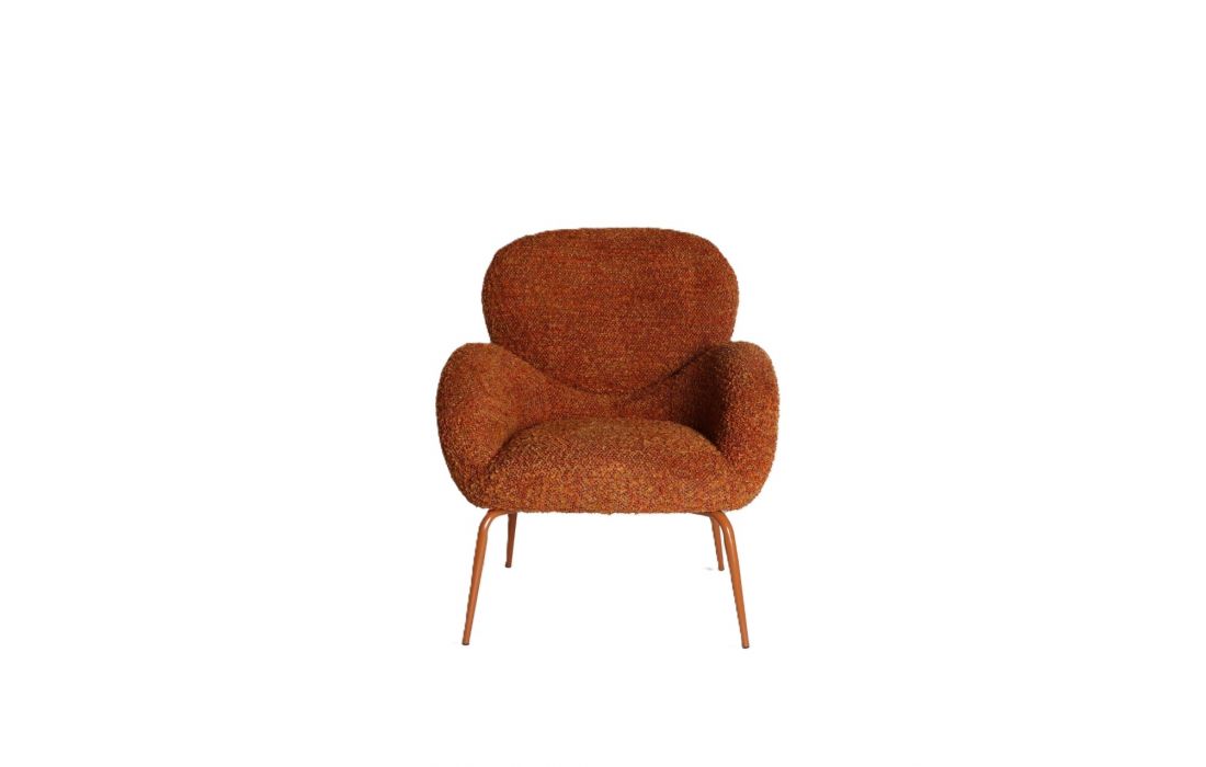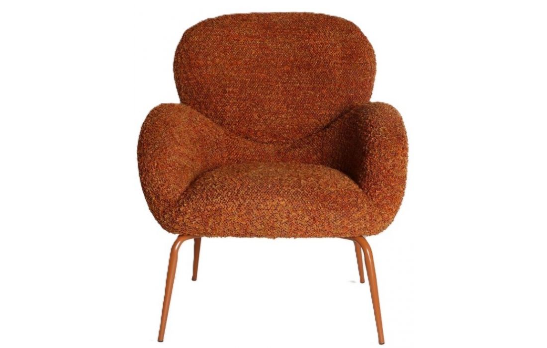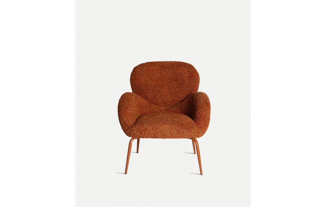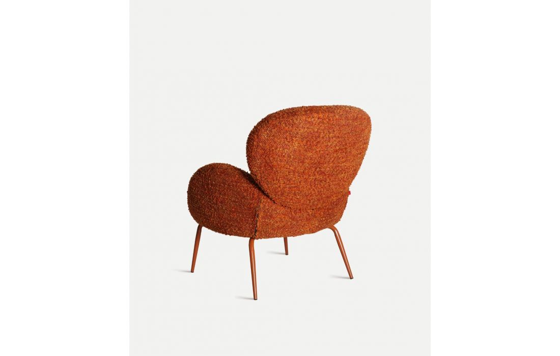 Armchair with a cozy, enveloping design, fabric upholstery, and iron legsRecipient :