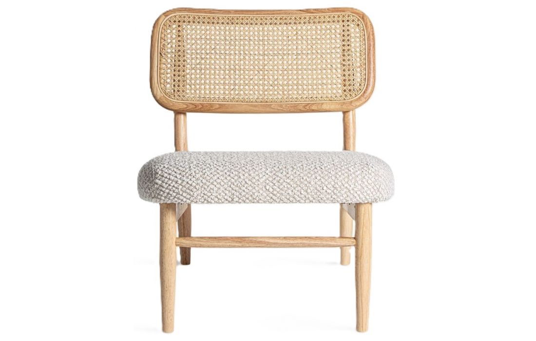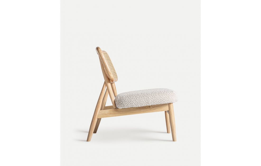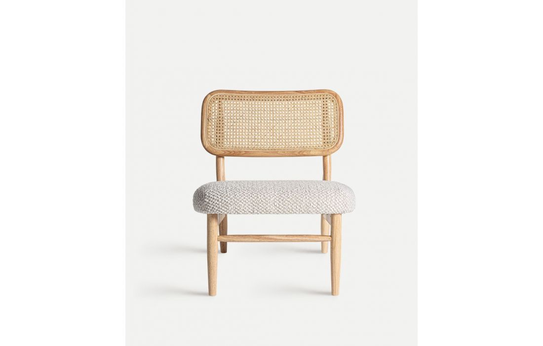 Natural design armchair made of straw, rubber wood, and a fabric seatRecipient :