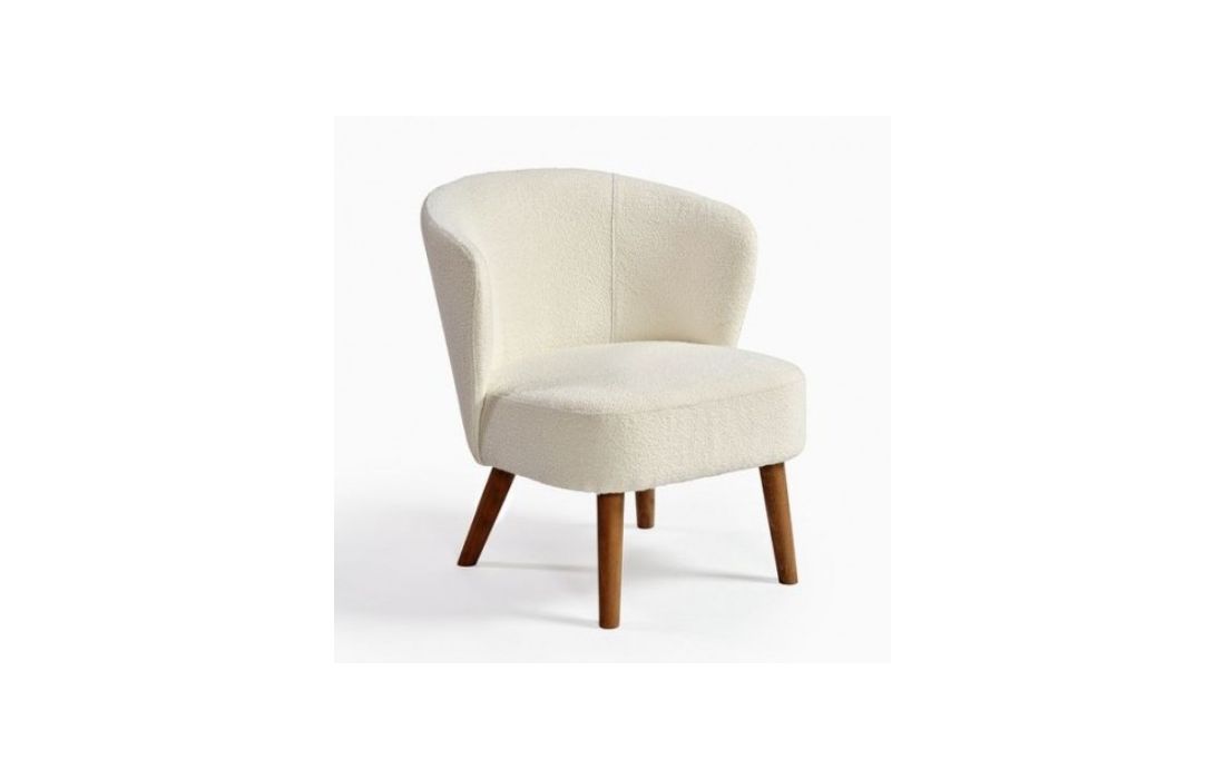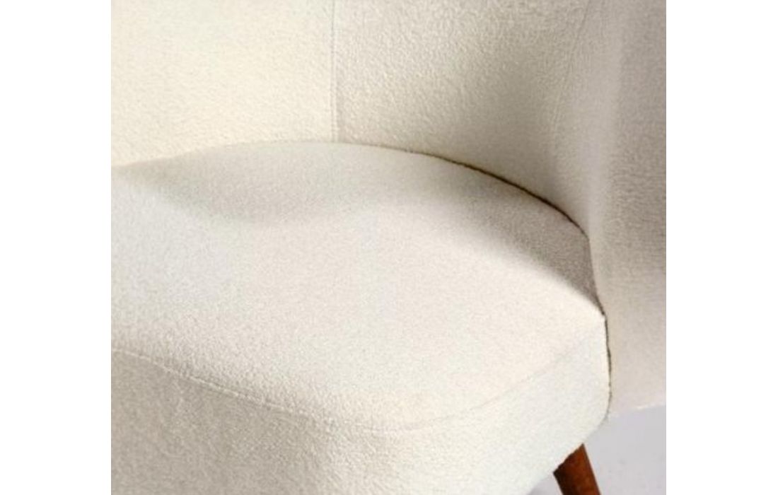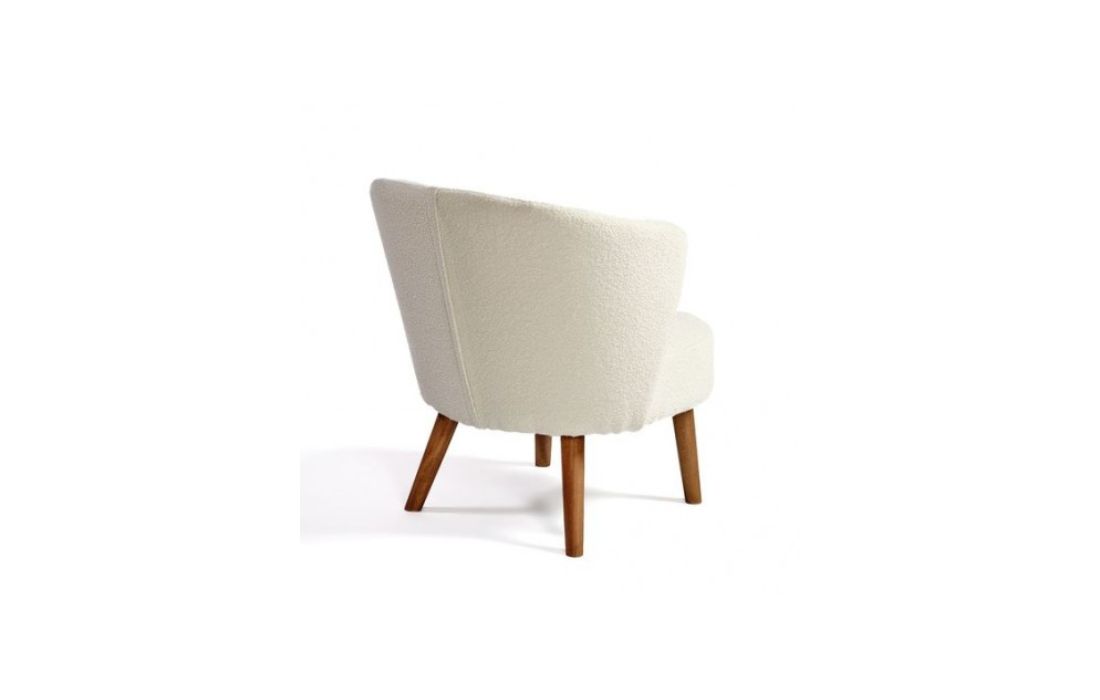 Low armchair upholstered in ivory with natural wood legs. The backrest design extends to the sides, providing a slightly more comfortable fit.Recipient :