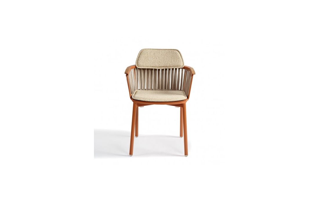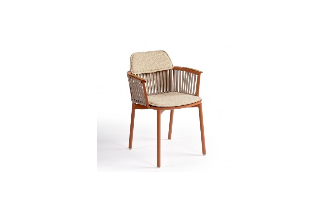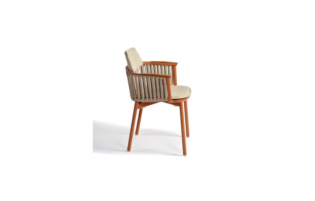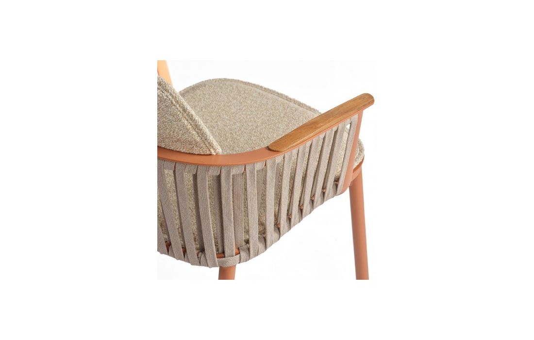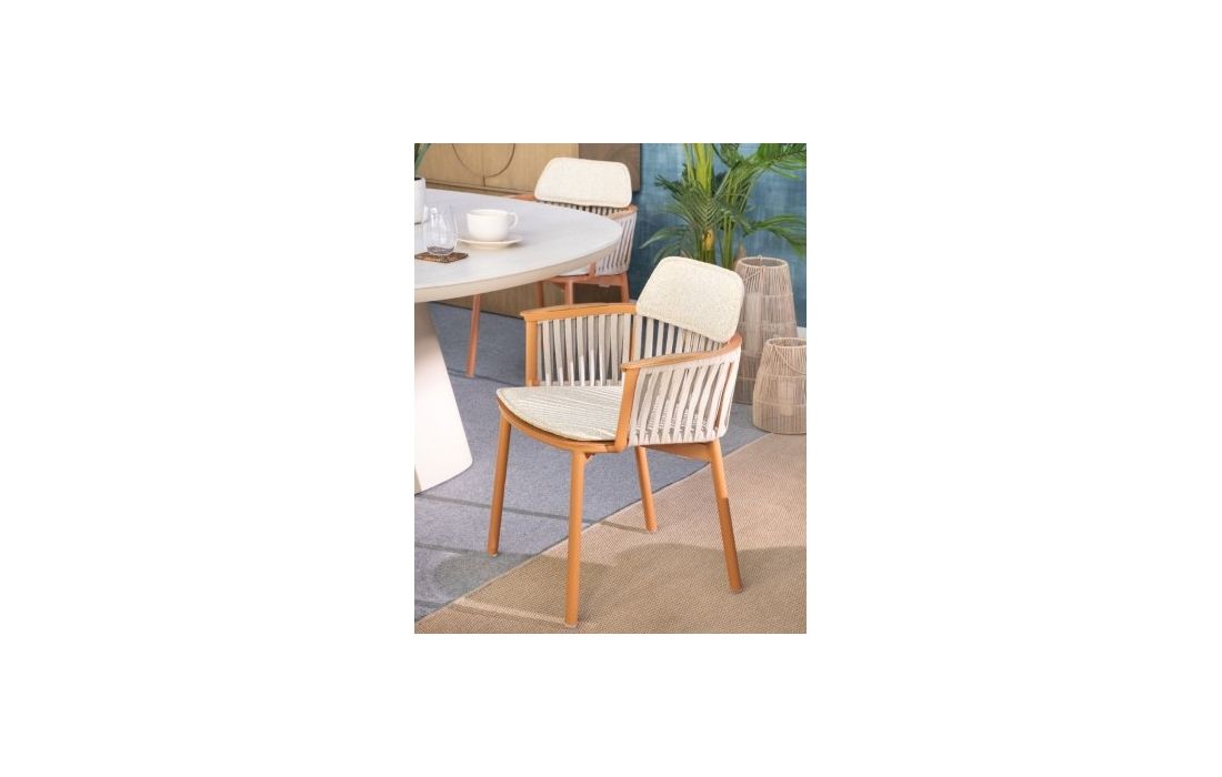 Outdoor dining chair with a wooden and rope frame and upholstered sand cushions. Perfect for al fresco dining.Recipient :