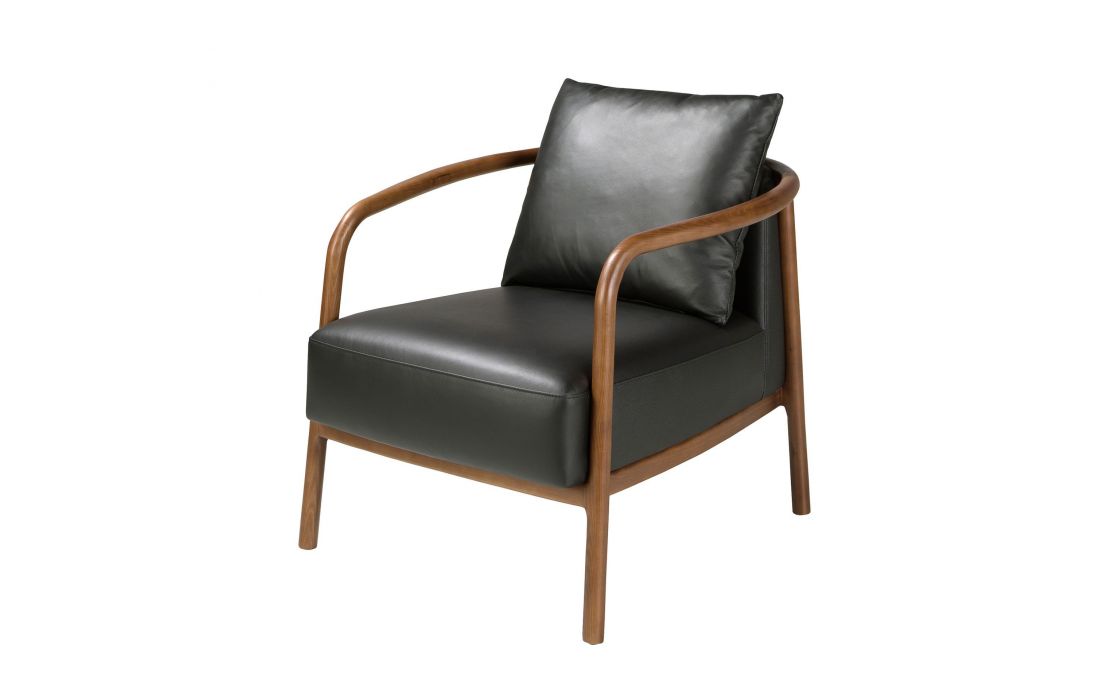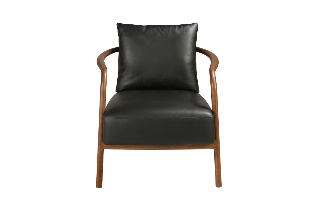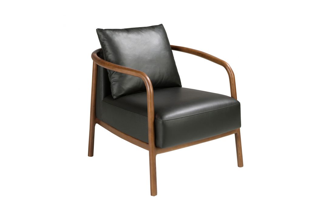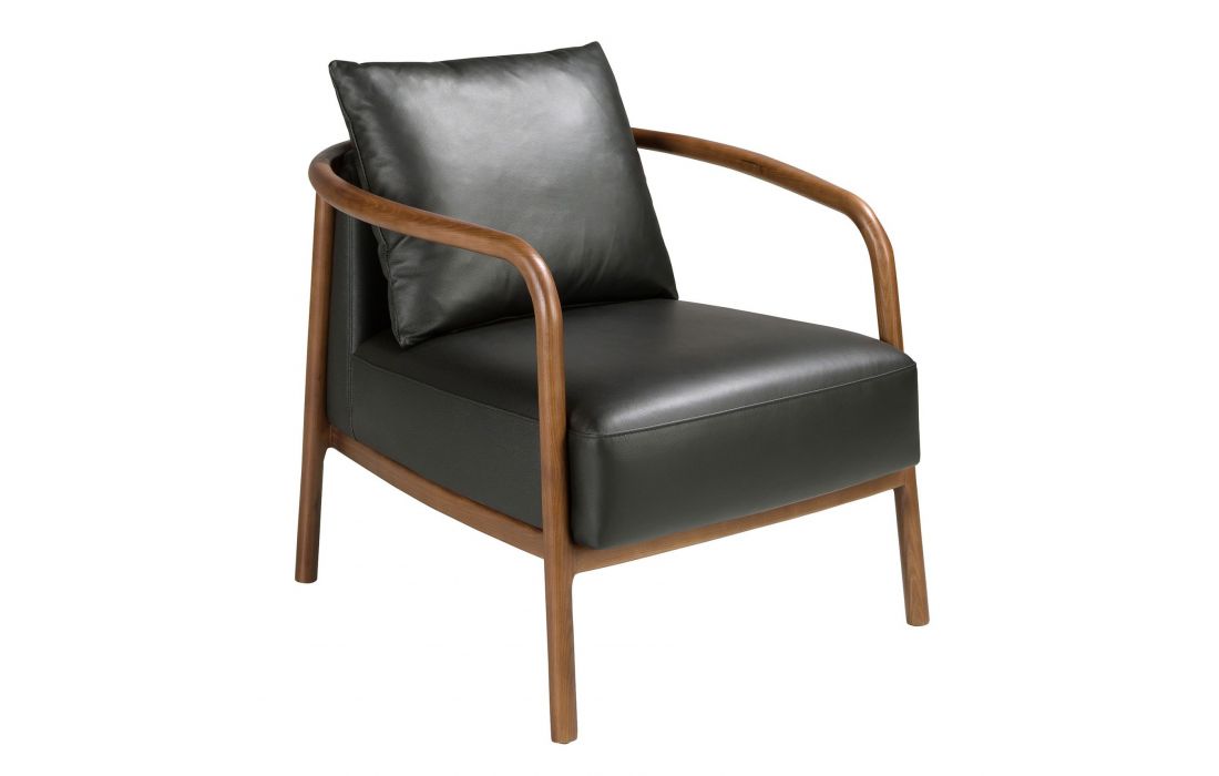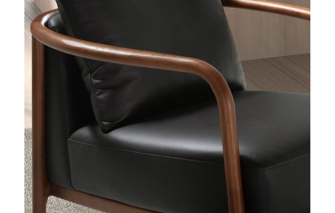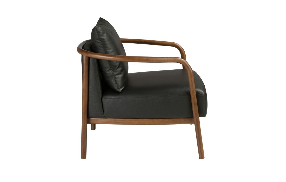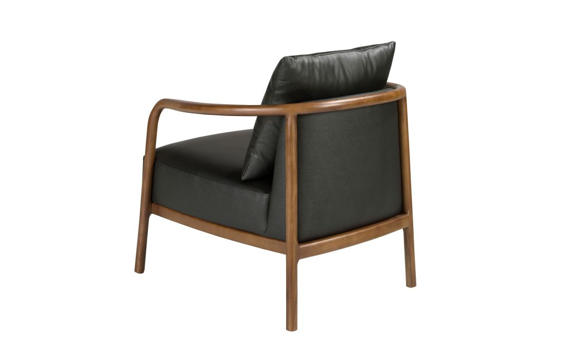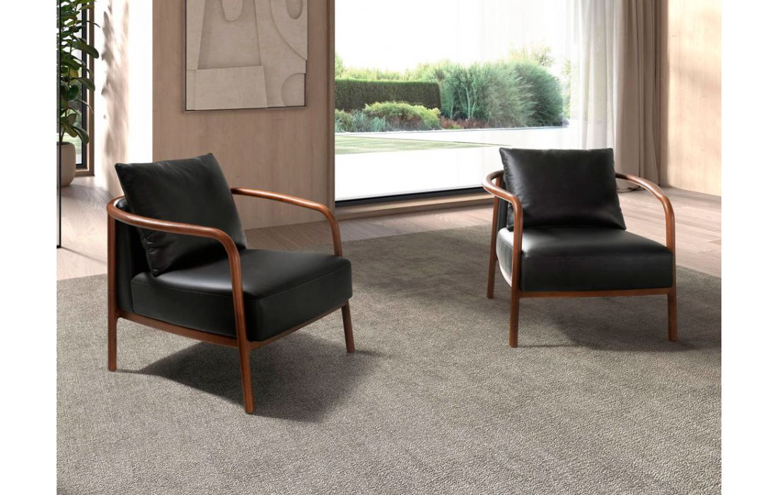 Modern armchair with seat and back upholstered in black cowhide leather. With its elegant design and walnut-colored wooden legs, this armchair perfectly combines style and comfort.