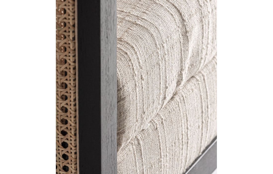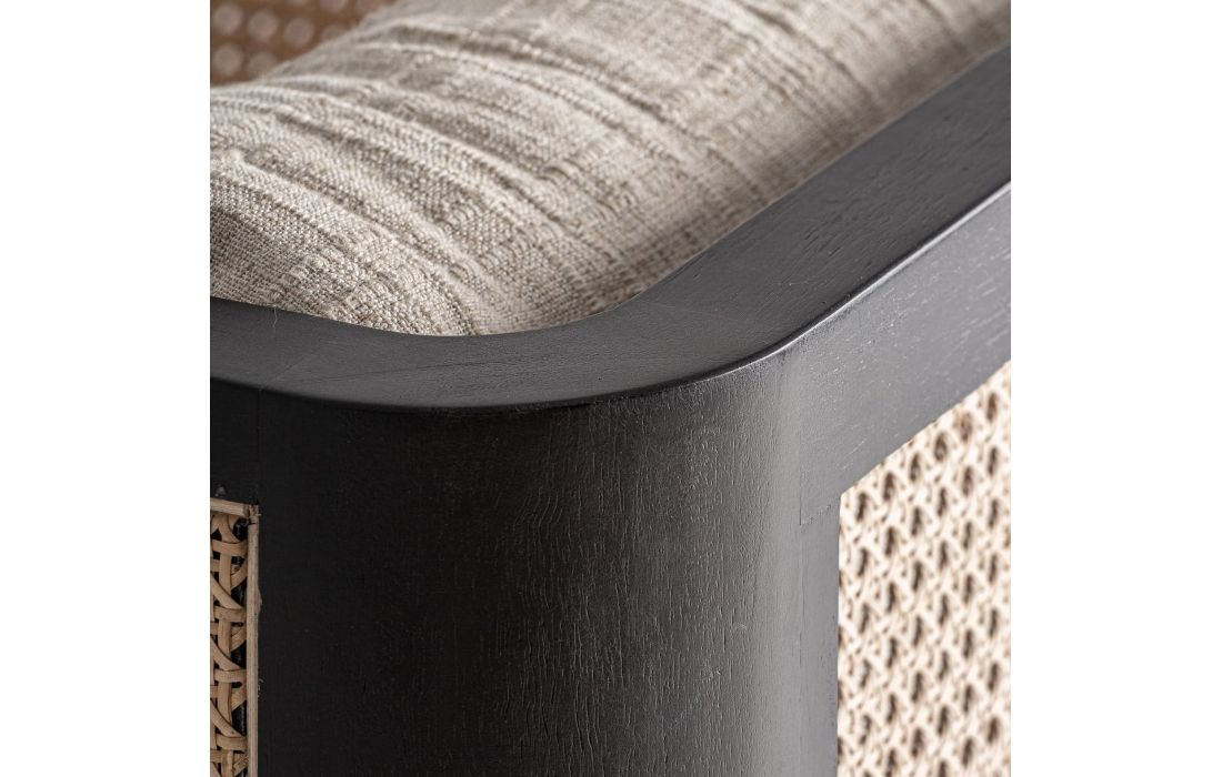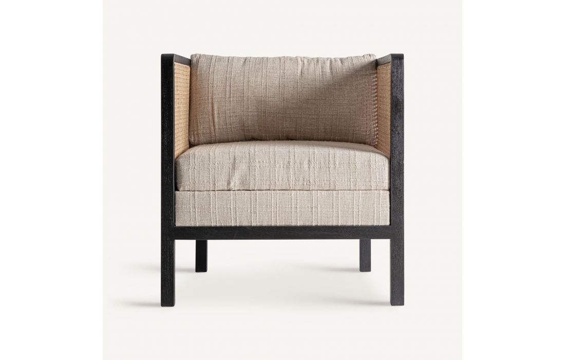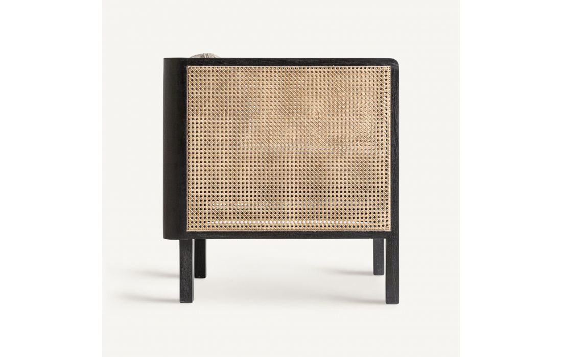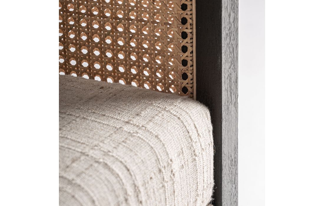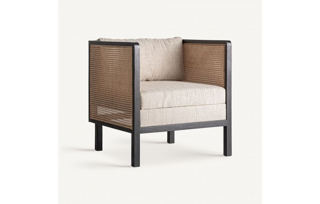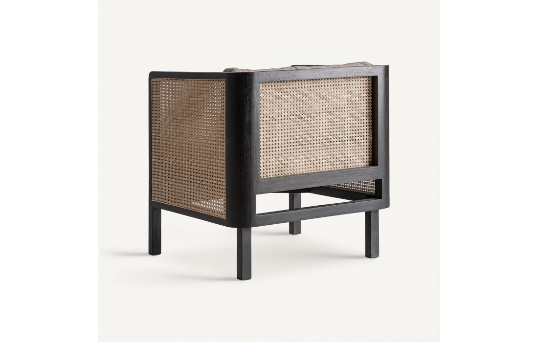 This armchair combines mango wood with fabric and wicker. A piece that balances modernity and craftsmanship, ideal for projects seeking serenity and contemporary character. Dimensions in cm