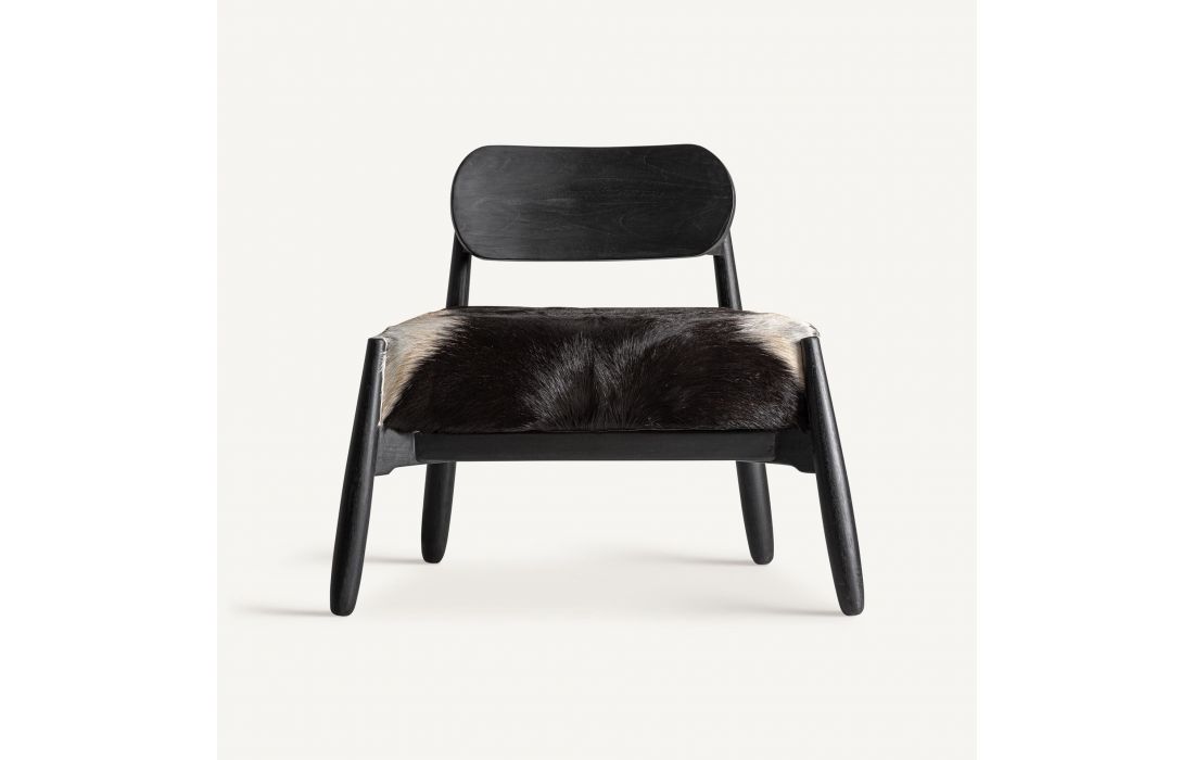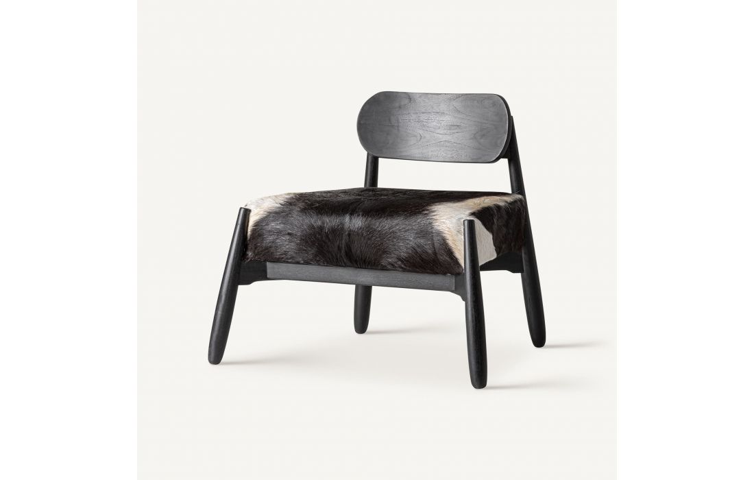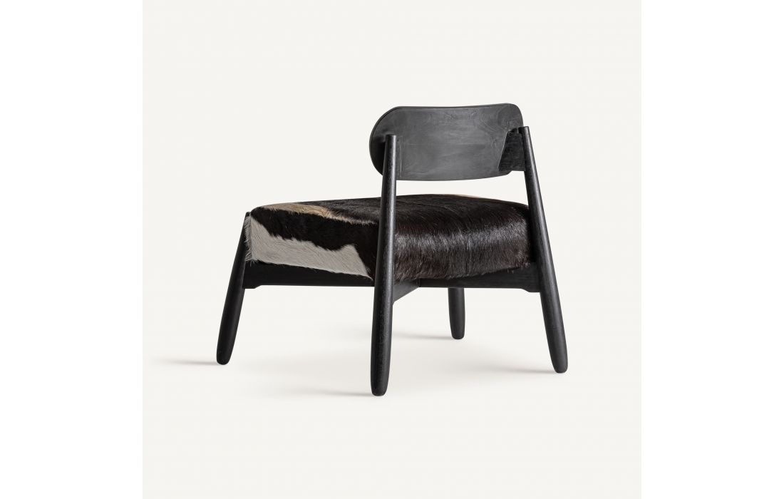 This armchair combines contemporary design and comfort in a piece with a strong aesthetic presence.Its teak wood frame with a black finish is complemented by a leather seat, creating an elegant and sophisticated contrast.