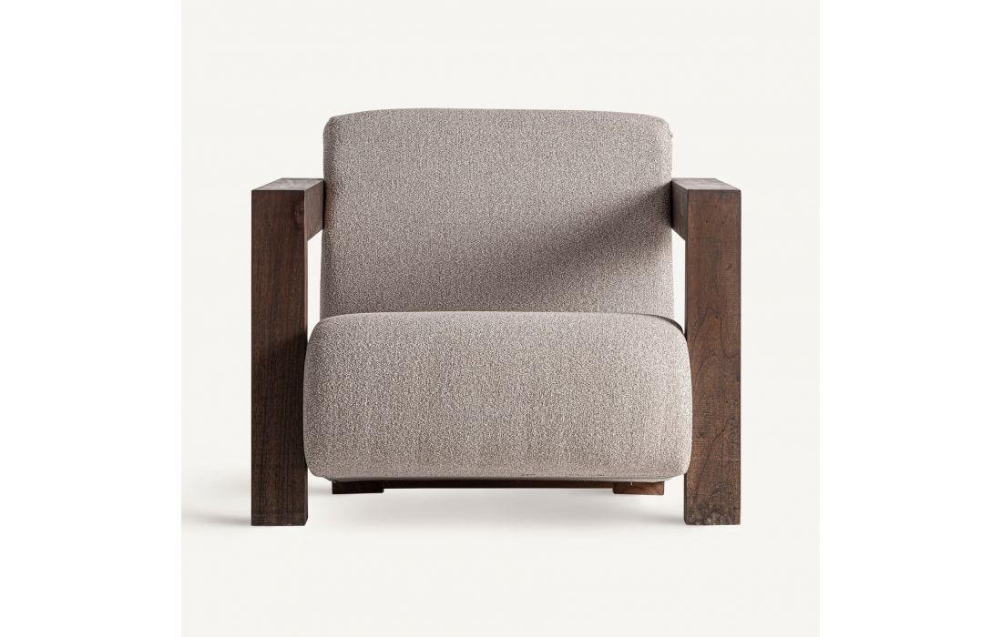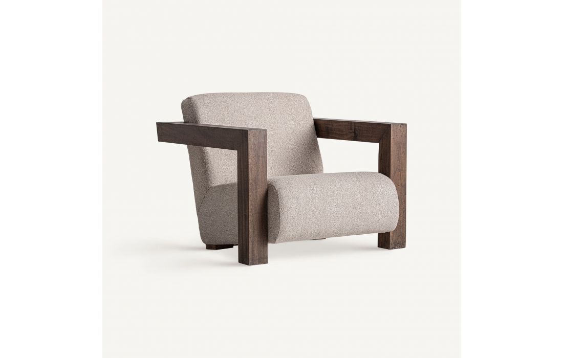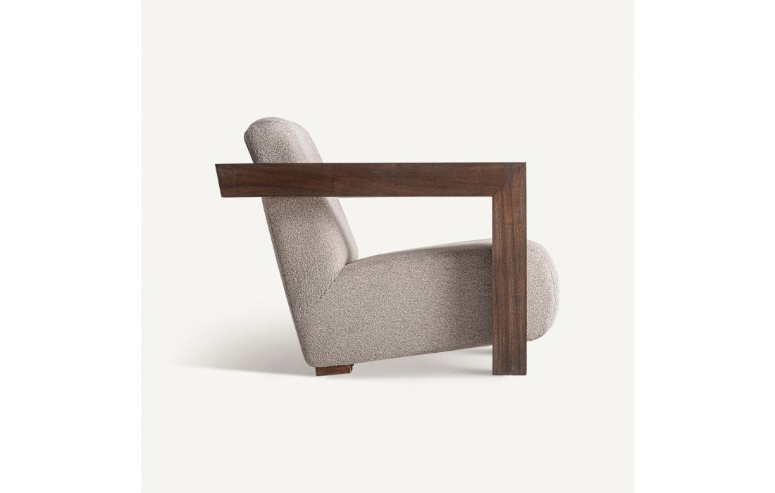 Mindi wooden armchair with a robust structure and striking geometric lines.Upholstered in soft-touch fabric, it offers comfort and elegance.Ideal for contemporary environments, combining sophisticated design and functionality.