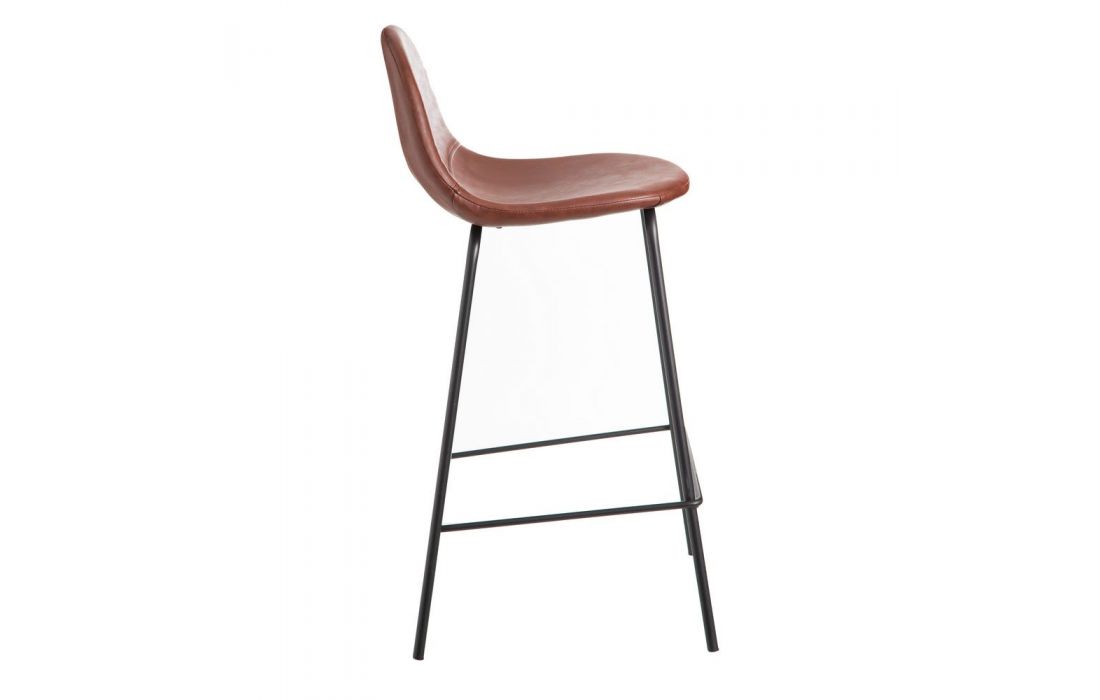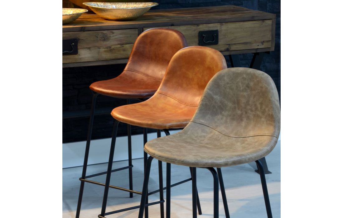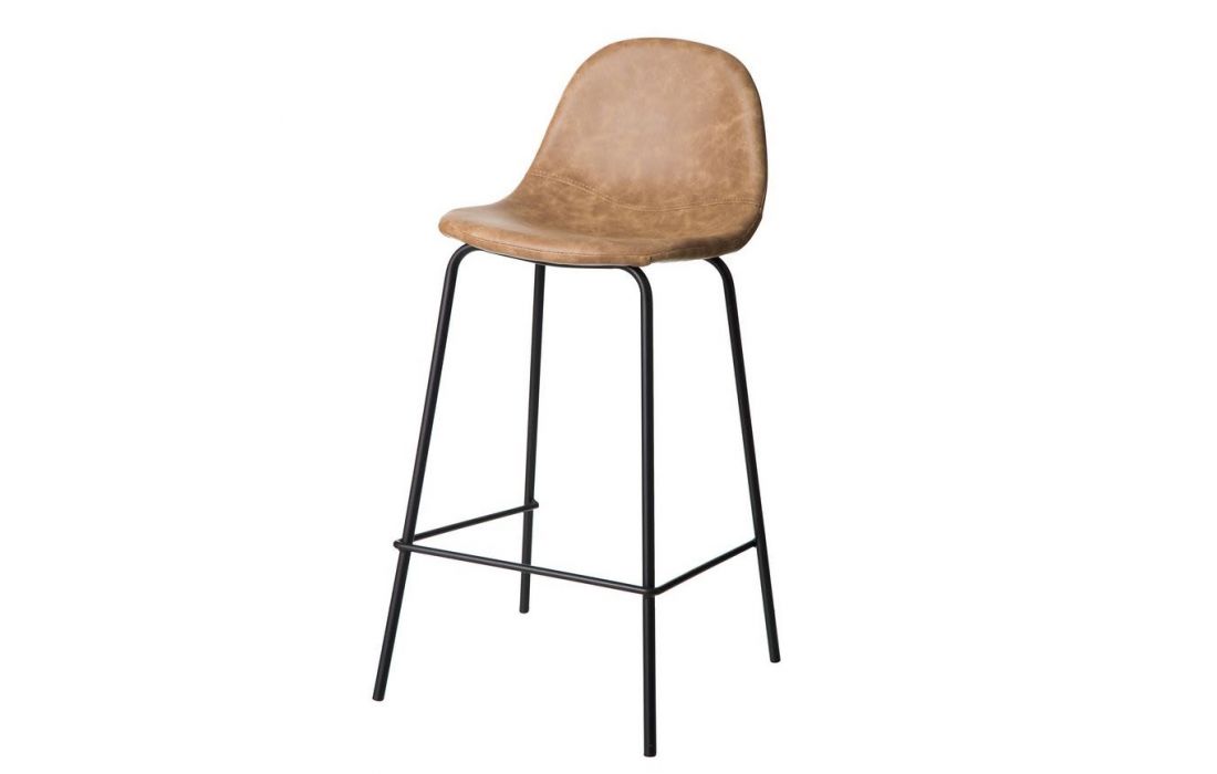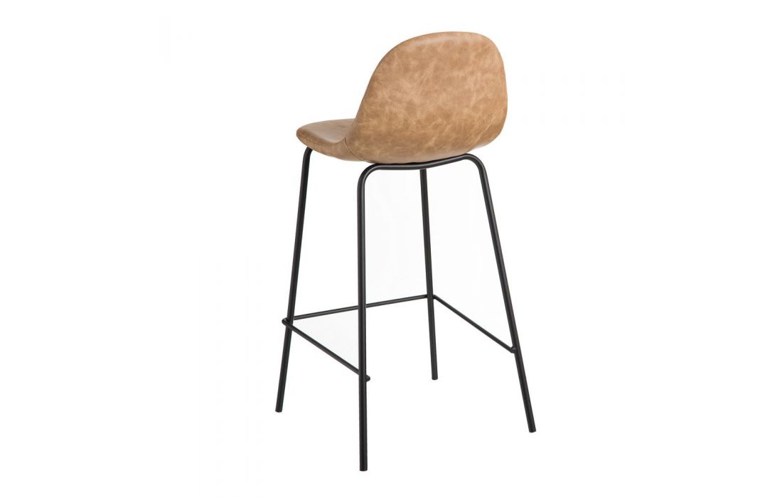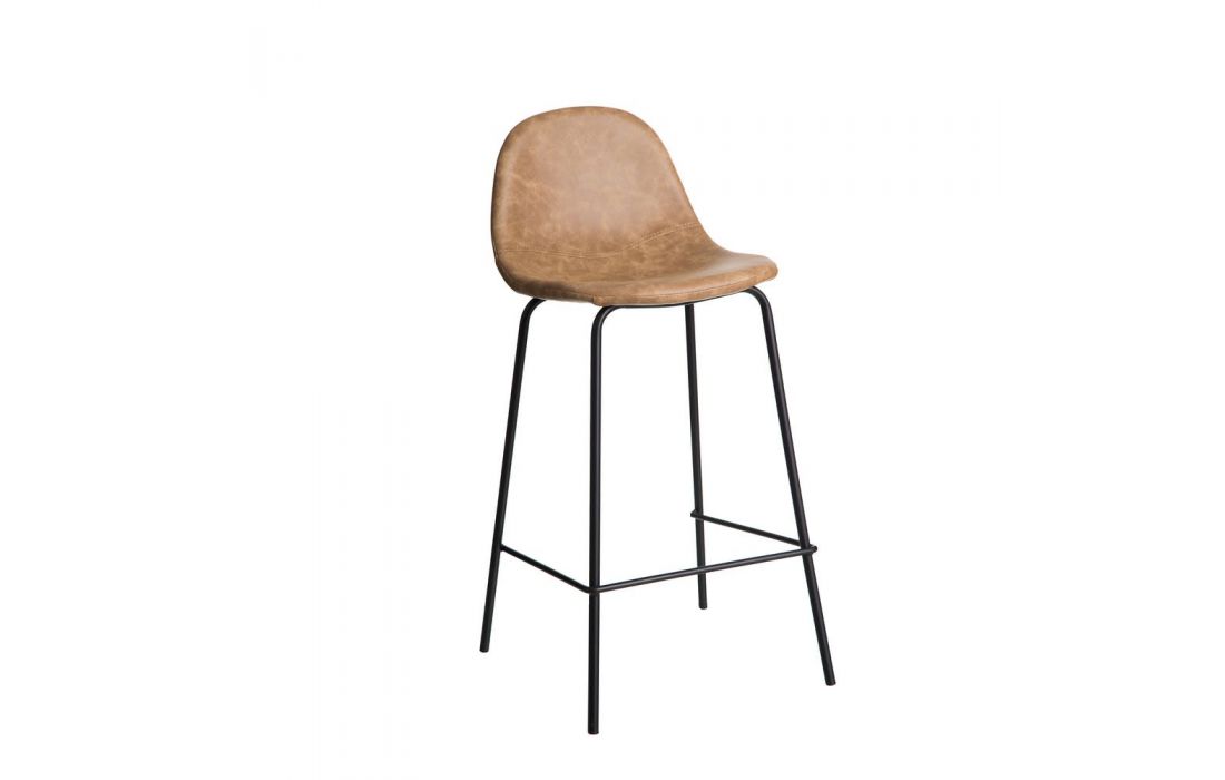 Bar stool with upholstered in synthetic leather with 3 colors available, camel, brown, light brown with black steel feet.