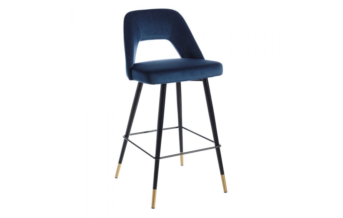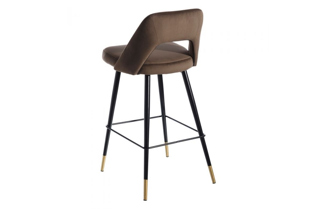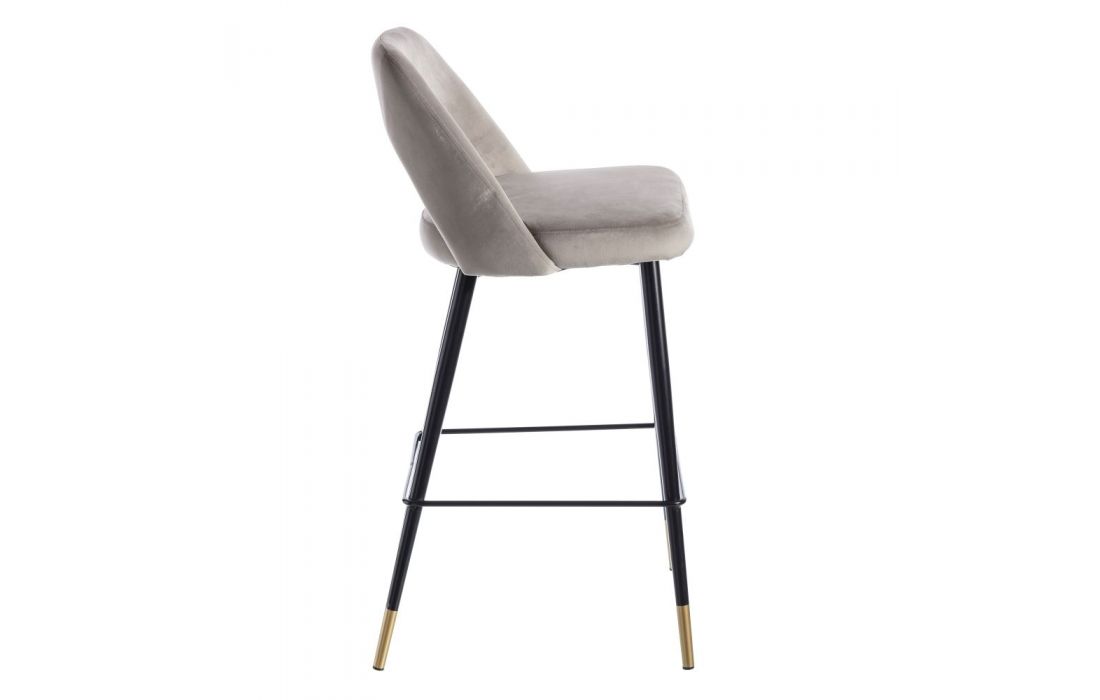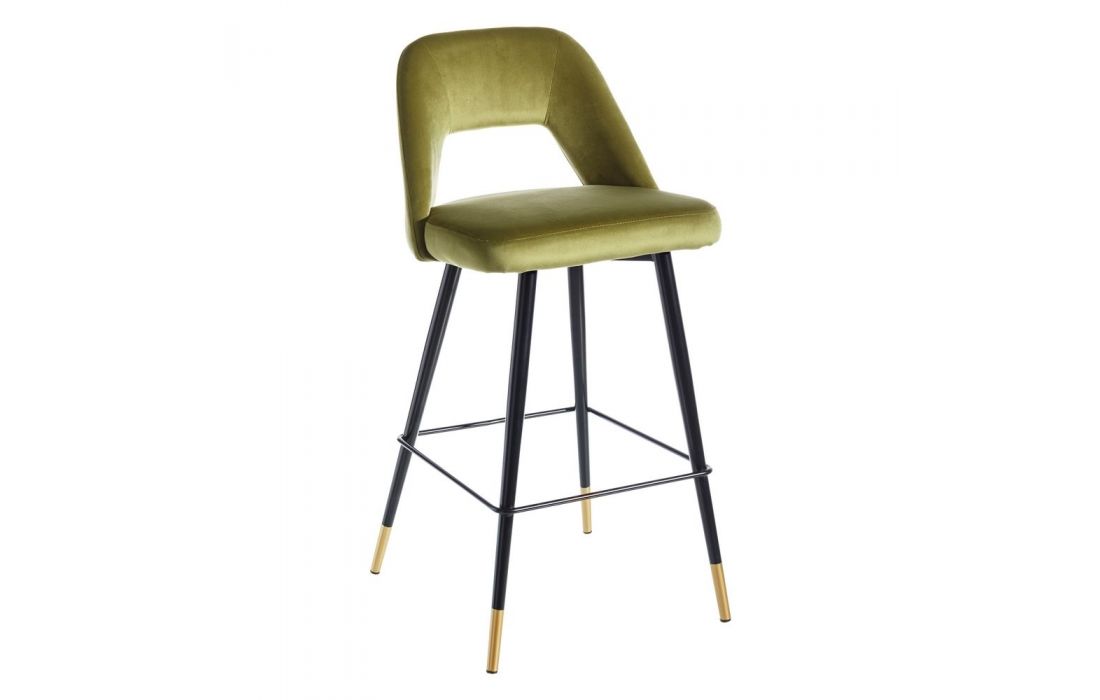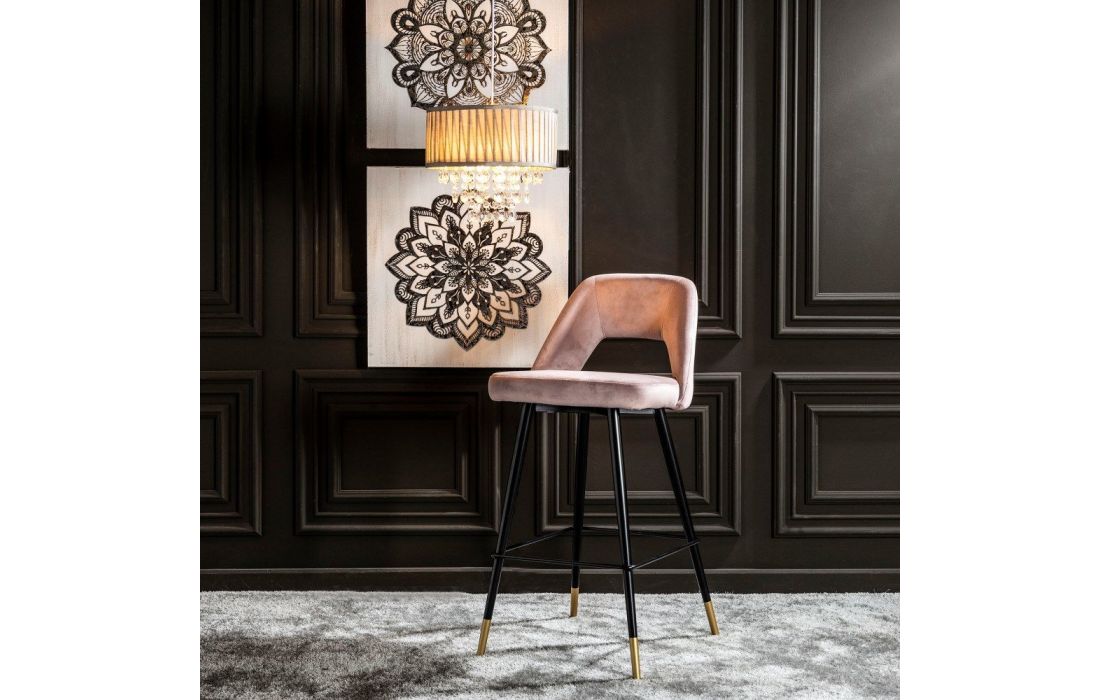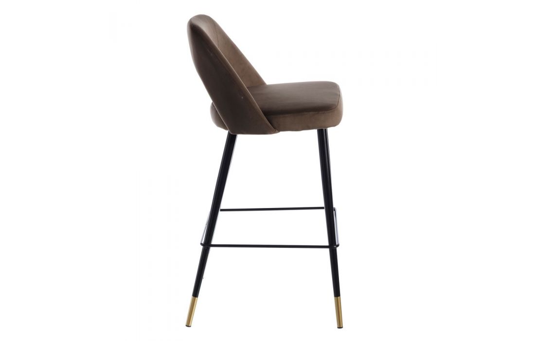 Bar stool with upholstery in fabric with 5 colors available, grey, blue, green, pink and brown, with black steel feet.