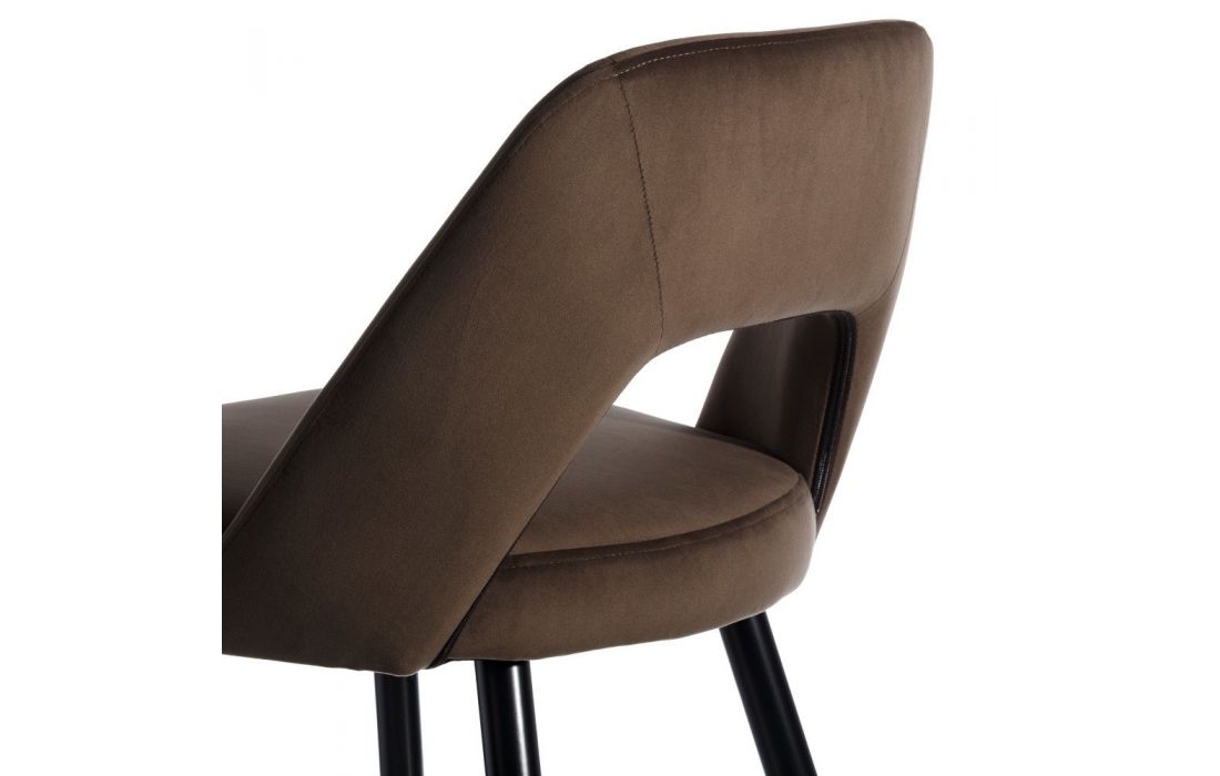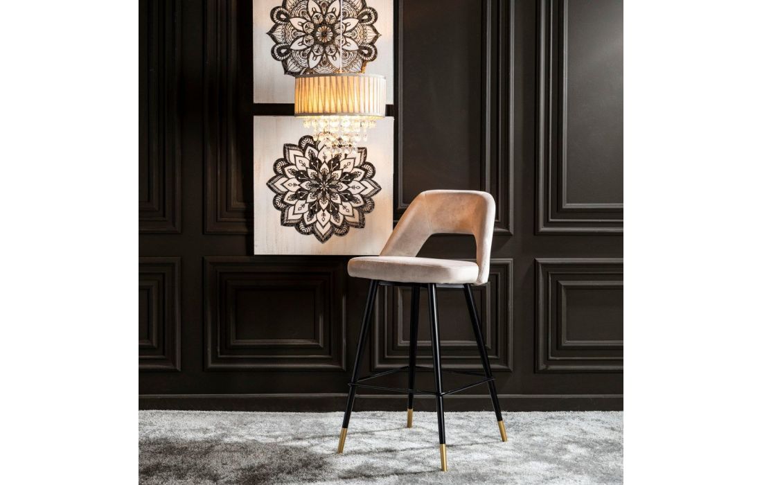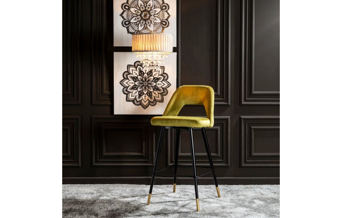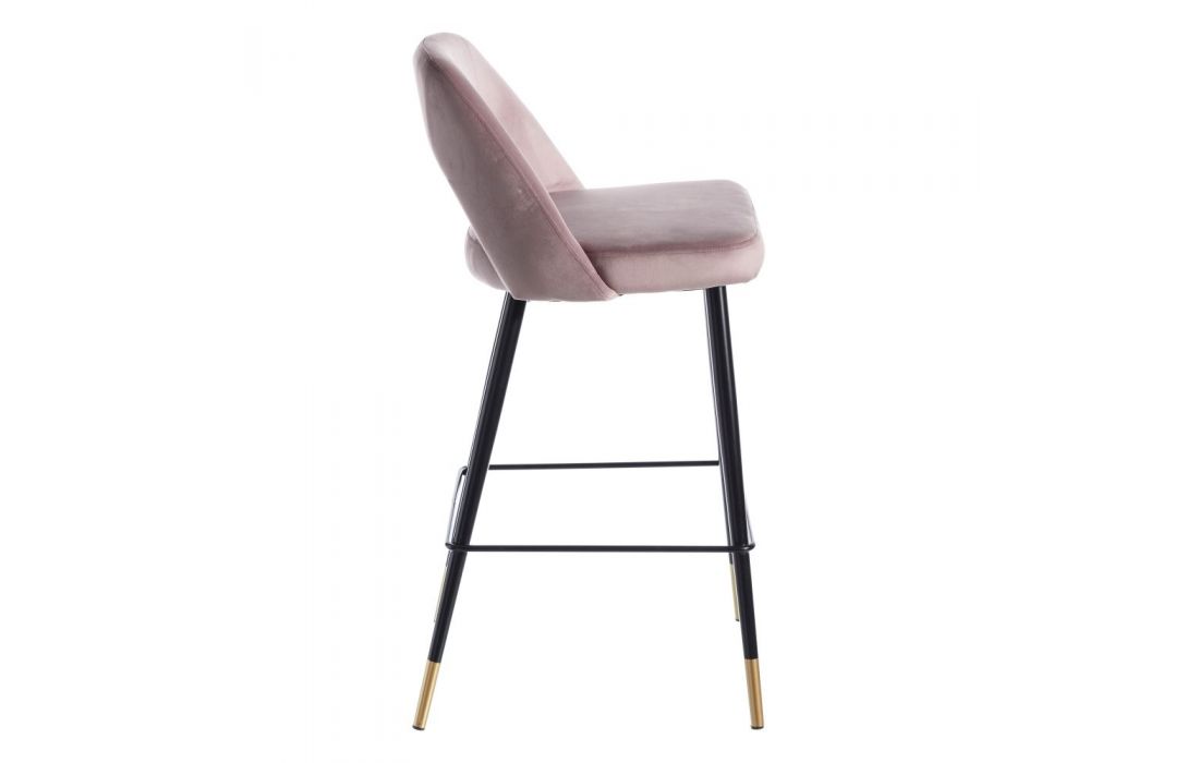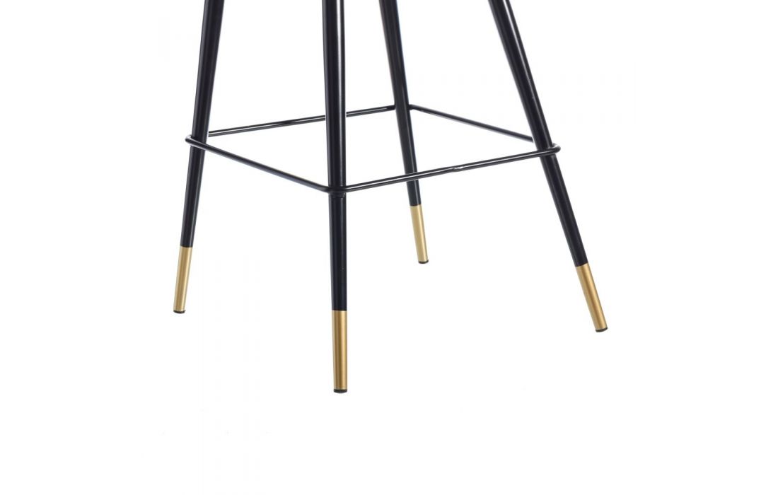 Bar stool with upholstery in fabric with 5 colors available, grey, blue, green, pink and brown, with black steel feet.