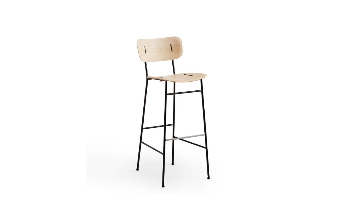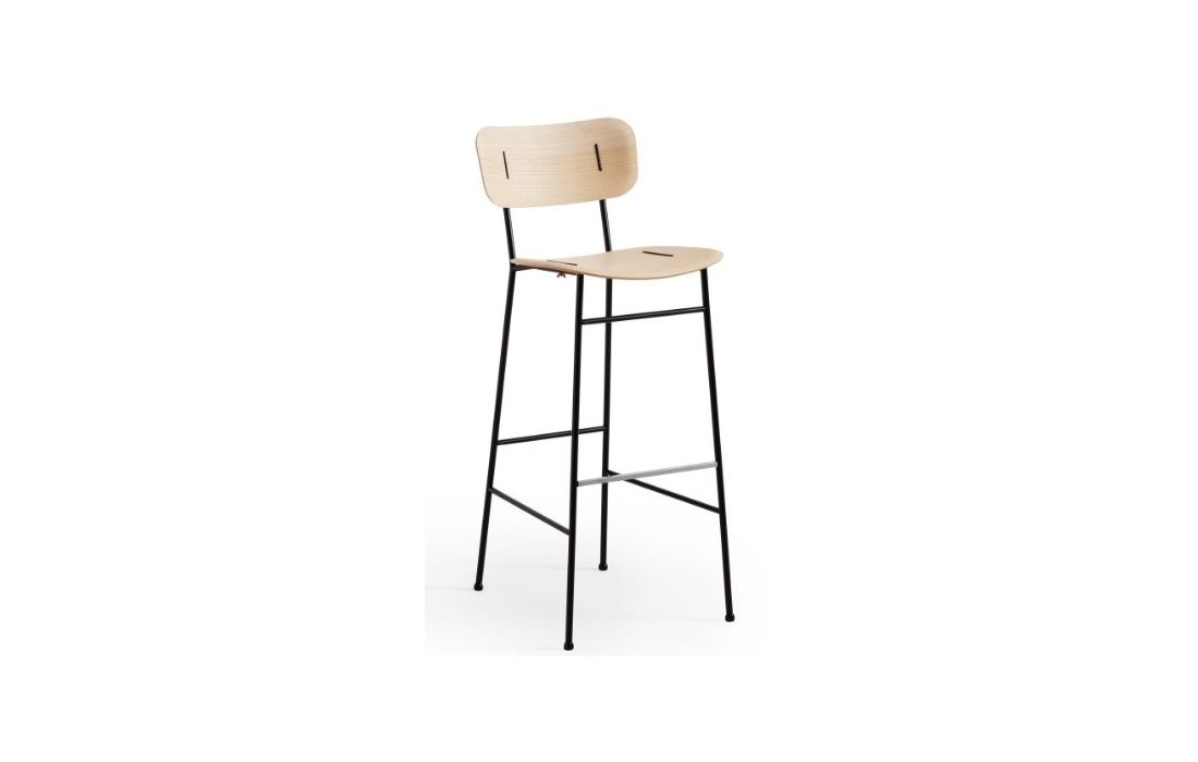 Stool bar with four-legged metal base. Seat and backrest in ash, walnut or oak veneered wood with metal inserts in the same color as the structure, wing nuts in black metal.Recipient :