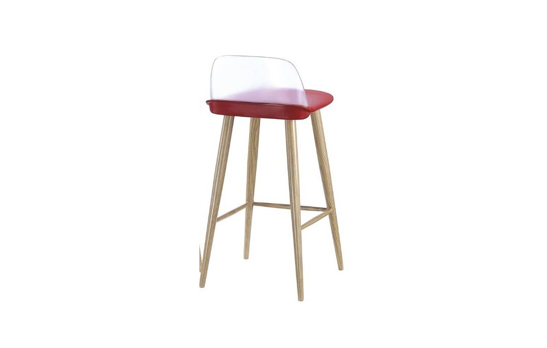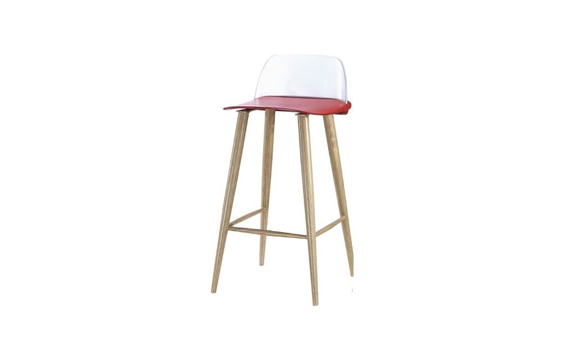 Barstool with metal structure, epoxy wood color finish, seat in red polypropylene and transparent polycarbonate.