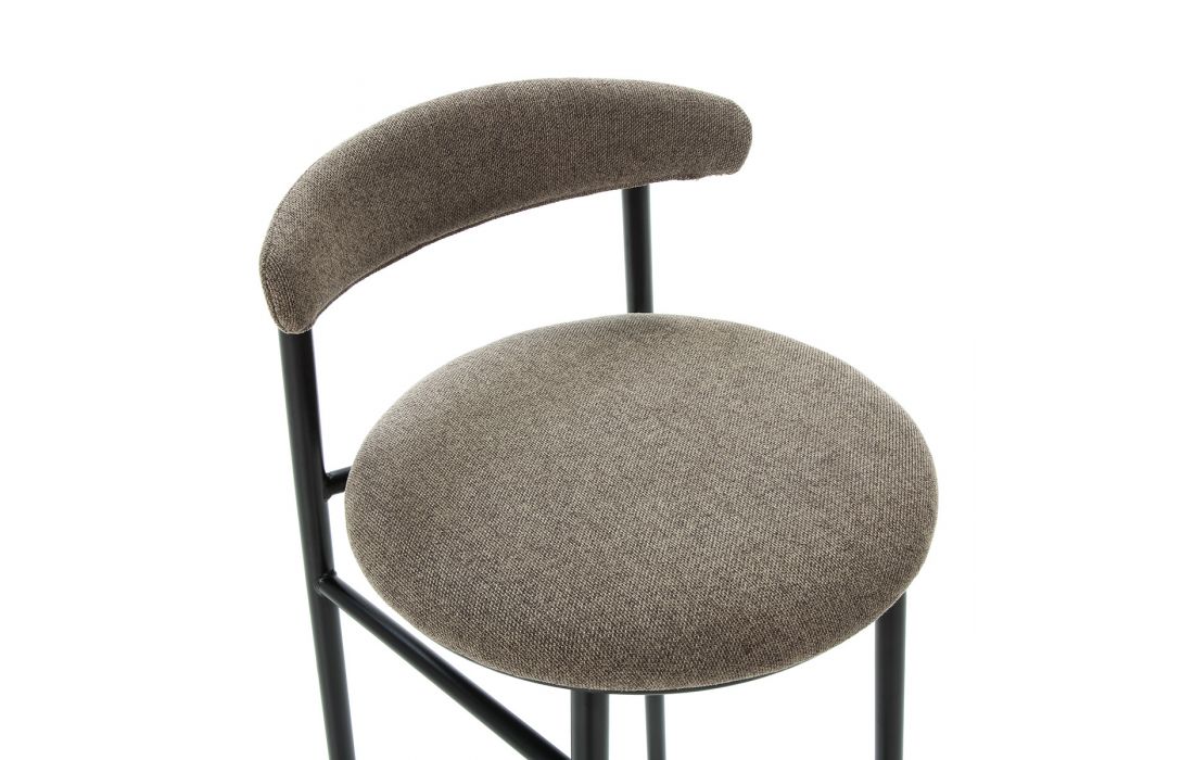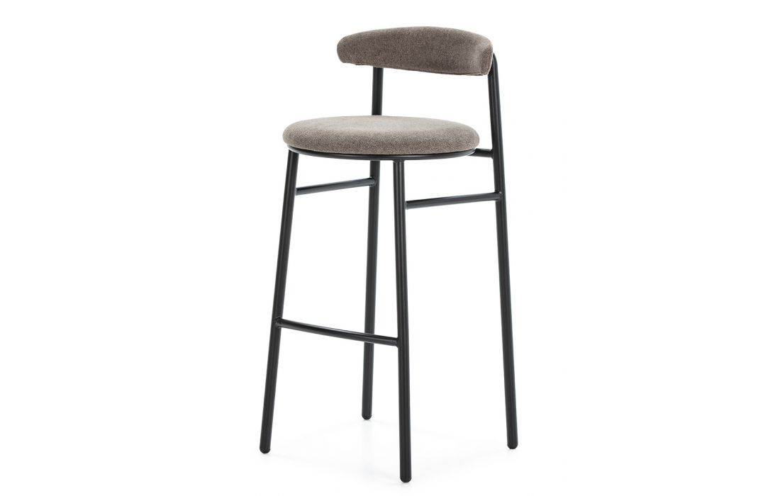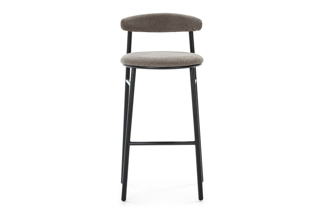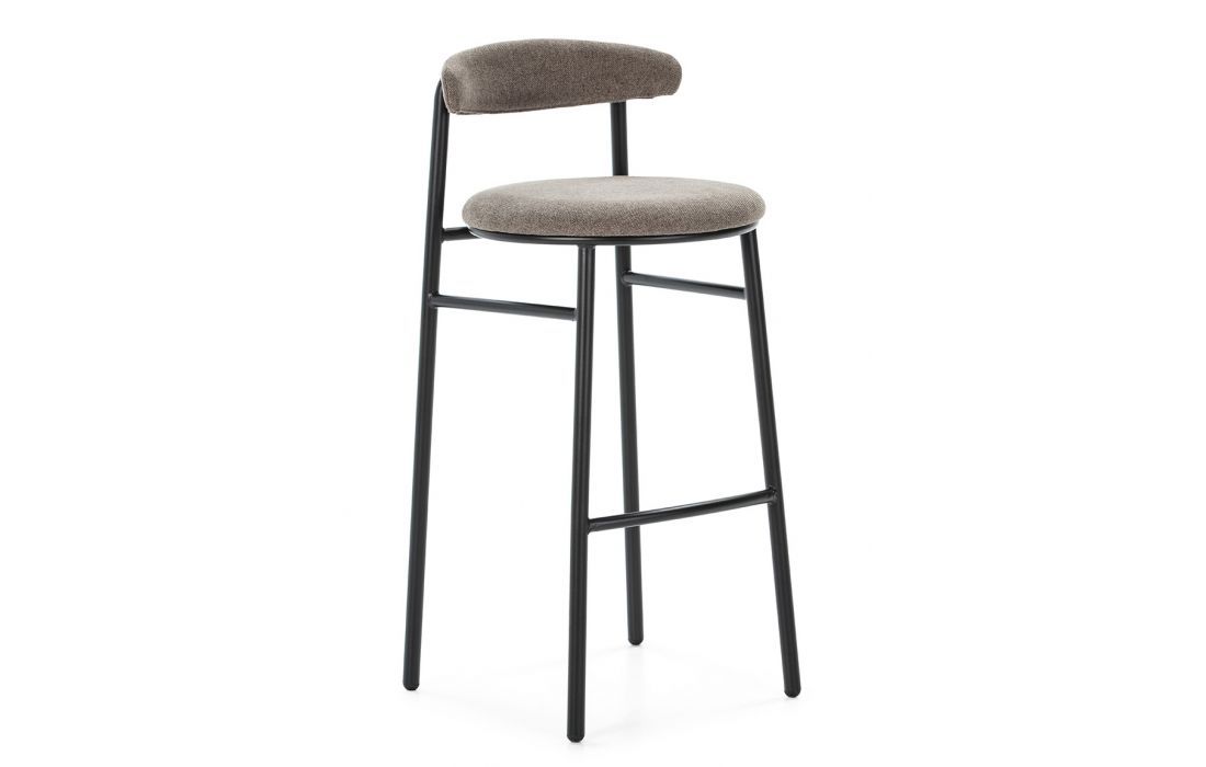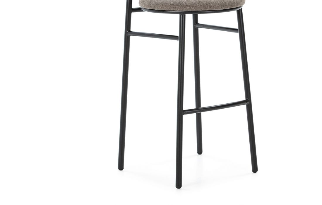 Bar stool with black metal frame and seat upholstered in gray fabric