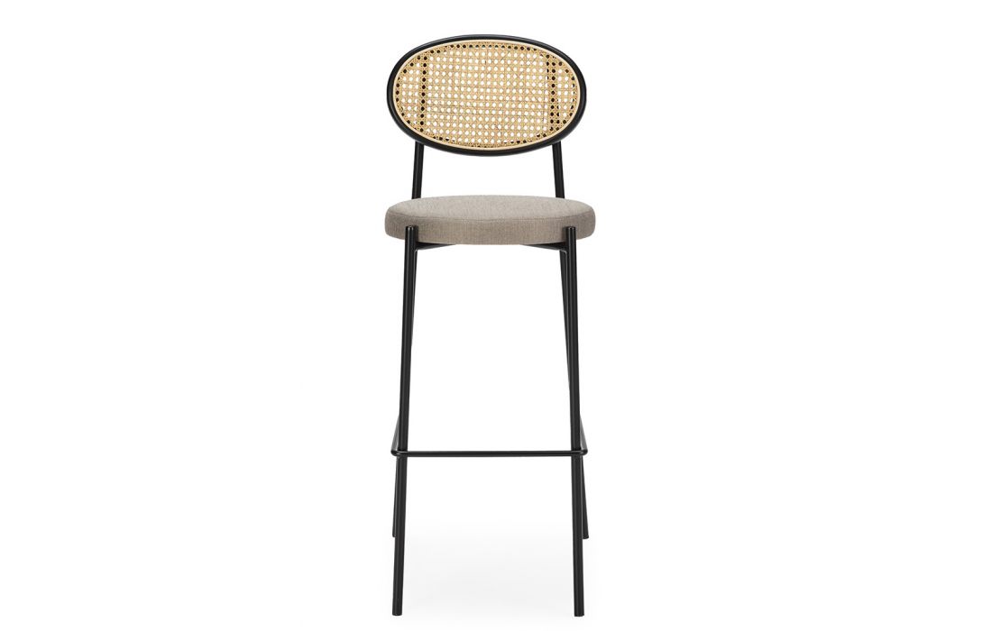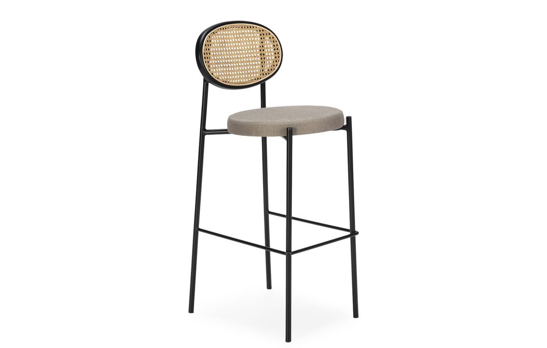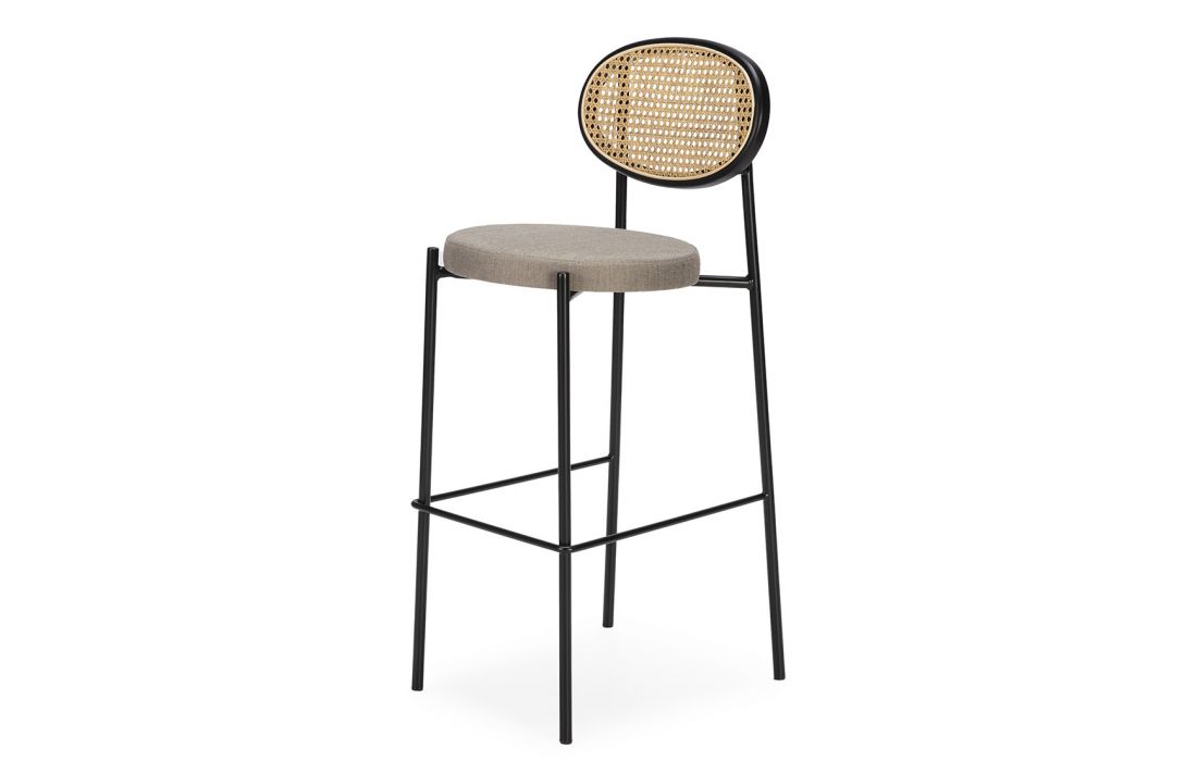 Bar stool with black metal structure, gray fabric seat and natural straw back