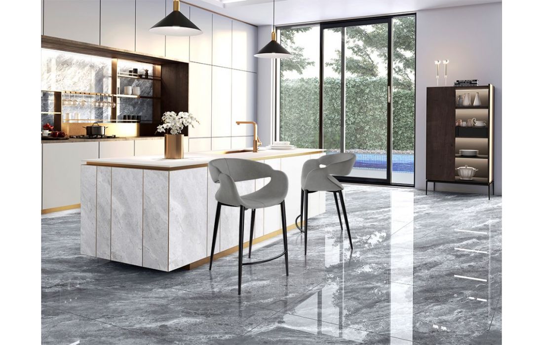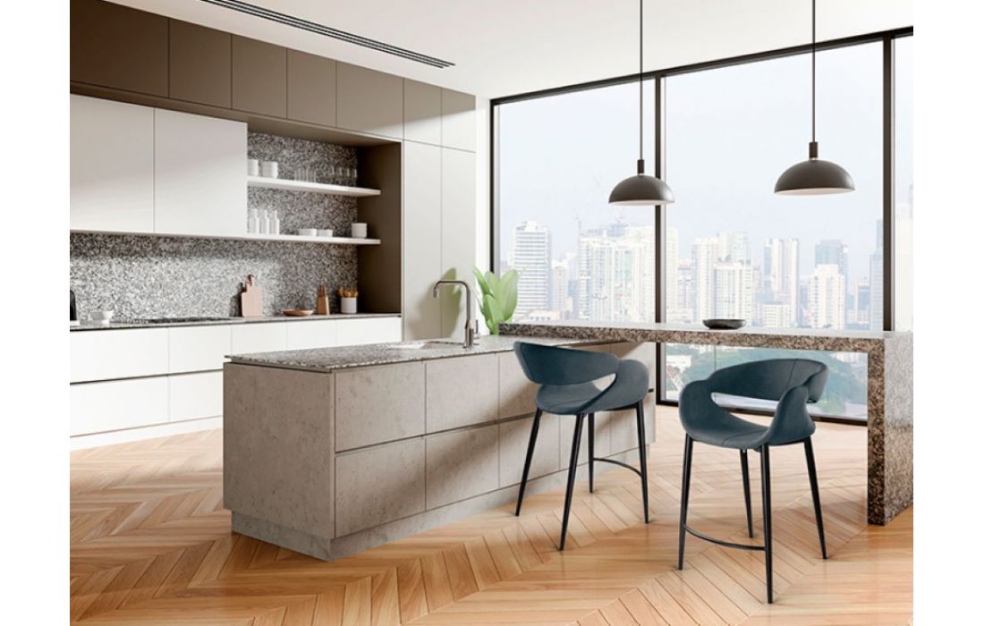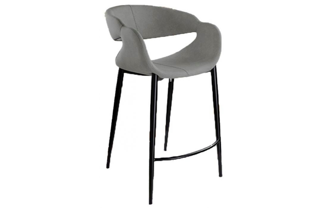 Bar stool upholstered in fabric with decorative stitching, metal legs in matte black finish with footrestRecipient :