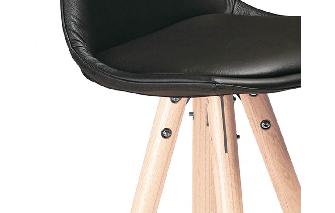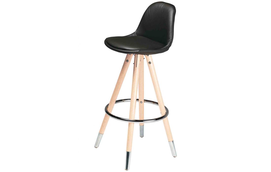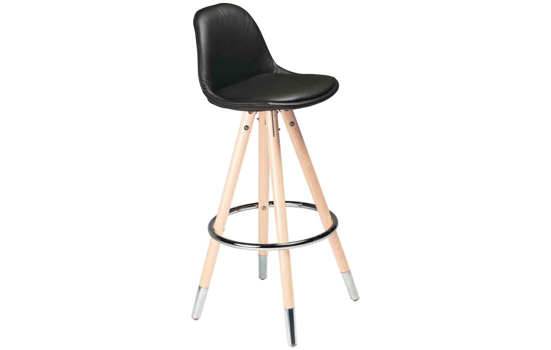 BarStool in solid oak wood with upholstered in light brown or black synthetic leather and legs with metal detail and covers