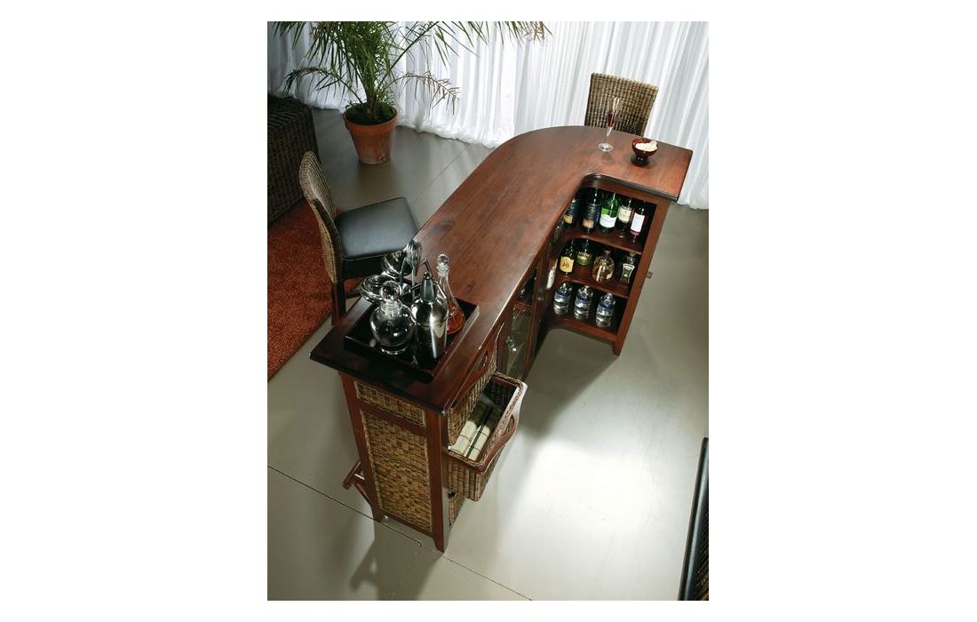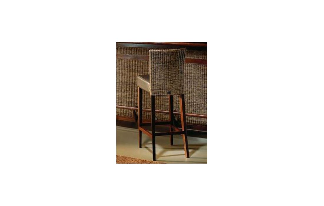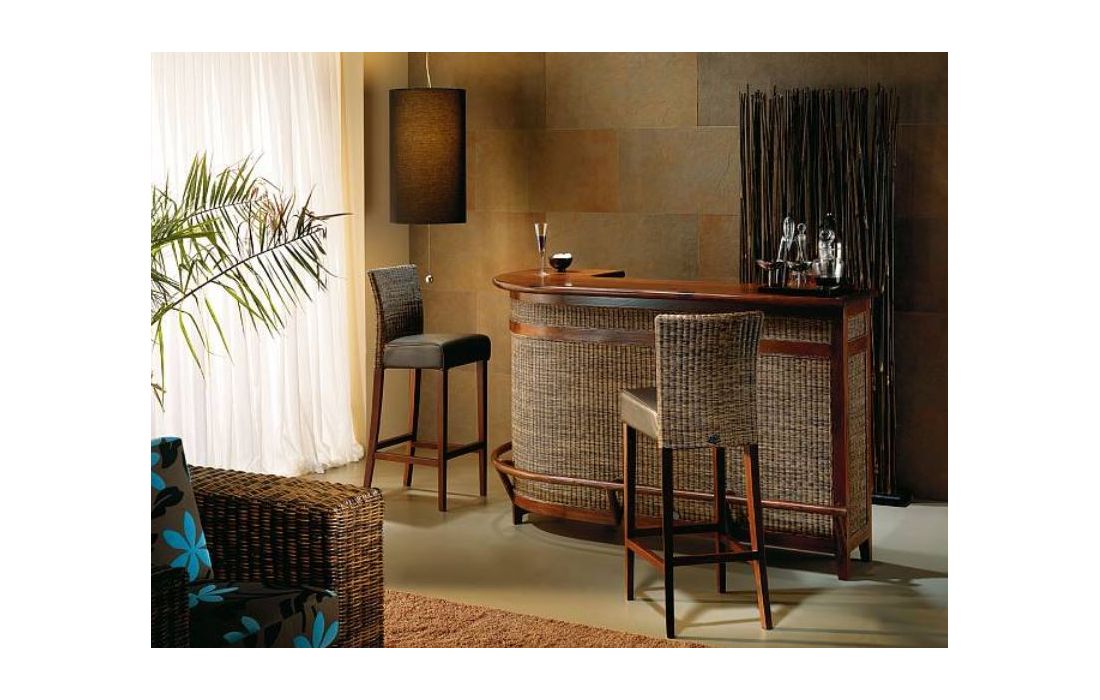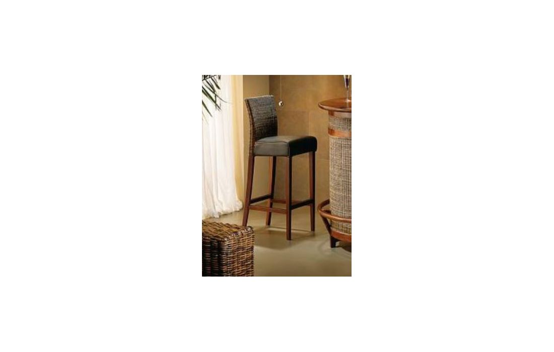 Barstool with wooden structure, rattan coast and seat in synthetic leather.