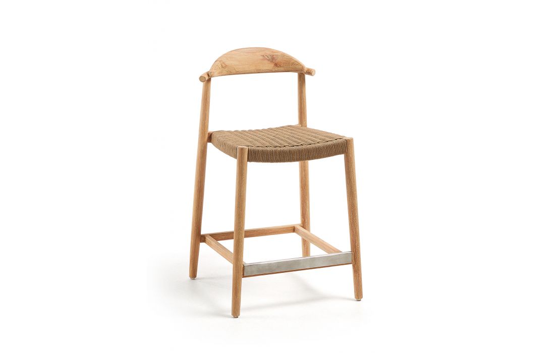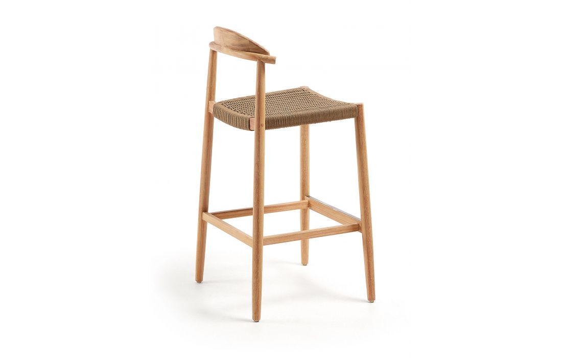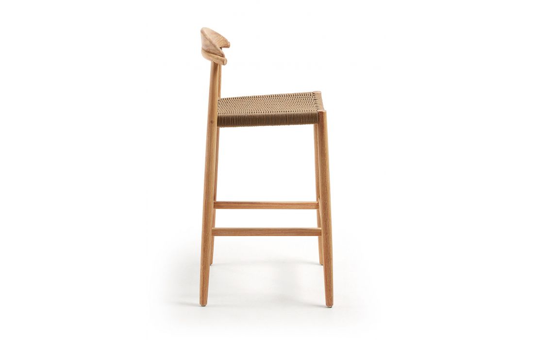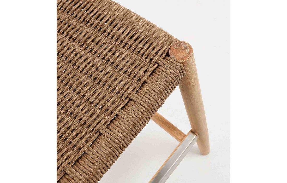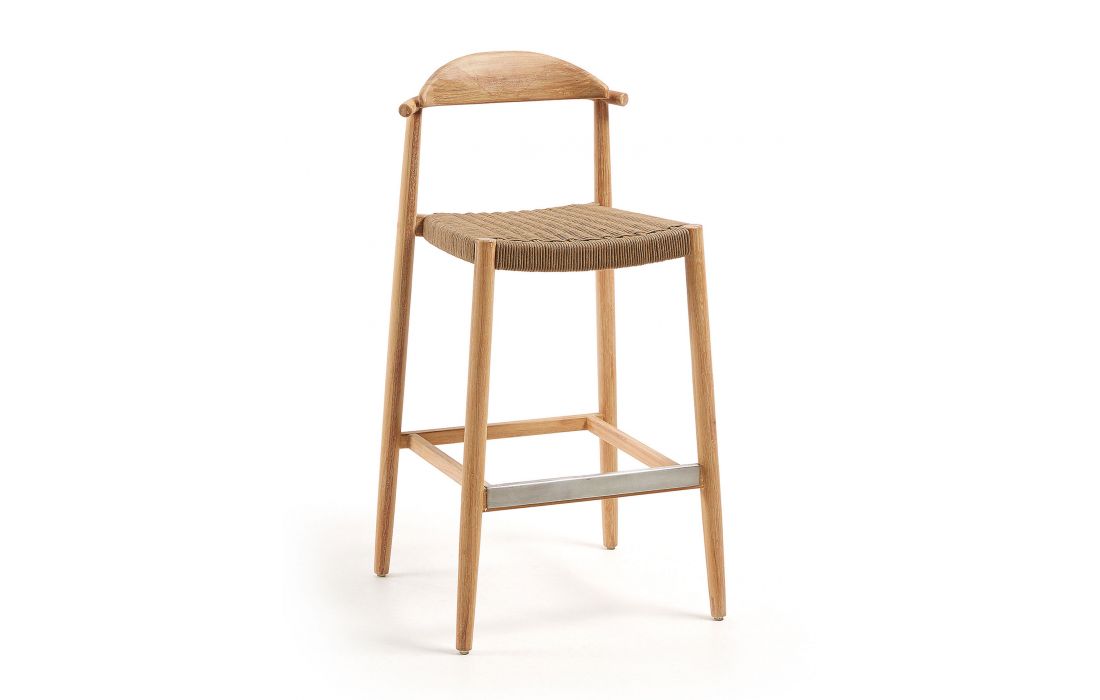 Bar stool with seat height of 62 cm or 77 cm in solid eucalyptus wood with natural finish, varnished with 4 layers for long durability and protection. Rugged polyester rope seat. Stackable. For indoor and outdoor use indoors.