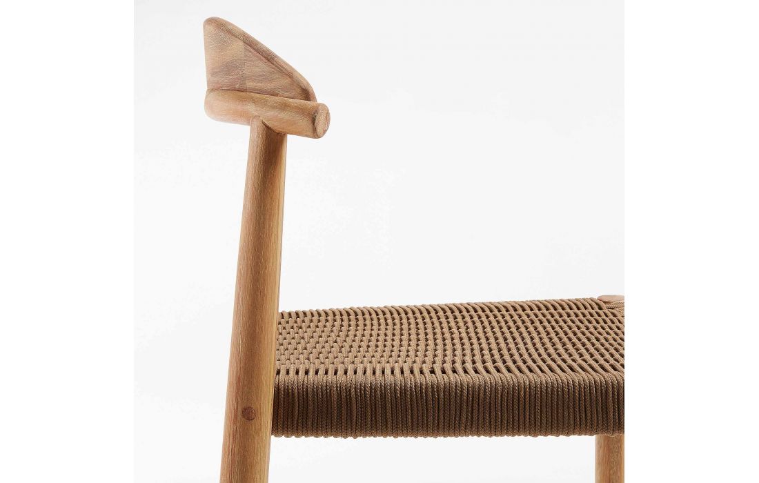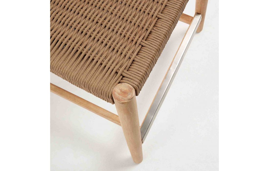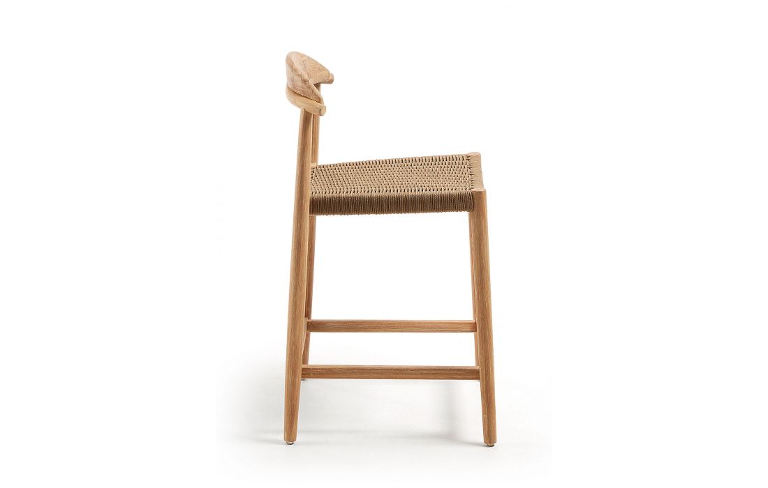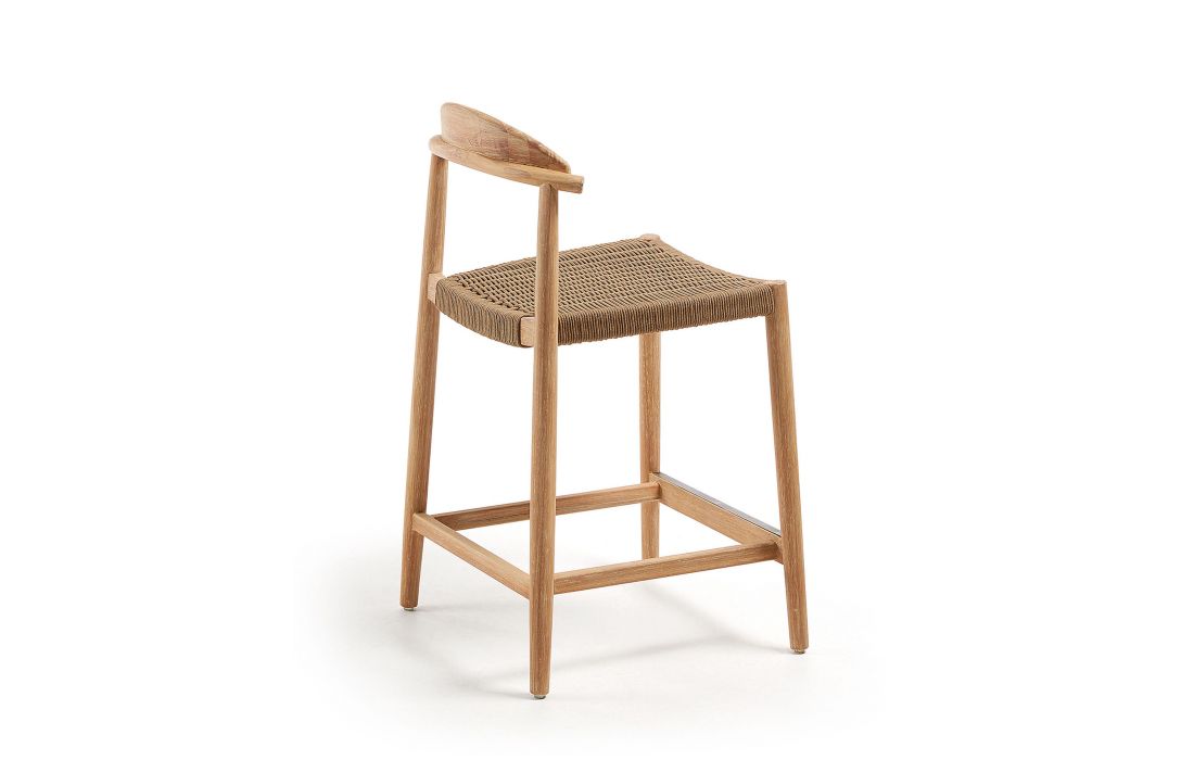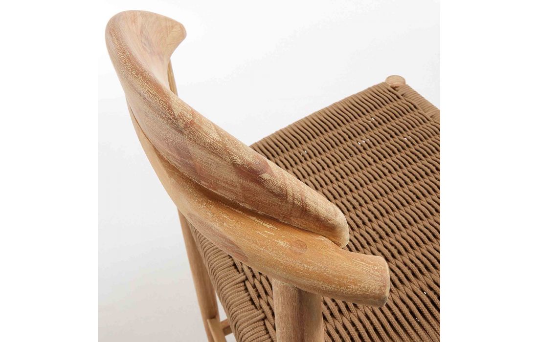 Bar stool with seat height of 62 cm or 77 cm in solid eucalyptus wood with natural finish, varnished with 4 layers for long durability and protection. Rugged polyester rope seat. Stackable. For indoor and outdoor use indoors.