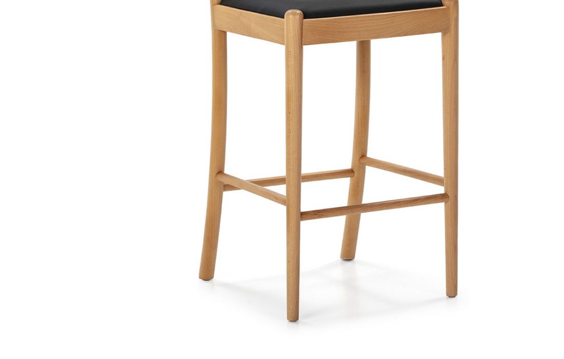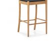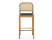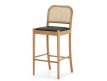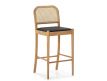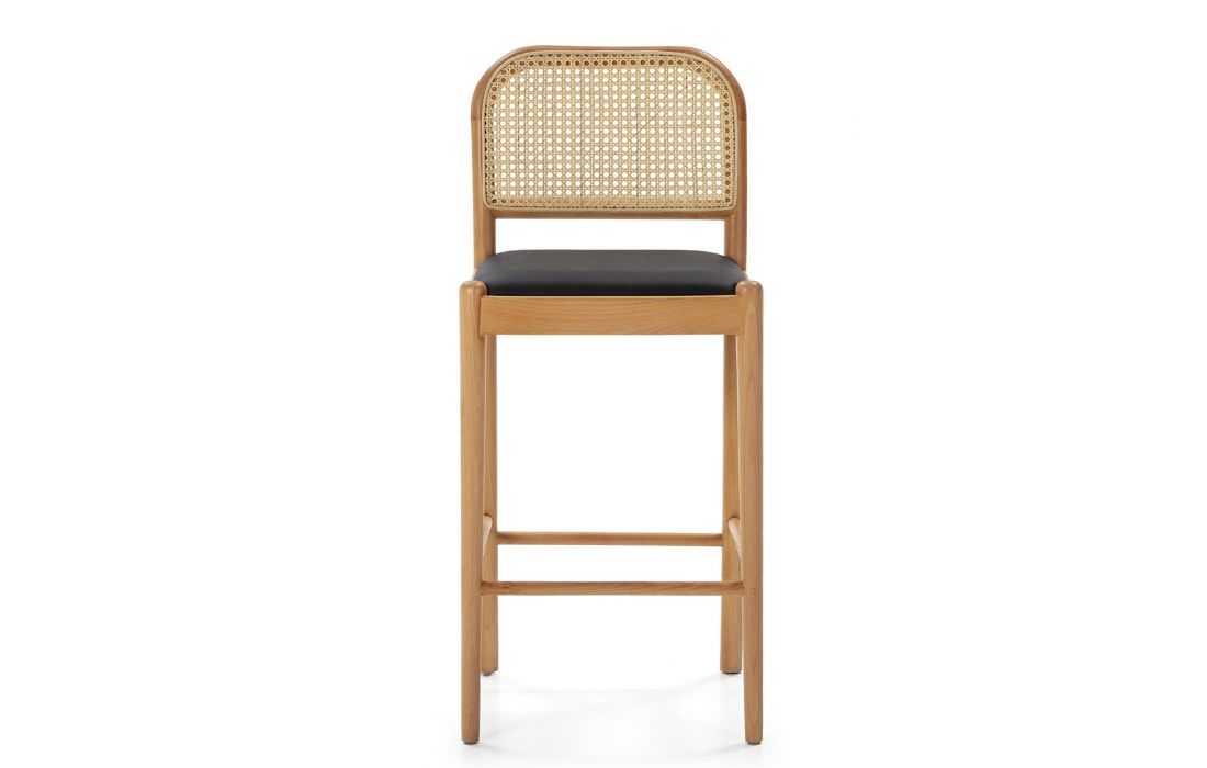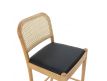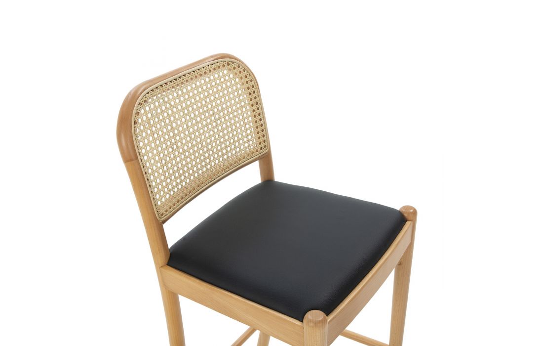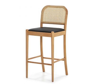Bar stool with wood/natural rattan structure and upholstered seat in black leather