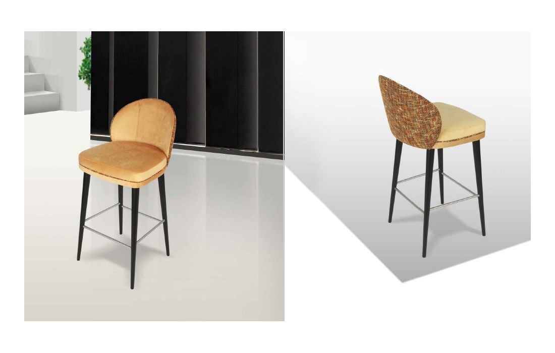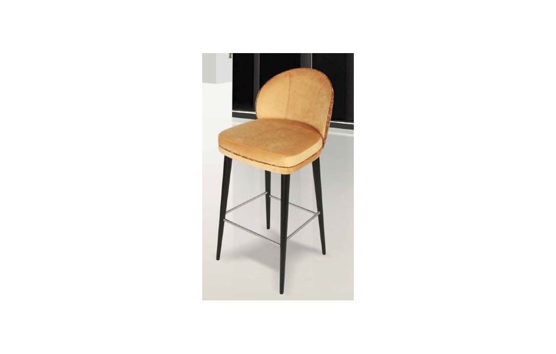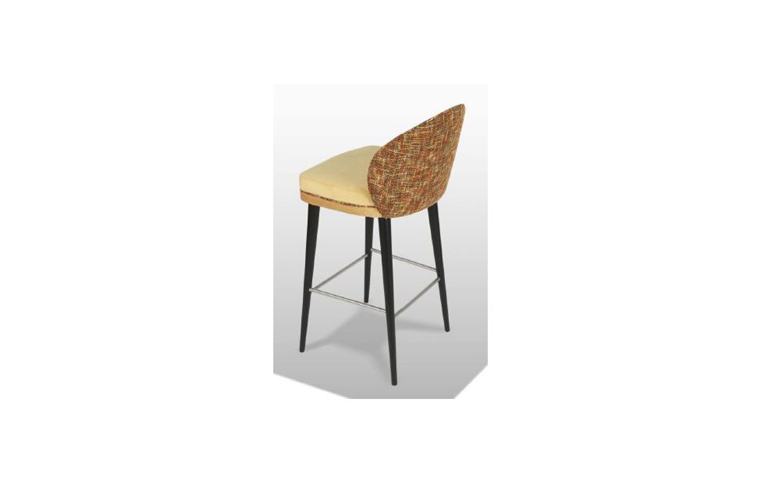 Upholstered bar stool, metal foot rest with solid ash wood feet in the various possible finishes and coatings.