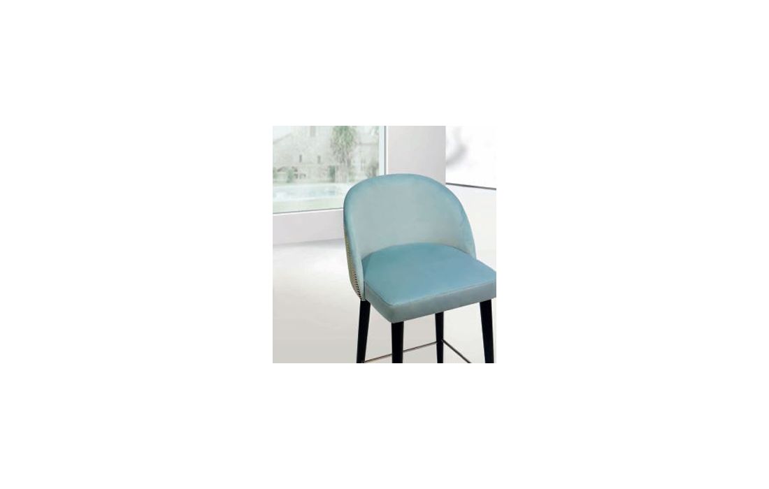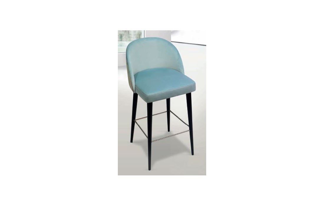 Upholstered bar stool, metal foot rest with solid ash wood feet in the various possible finishes and coatings.