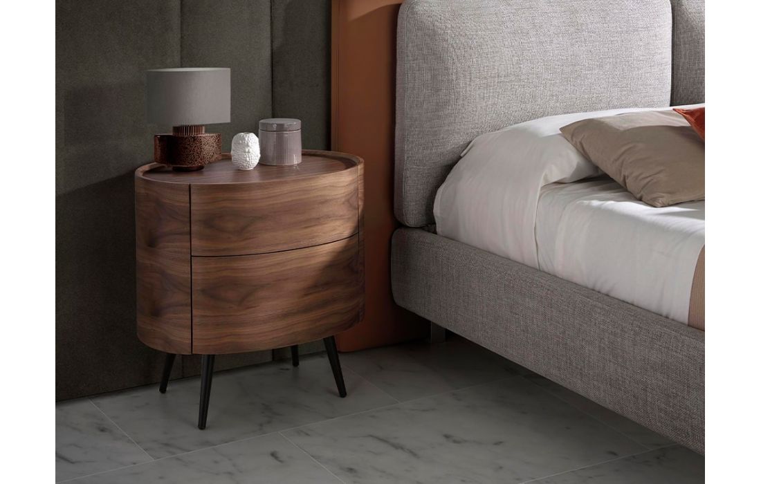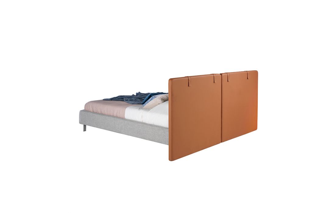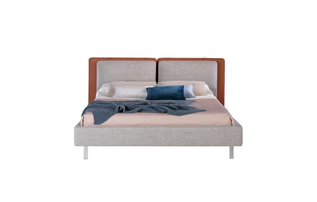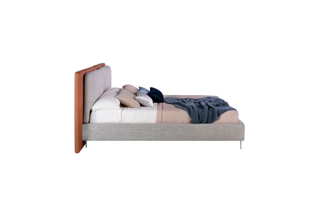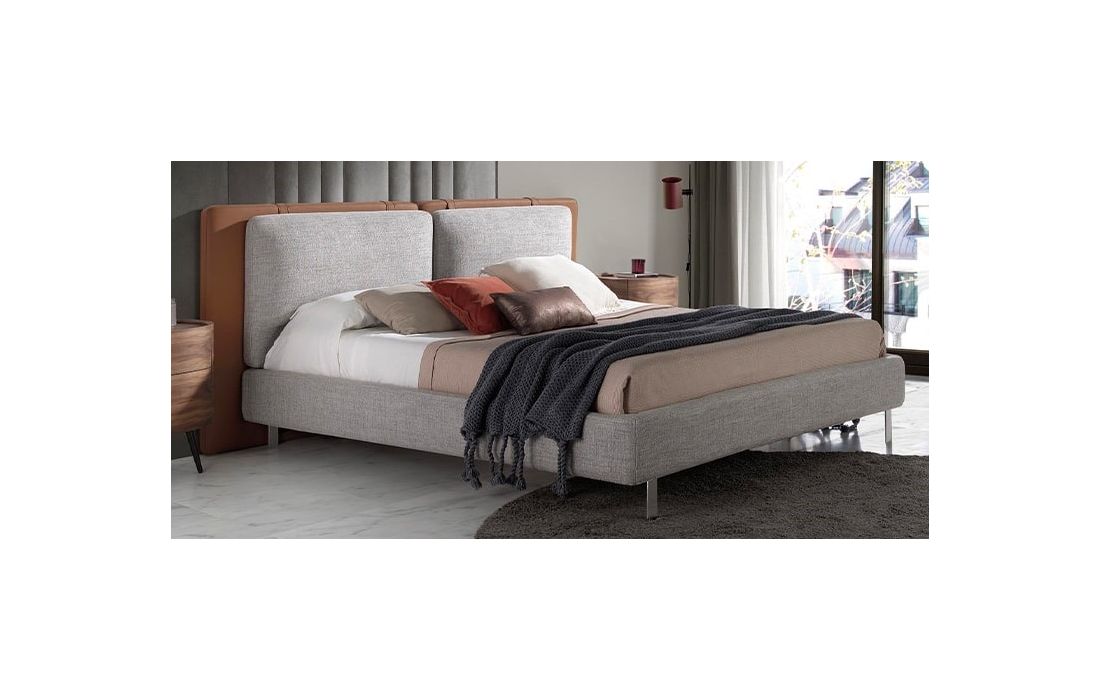 Bed with solid pine wood frame upholstered in fabric and eco-leather with stainless steel legs.