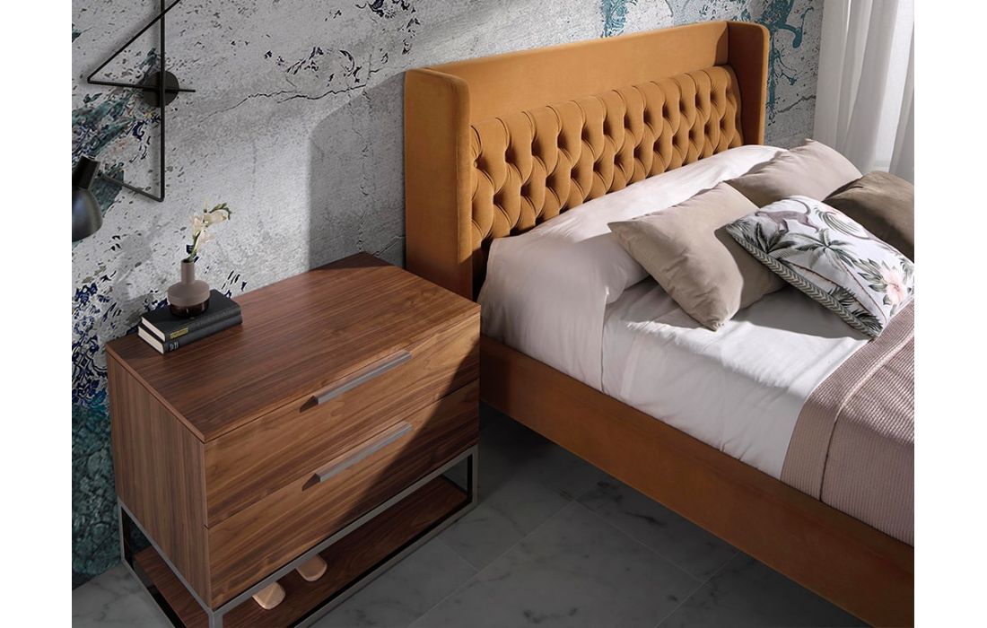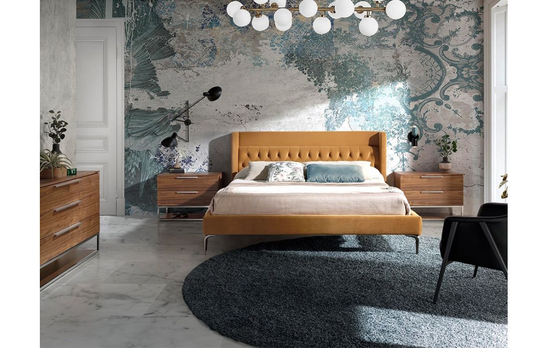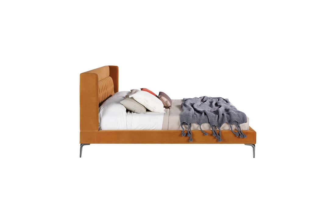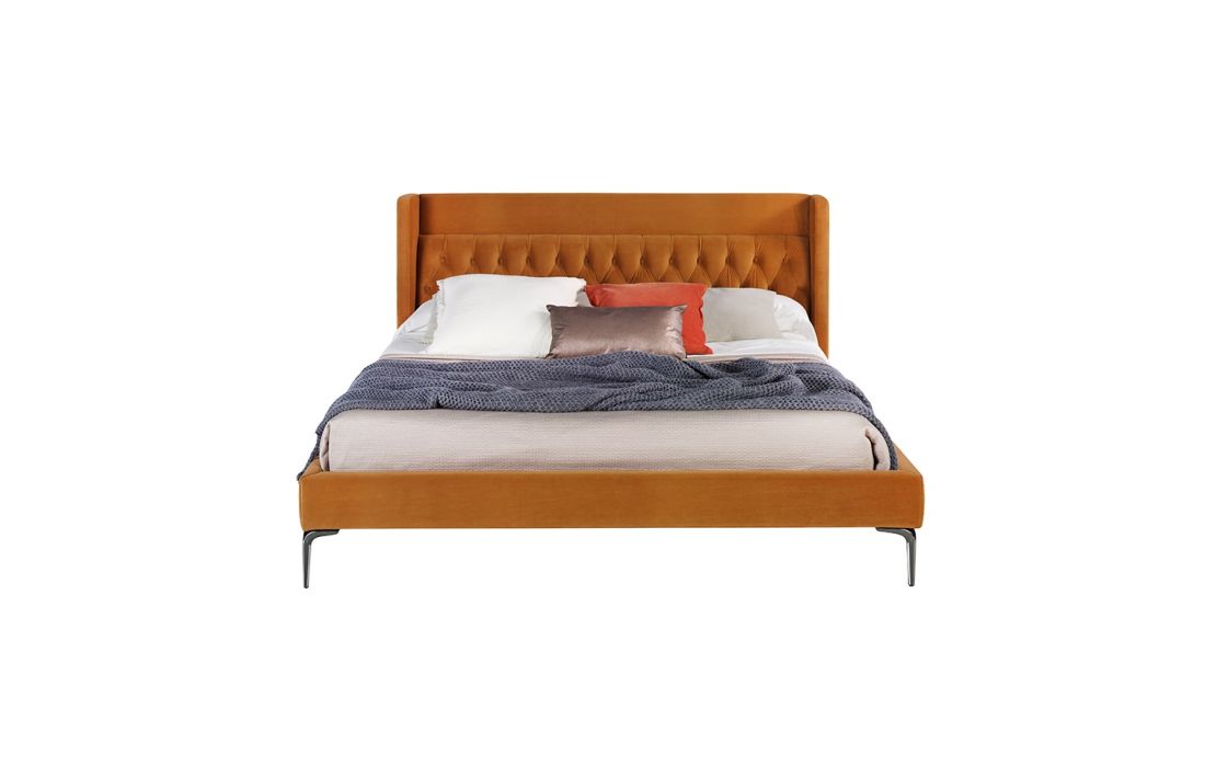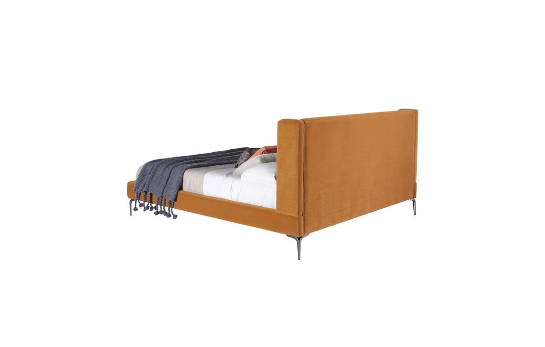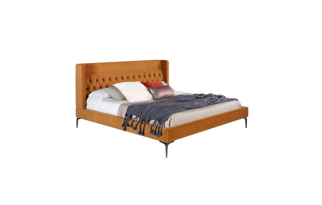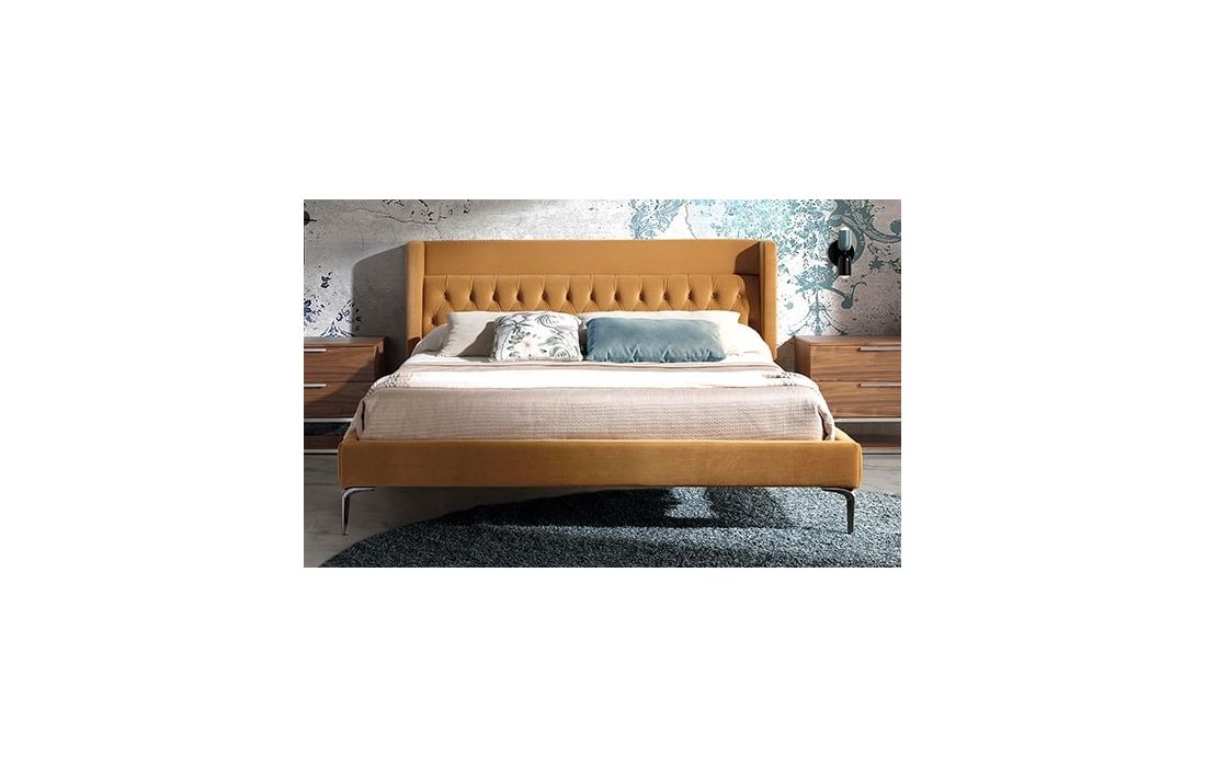 Bed upholstered in mustard-coloured velvet quilted fabric and polished steel foot.