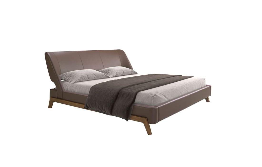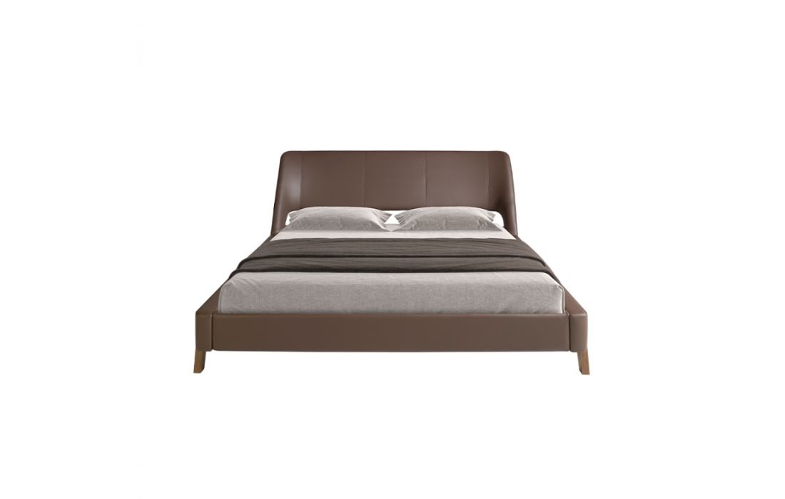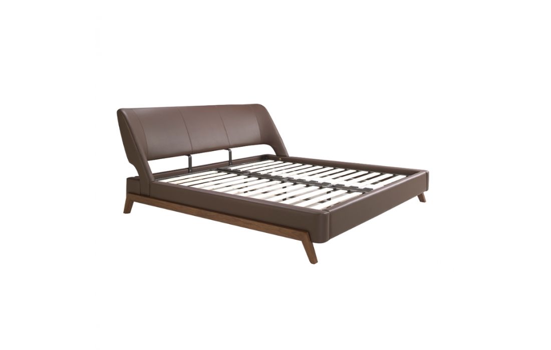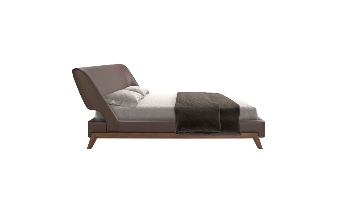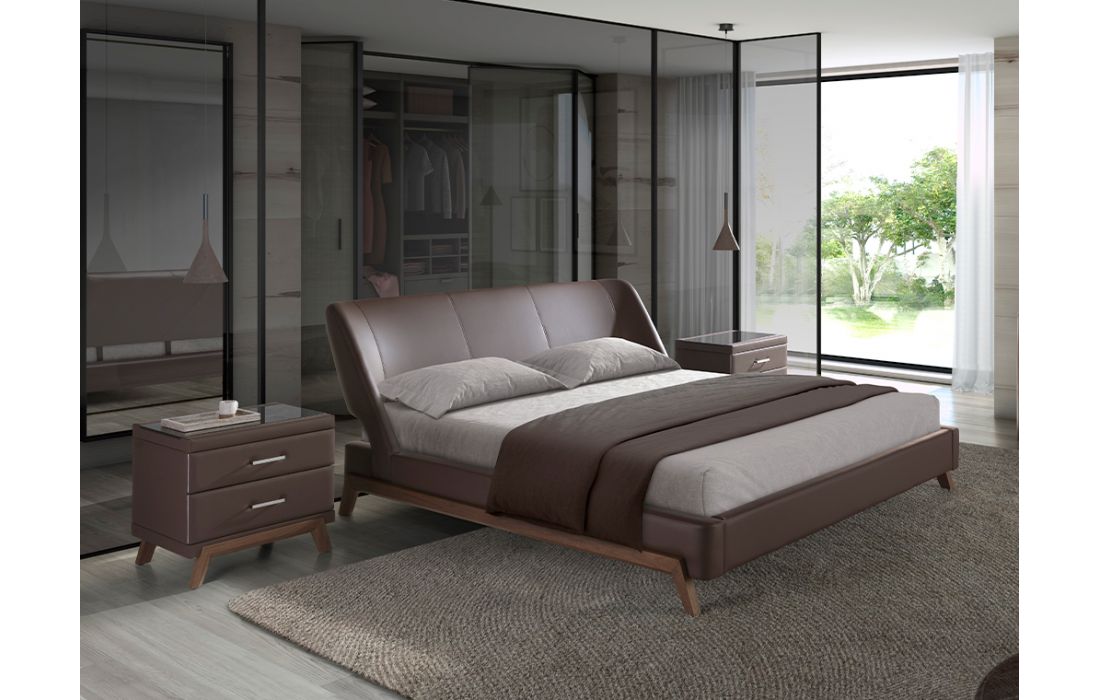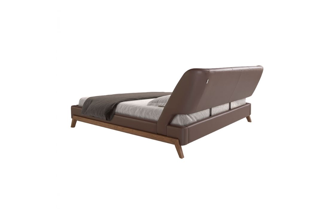 Double bed with headboard and structure in chocolate brown synthetic leather and legs in natural walnut veneered wood.Recipient :
