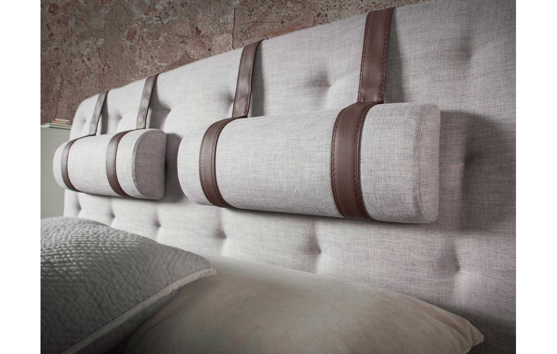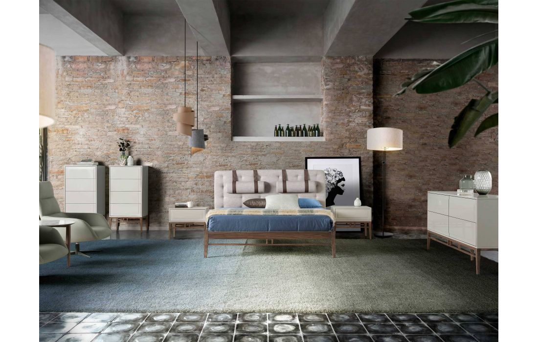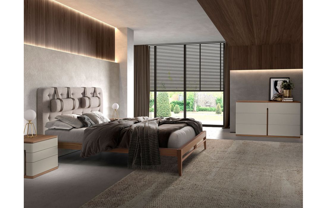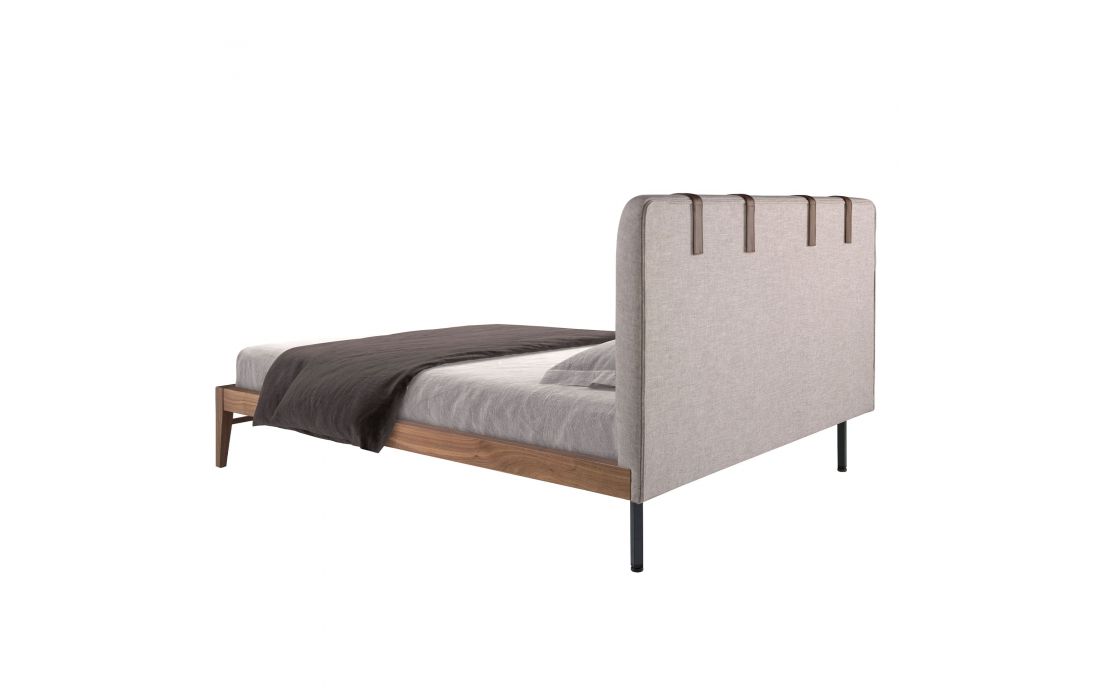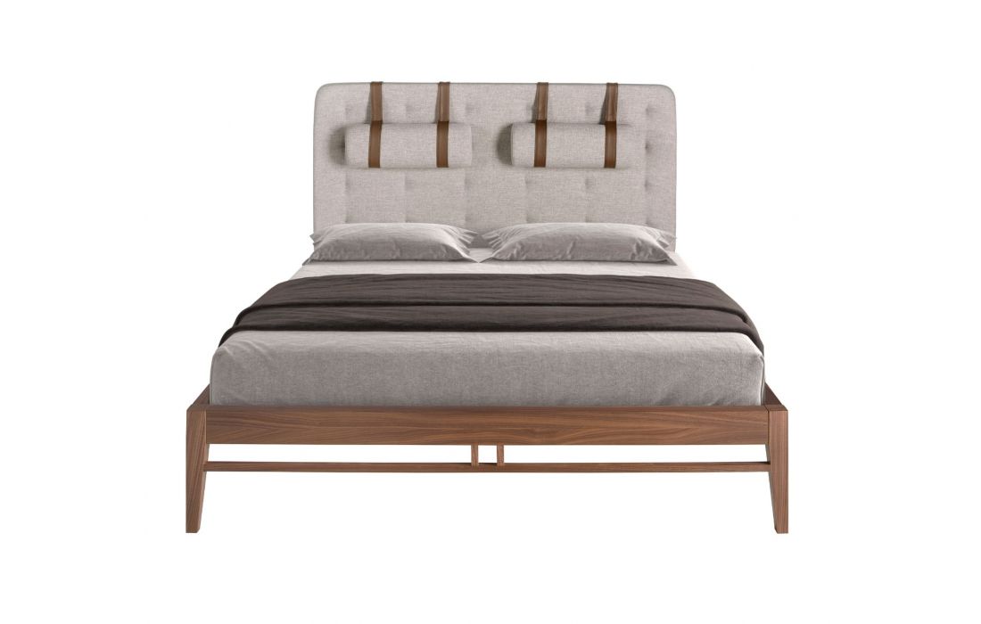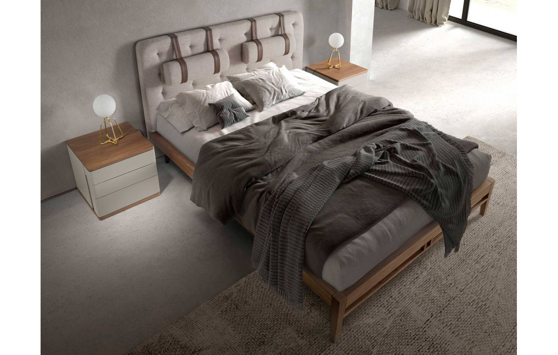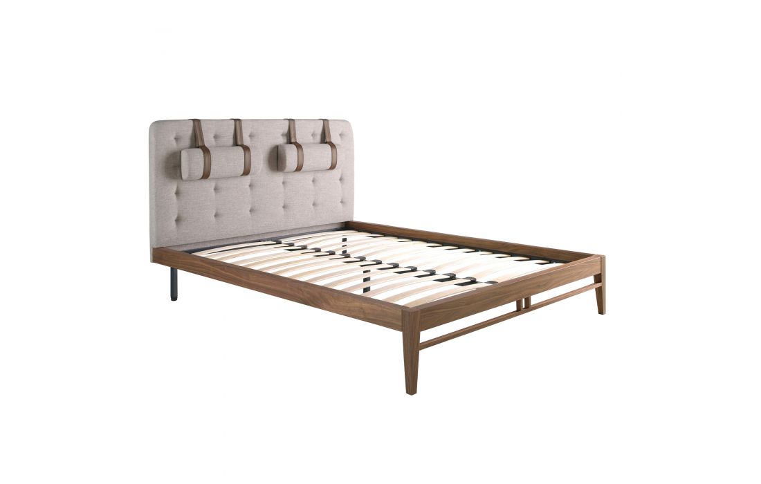 Modern design double bed with gray fabric headboard and natural walnut veneered wood structure. Includes multi-slat platform made from pine wood.Recipient :