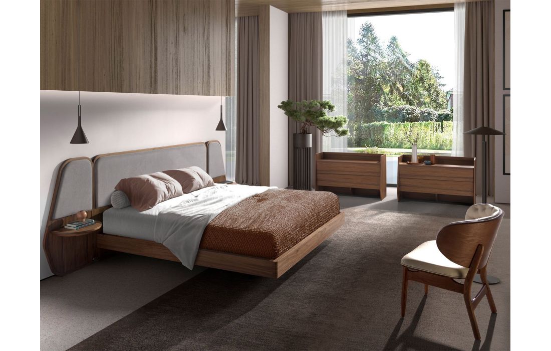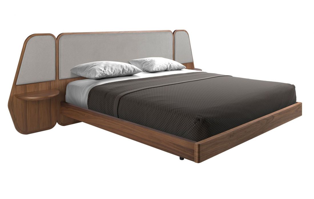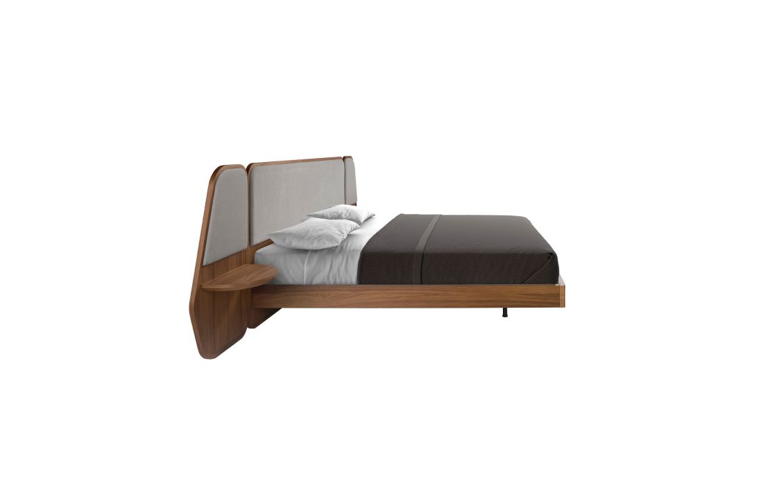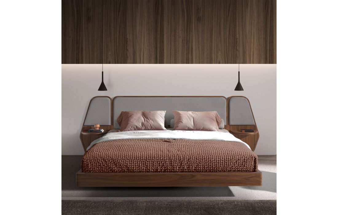 Modern design double bed with headboard, natural walnut veneered wood frame and stainless steel legs.Recipient :