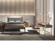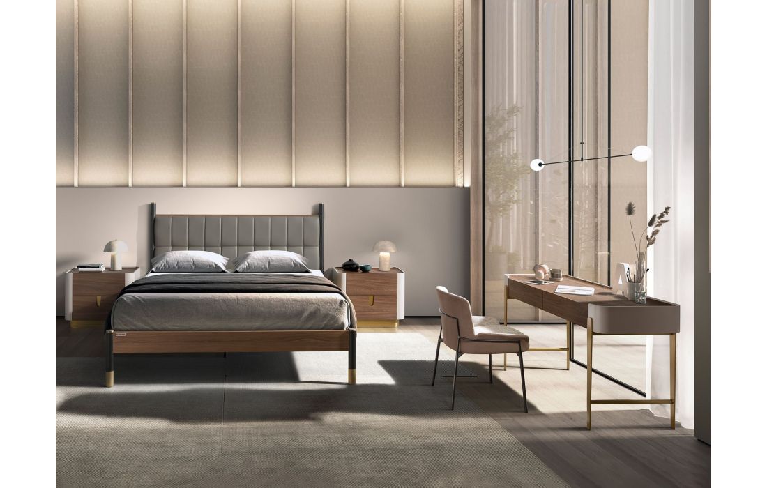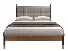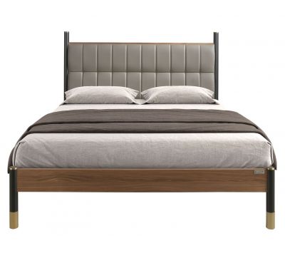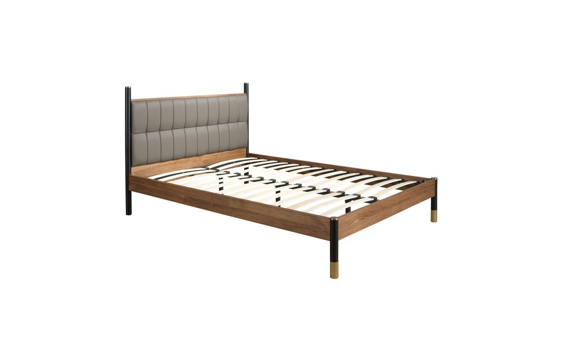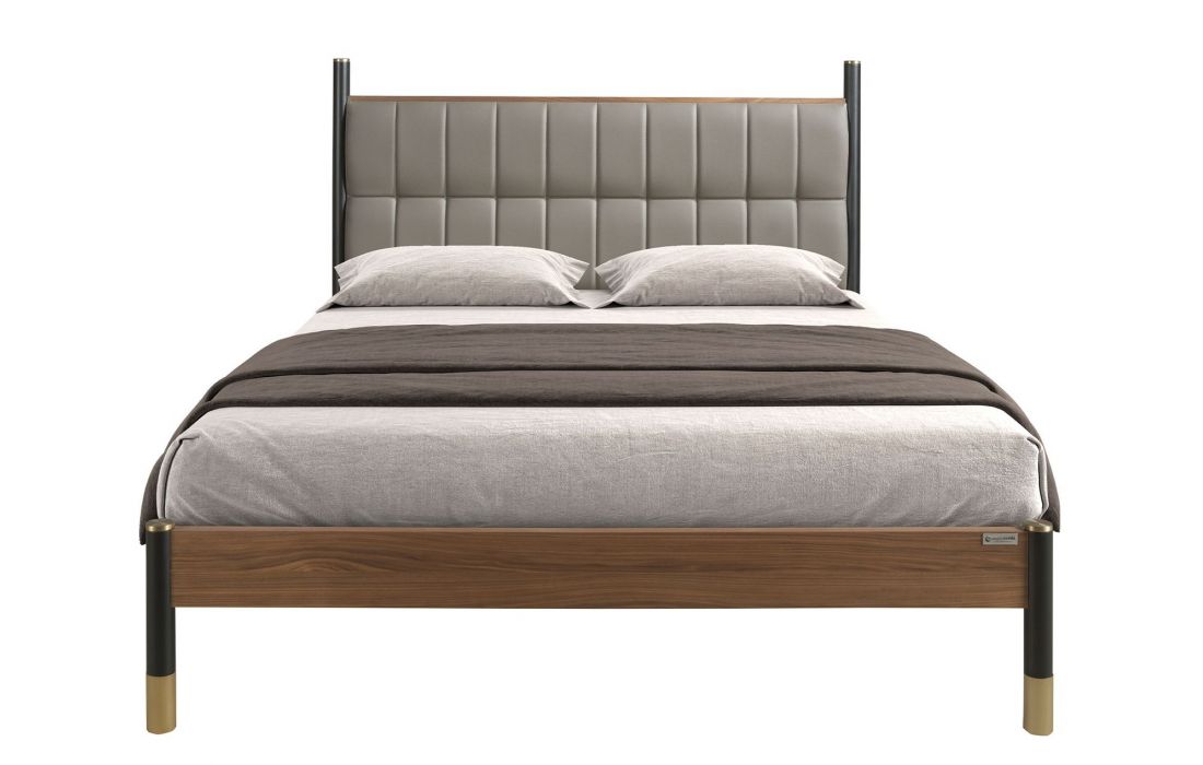 Modern design double bed with an original leather headboard and natural walnut veneered wood frame and MDF wood legsRecipient :