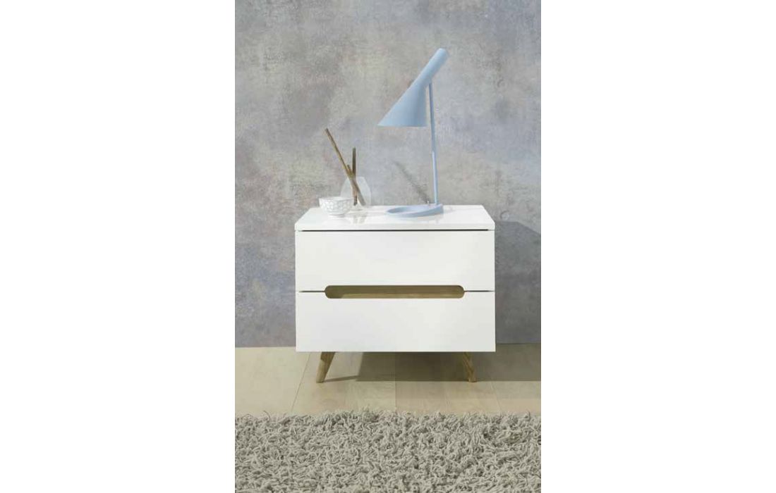 Bedside table in white with 2 drawers and wooden feet.