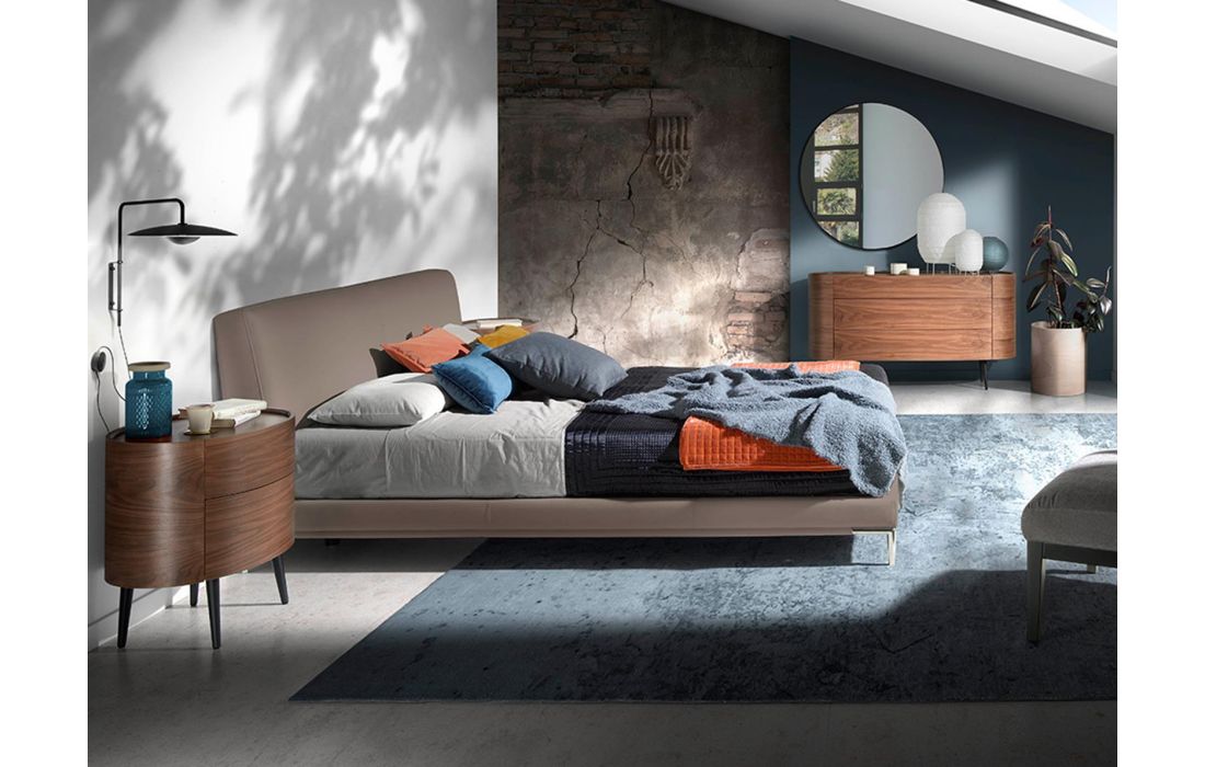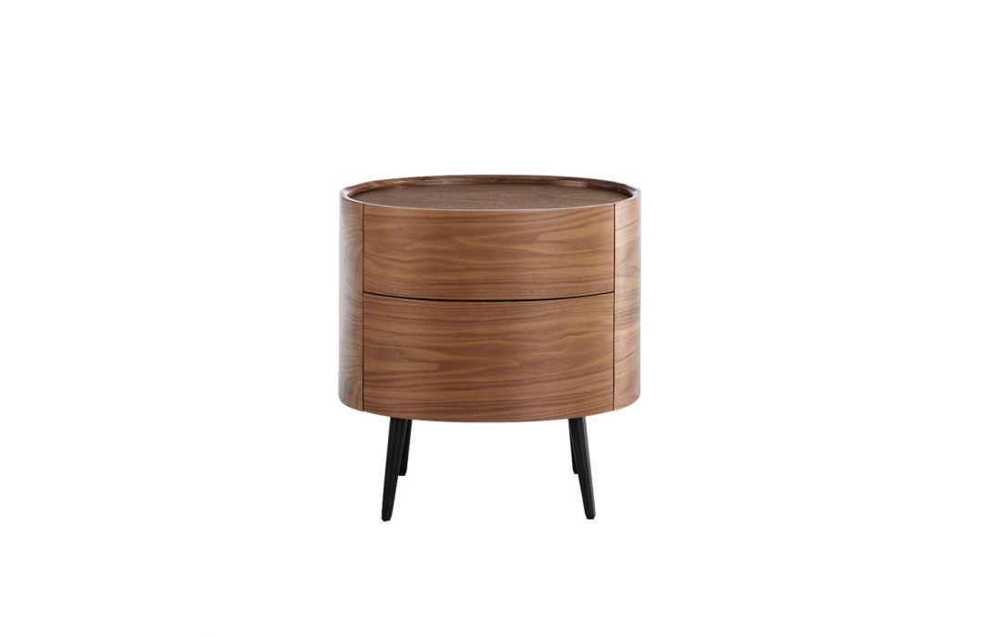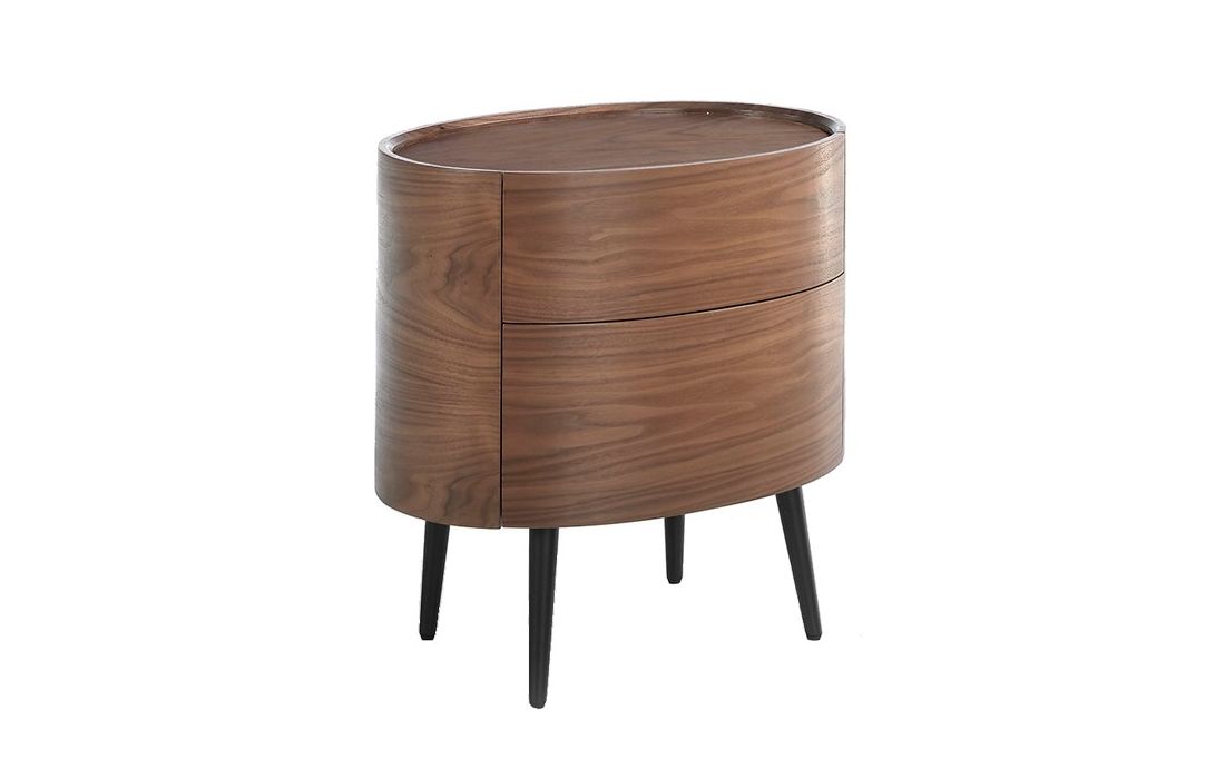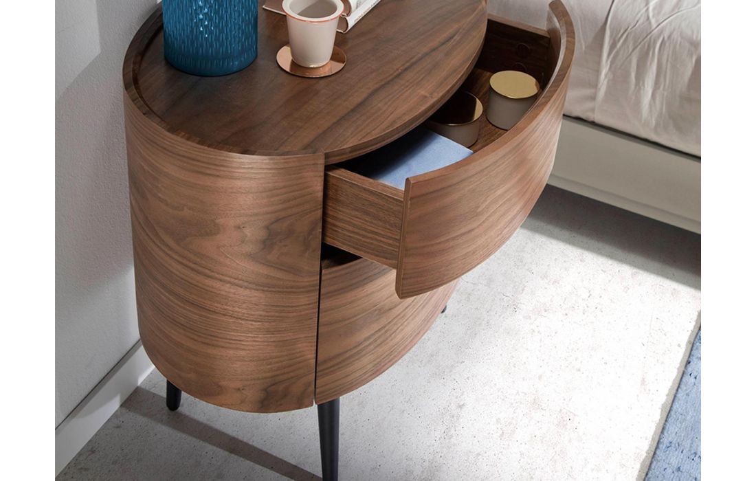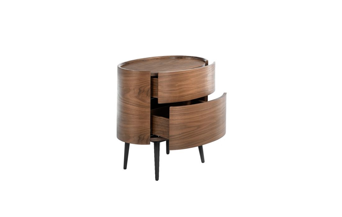 Oval bedside table in walnut veneer with 2 hidden drawers. Black painted wooden feet.