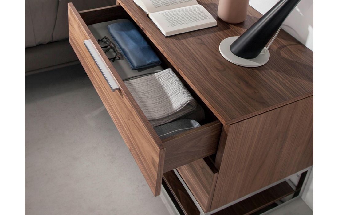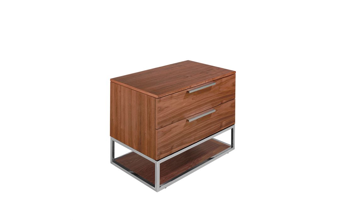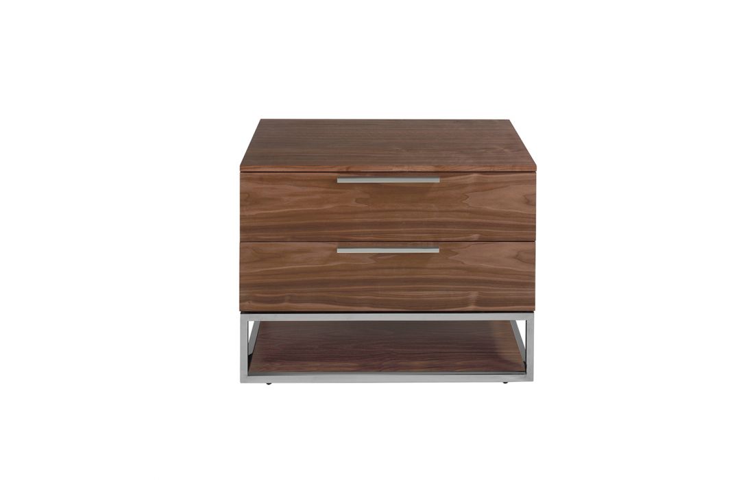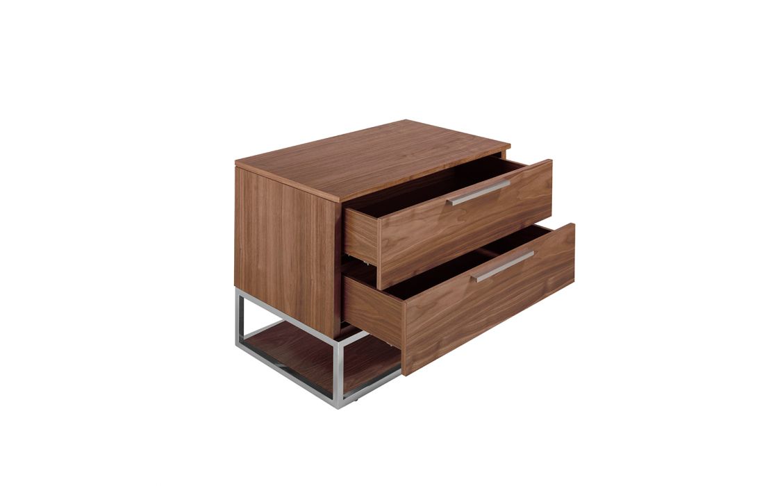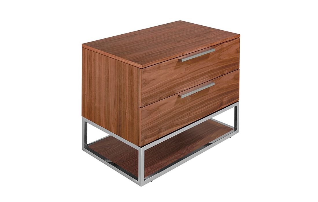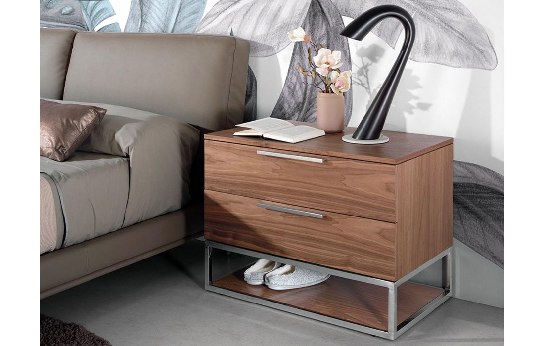 Bedside table with walnut veneered wood structure and drawers with chrome steel handles. Foot frame in chrome-plated stainless steel.