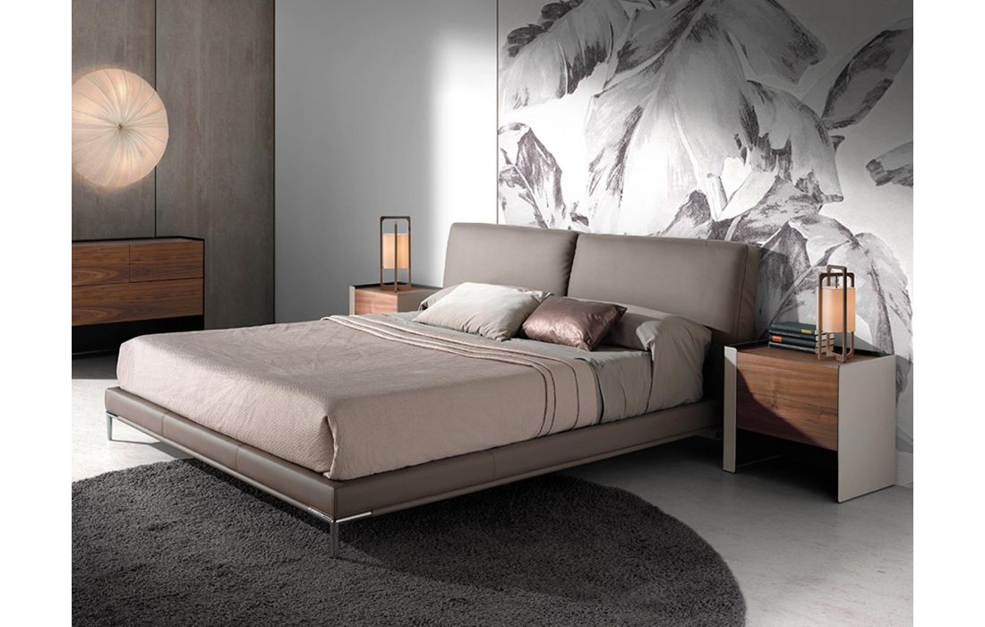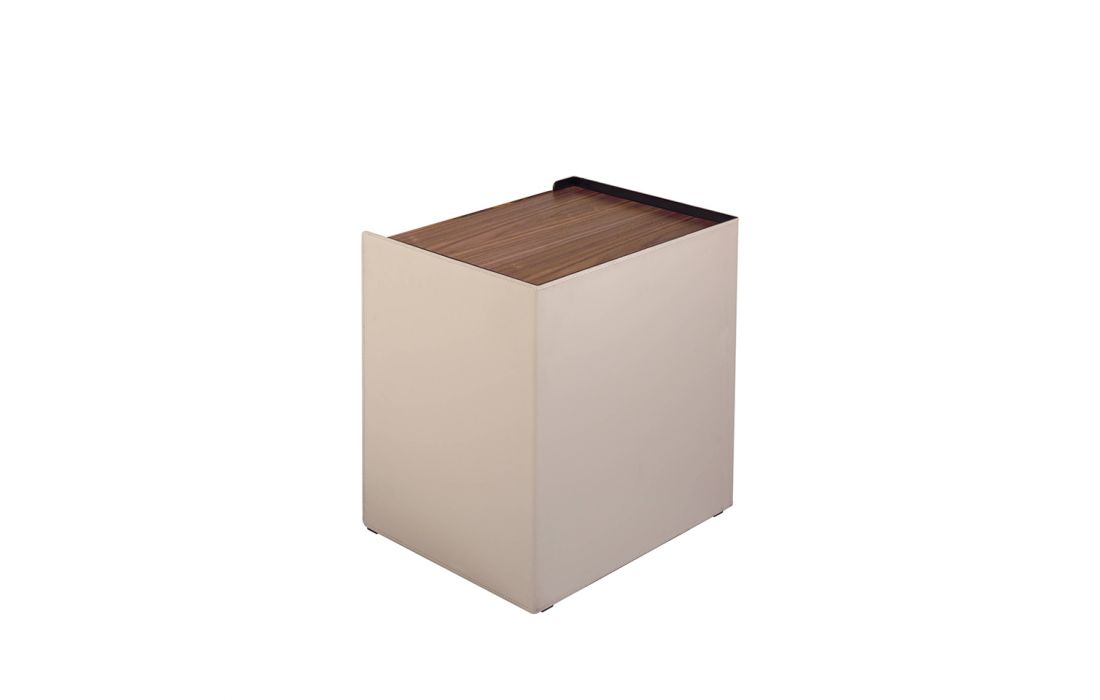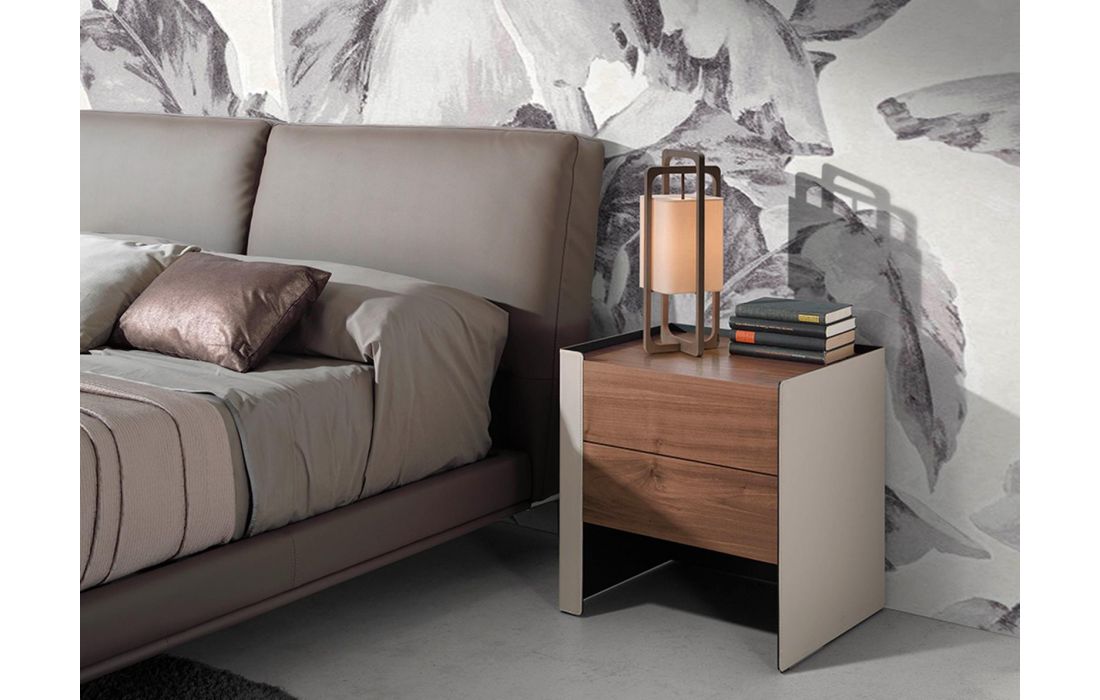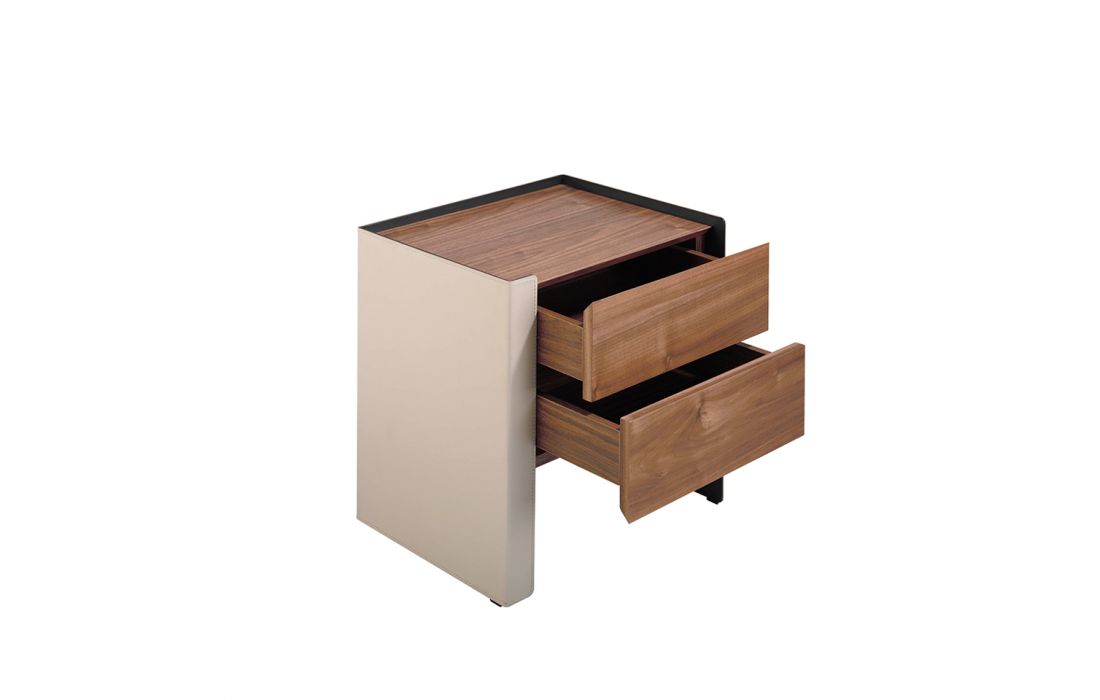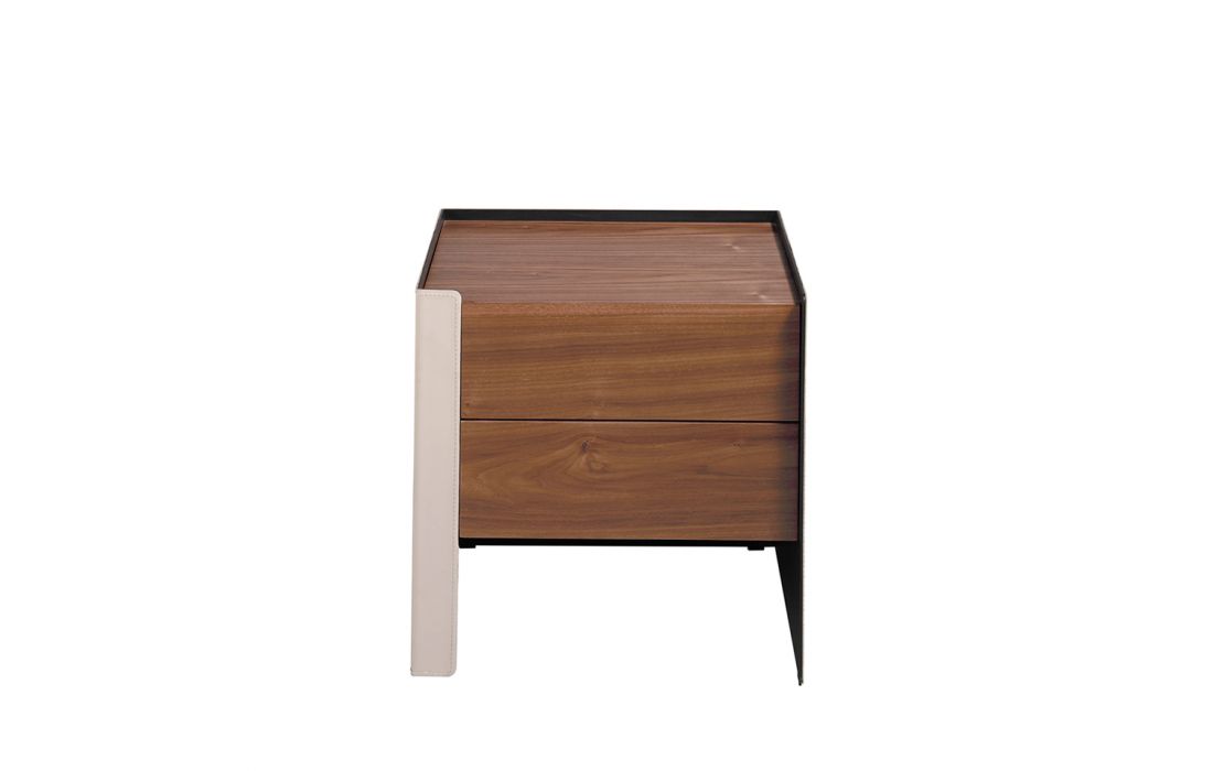 Bedside table with drawers and structure in walnut veneered wood and recycled leather.