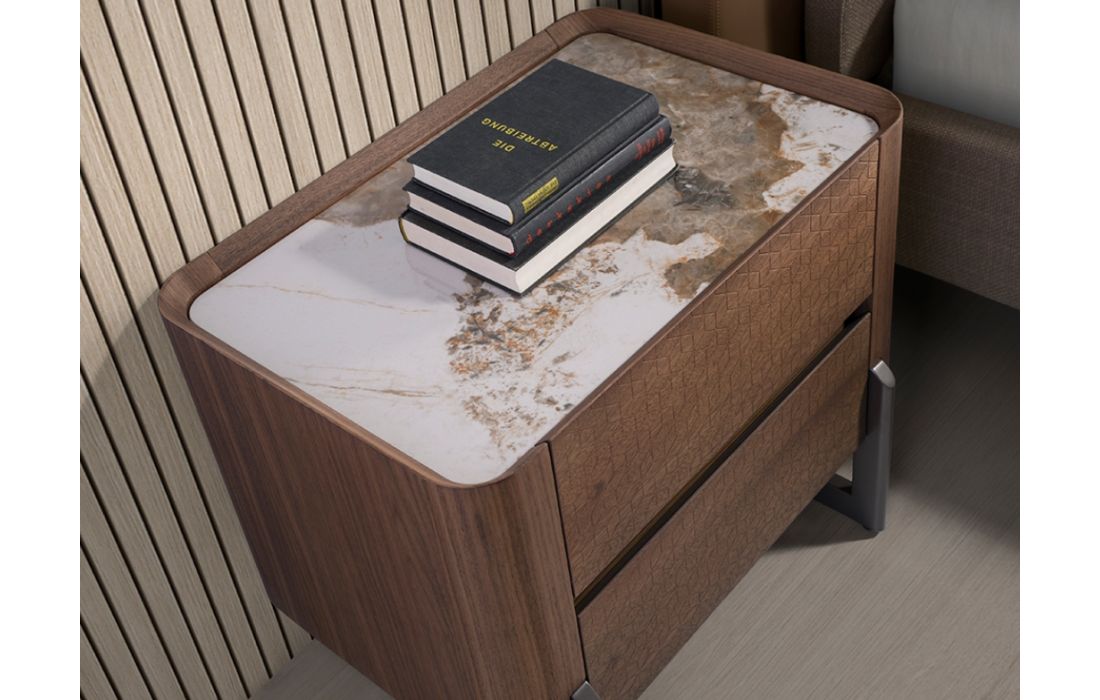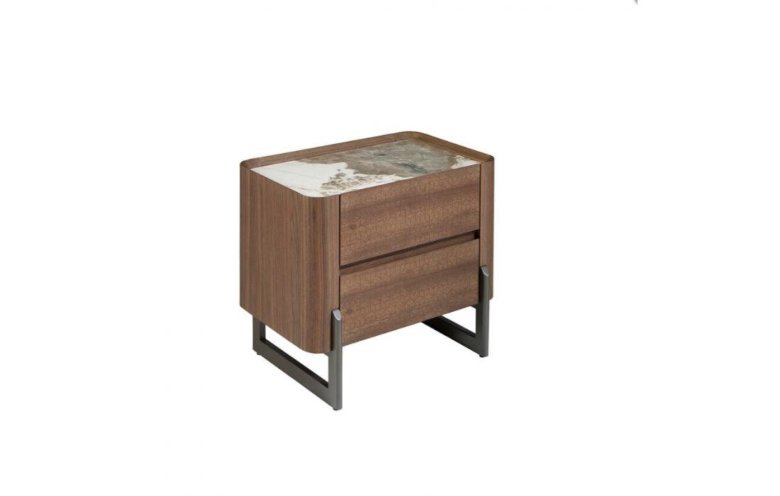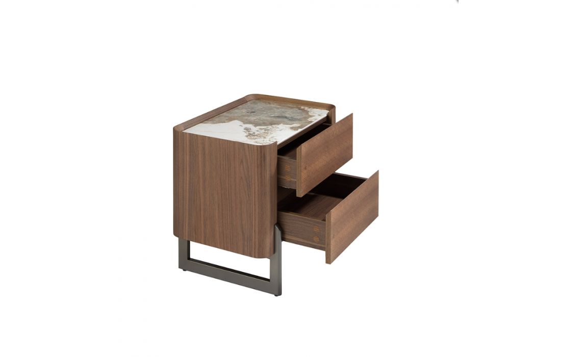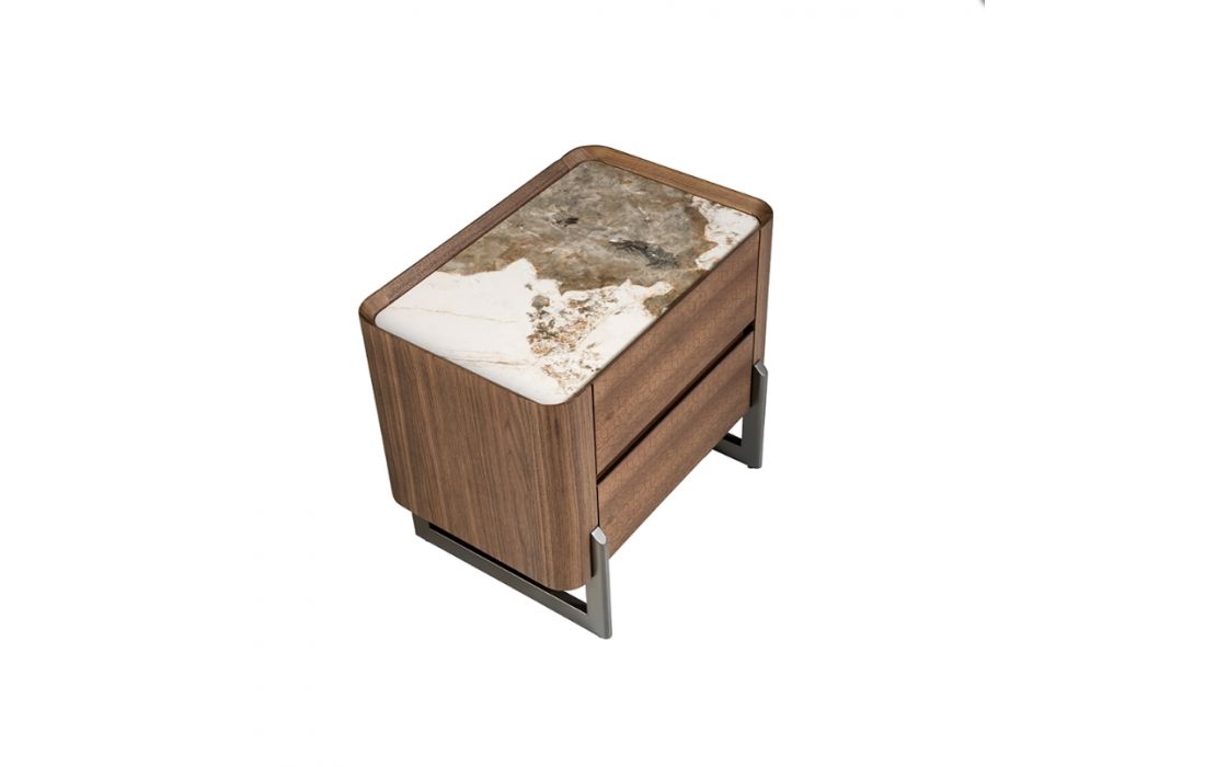 Bedside table with wooden structure veneered in natural walnut and original legs in dark metallic stainless steel. Top in white porcelain marble with veins in gray and brown tones with a glossy finish.