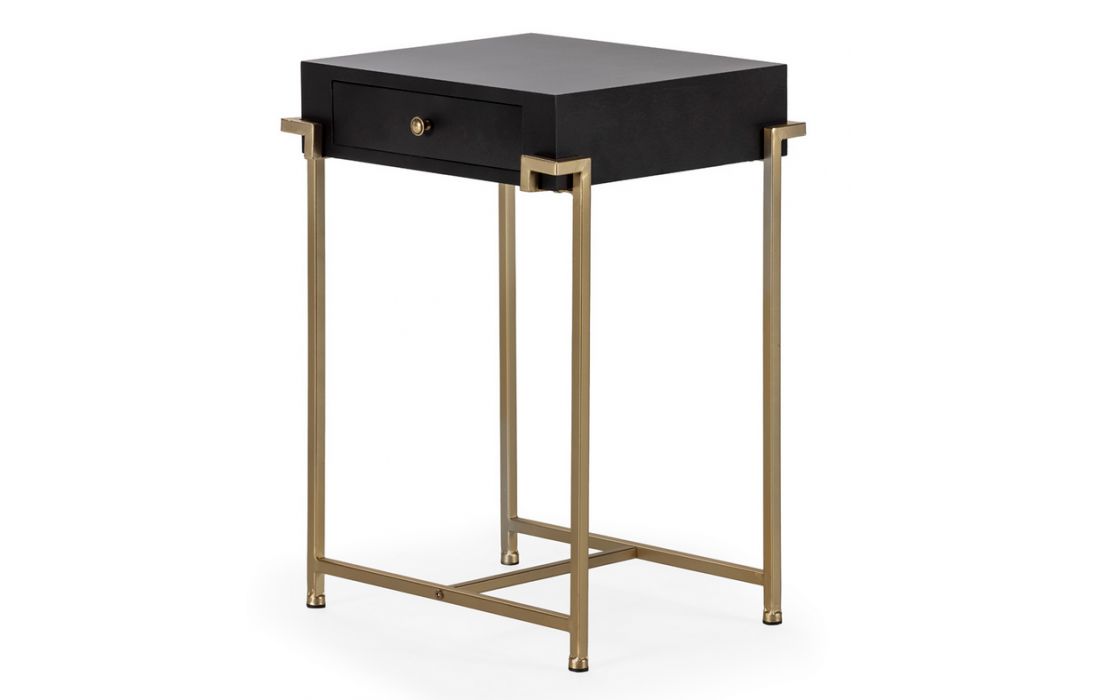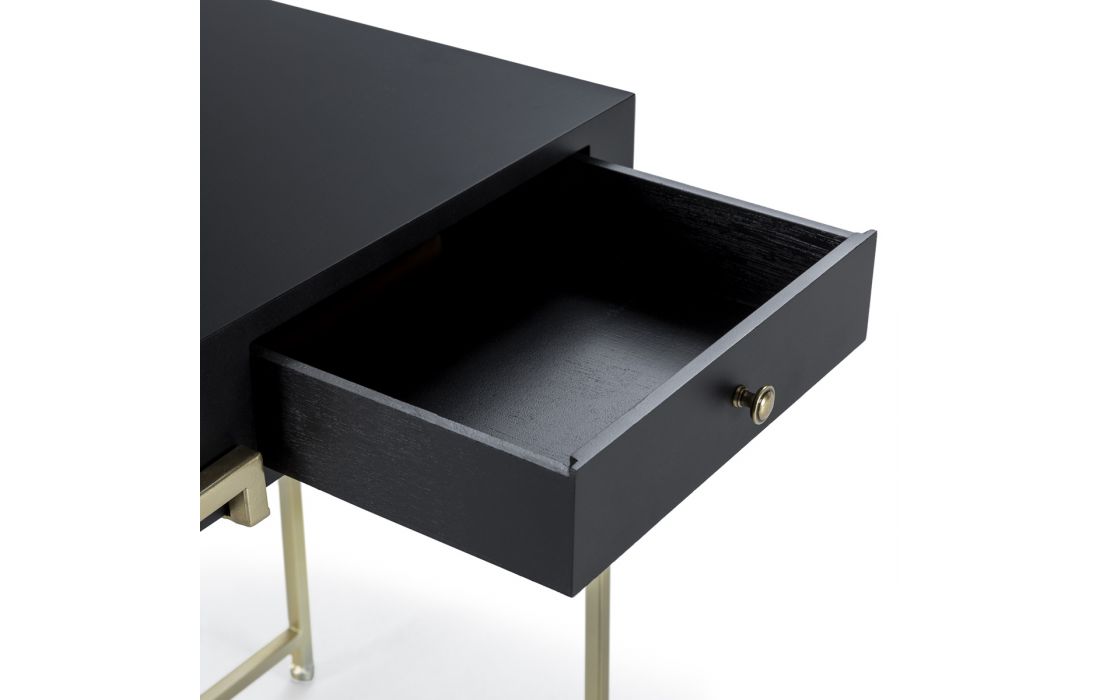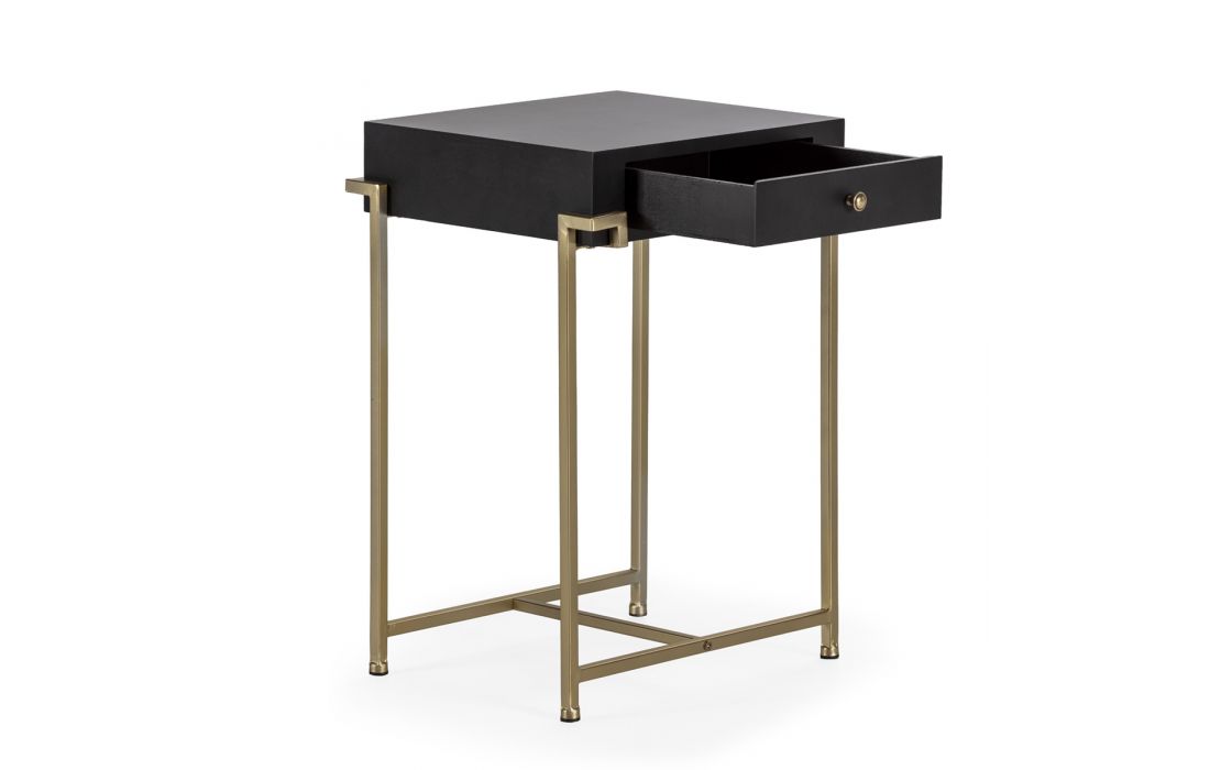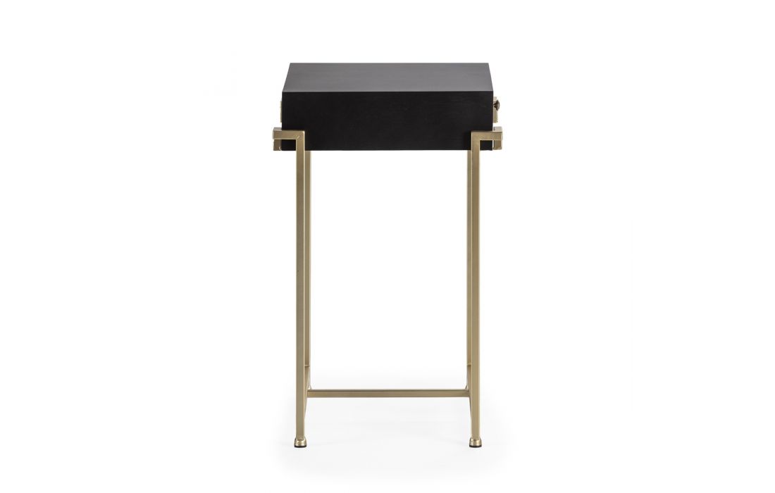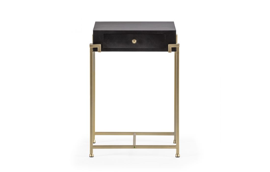 Bedside table with 1 drawer in black recycled pine wood and base and handles in gold metal.