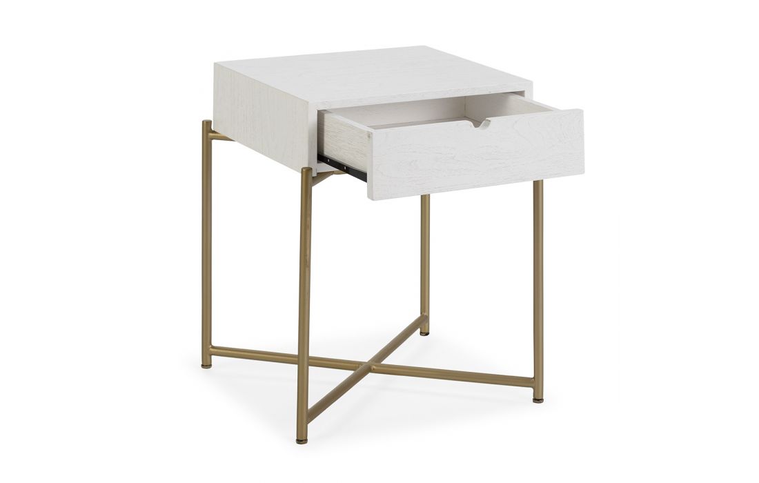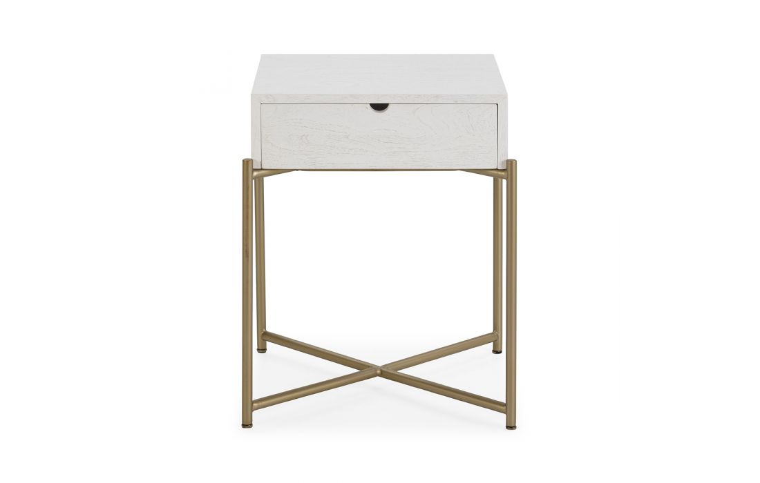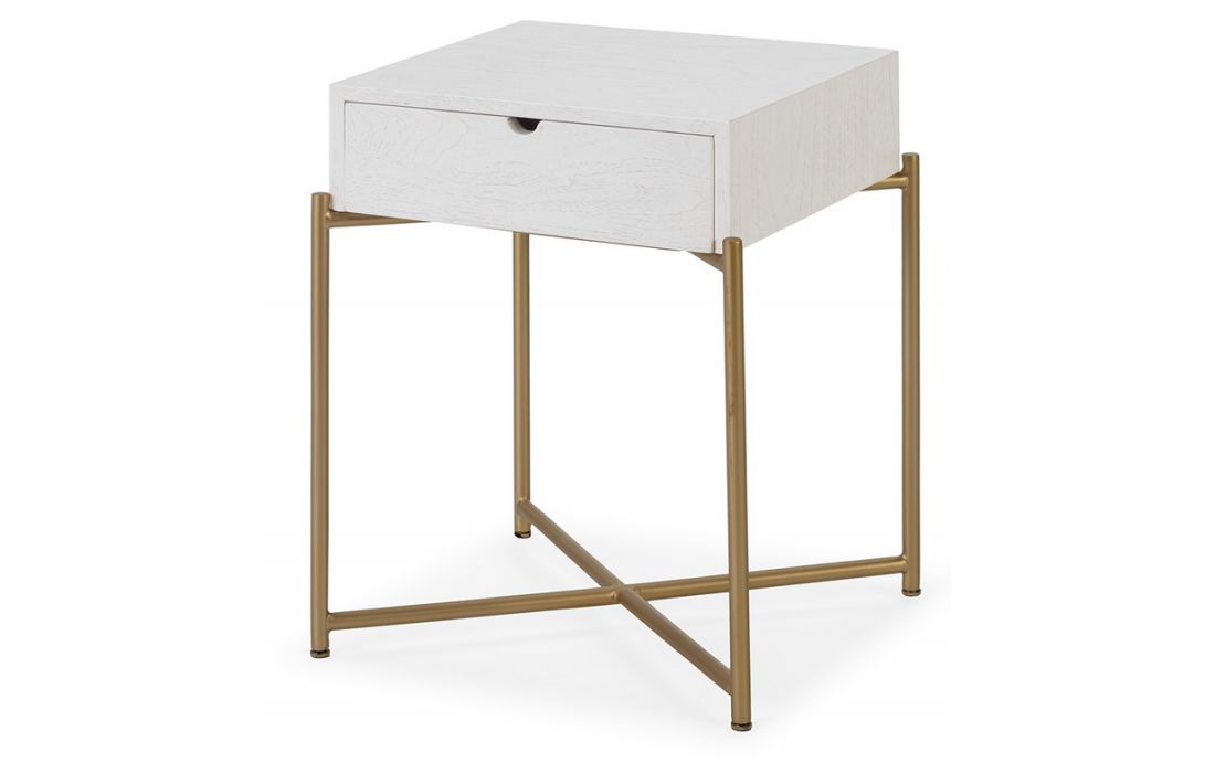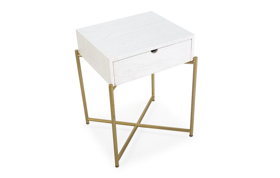 Bedside table in white cedar wood with golden metal base.