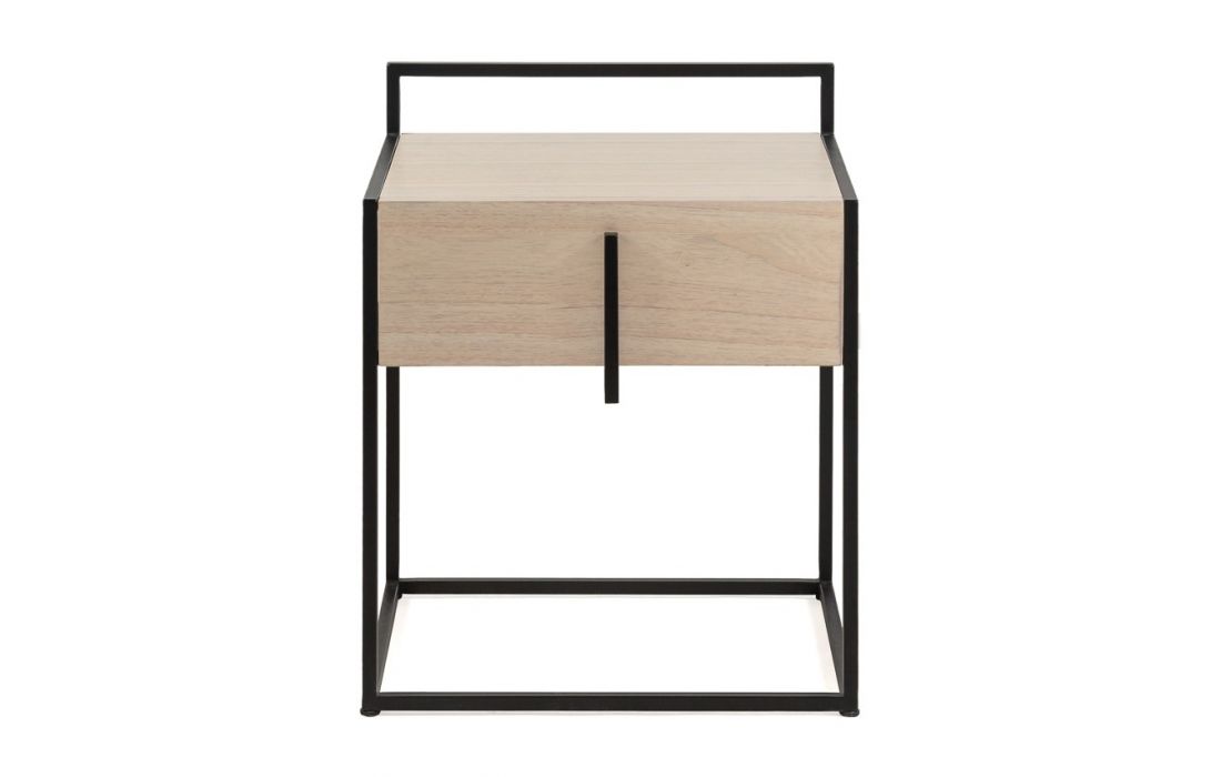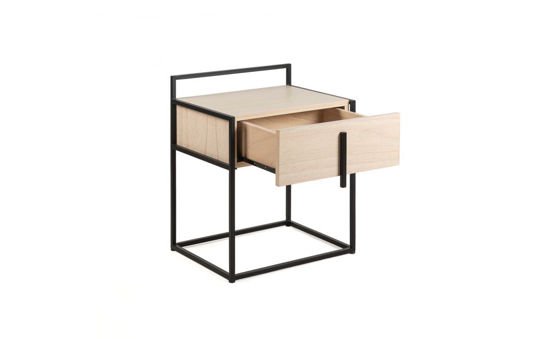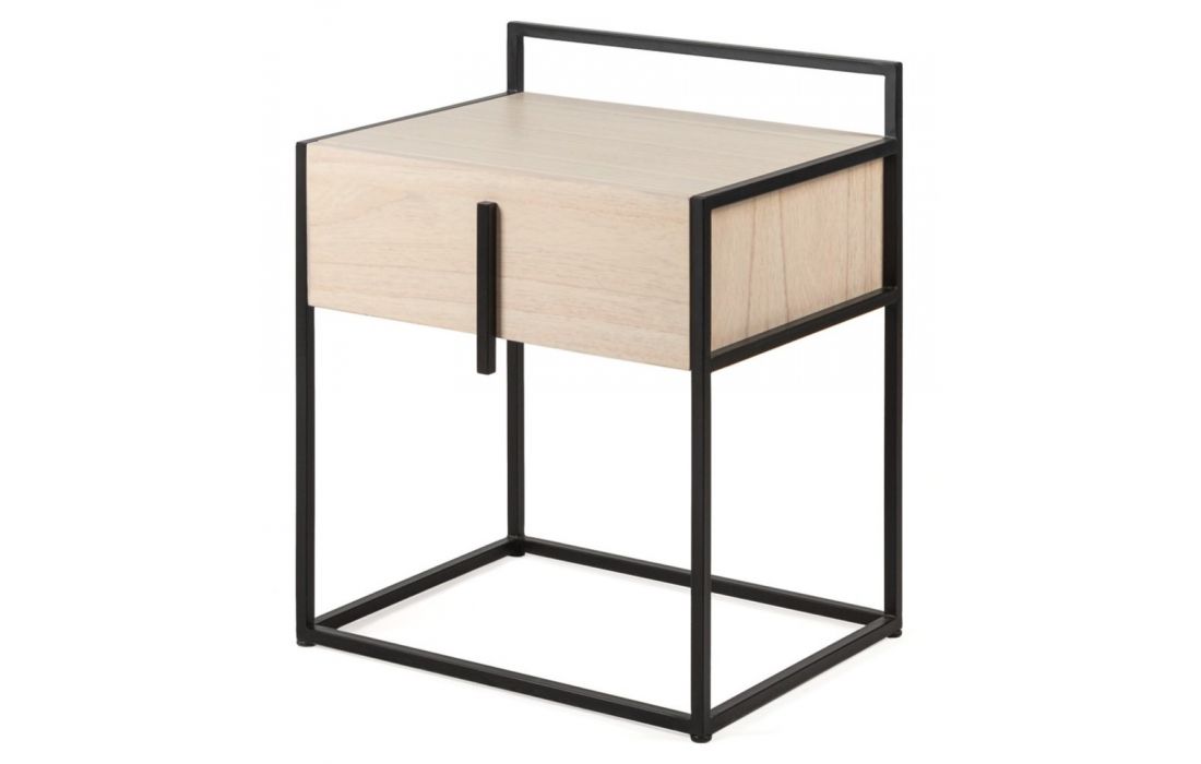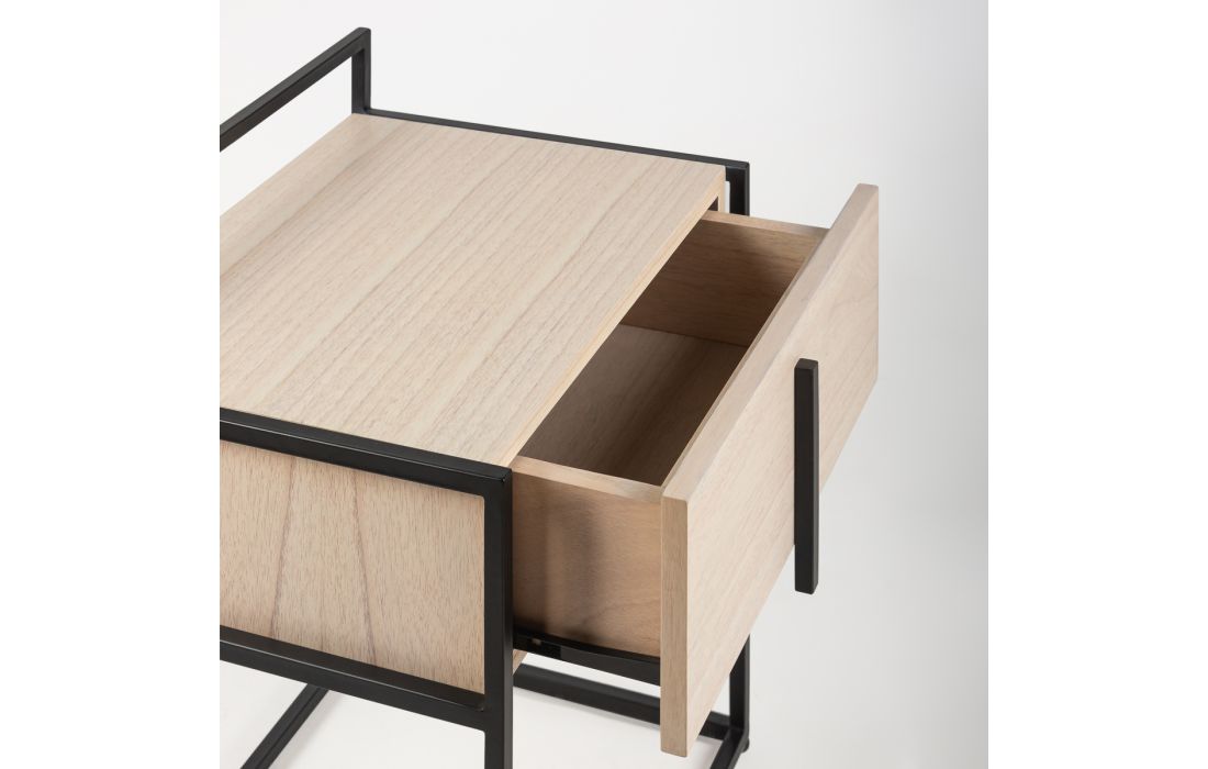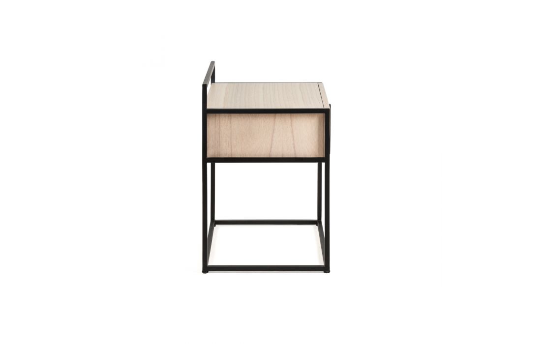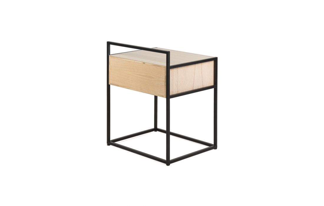 Bedside table in natural cedar wood with black metal handle and base.Dimensions in cms