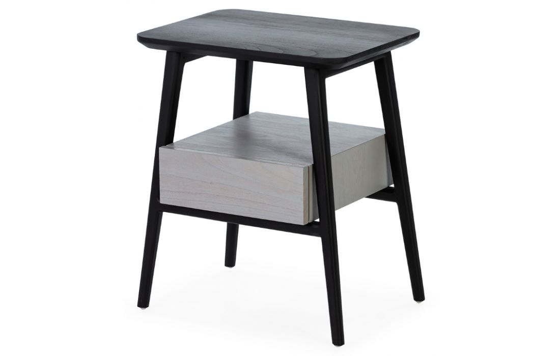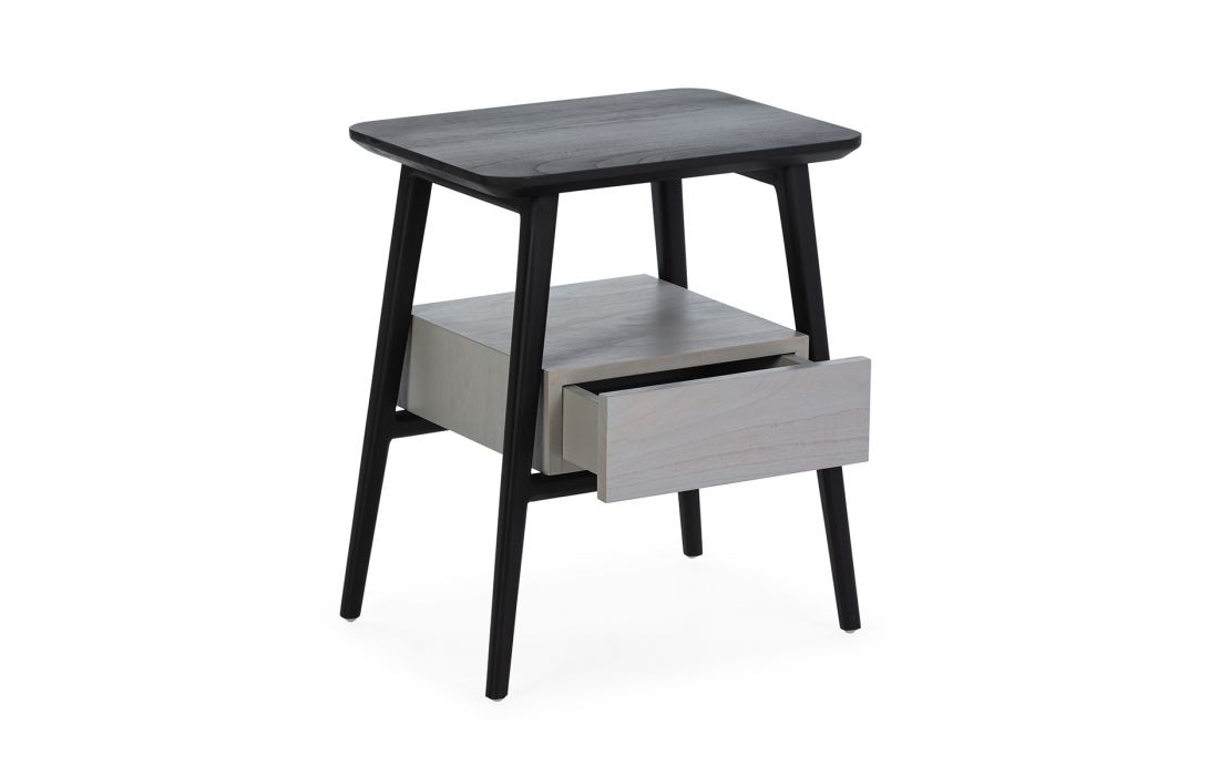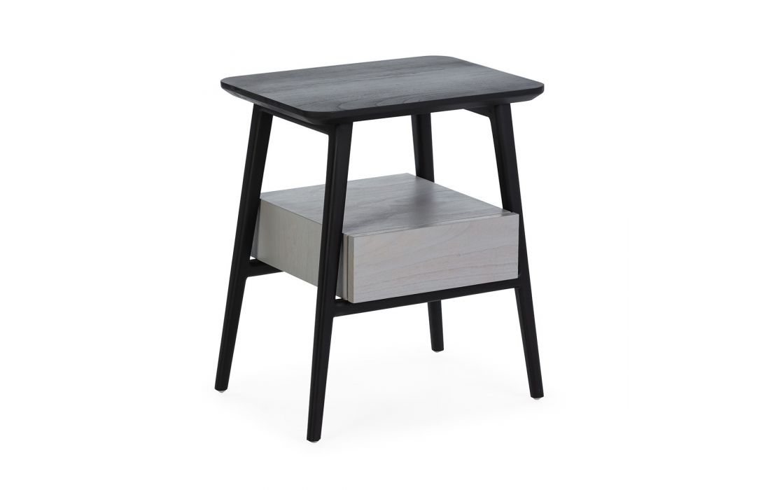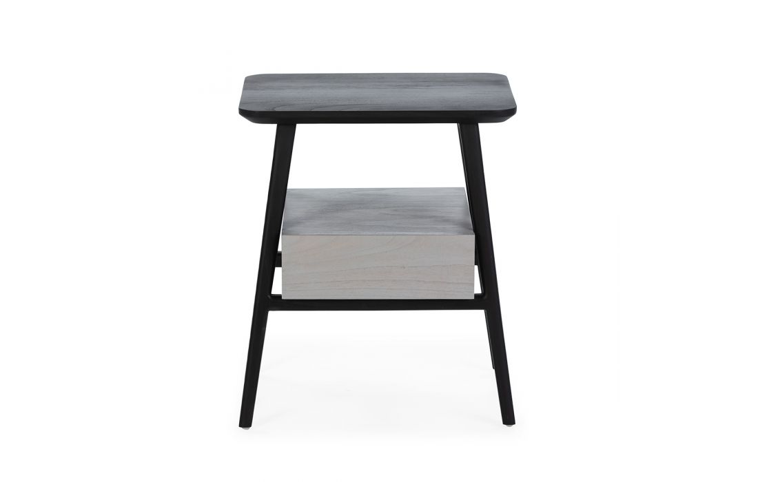 Bedside table in natural black cedar wood with a drawer in gray patina.