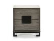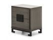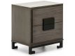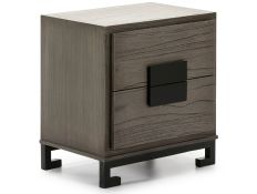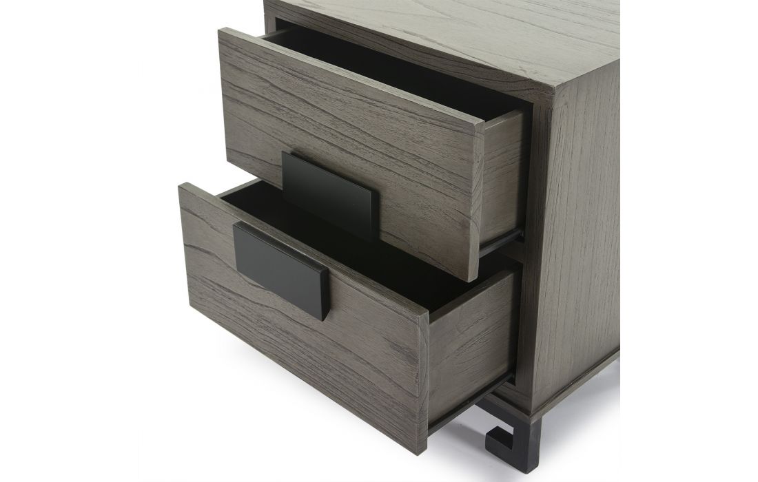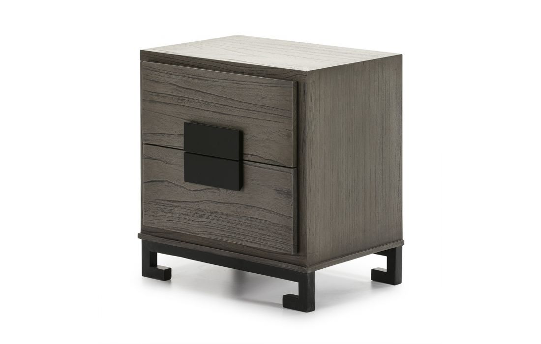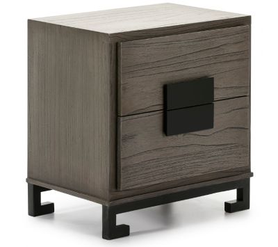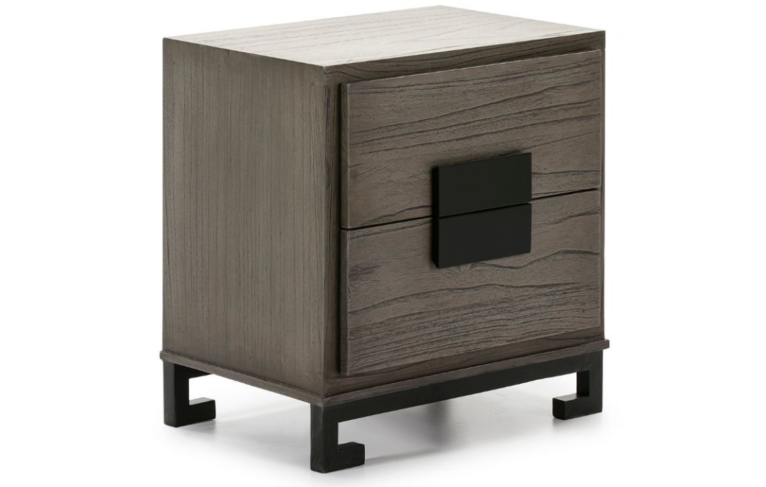 Bedside table in gray wood, with two drawers and black wood handles and legs.