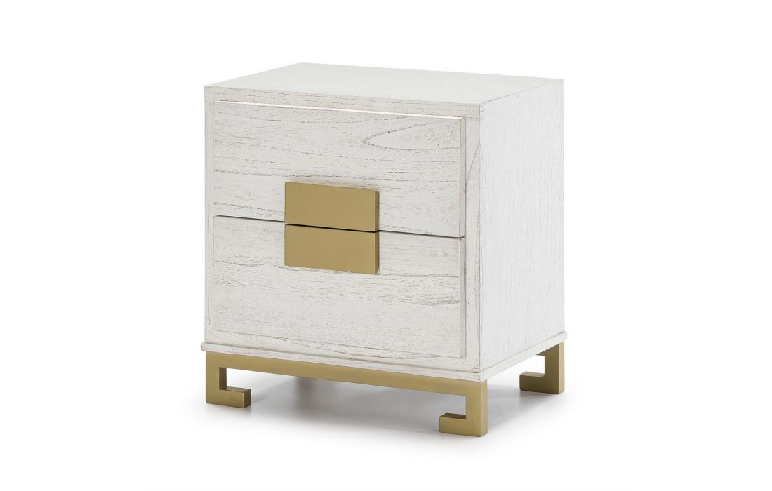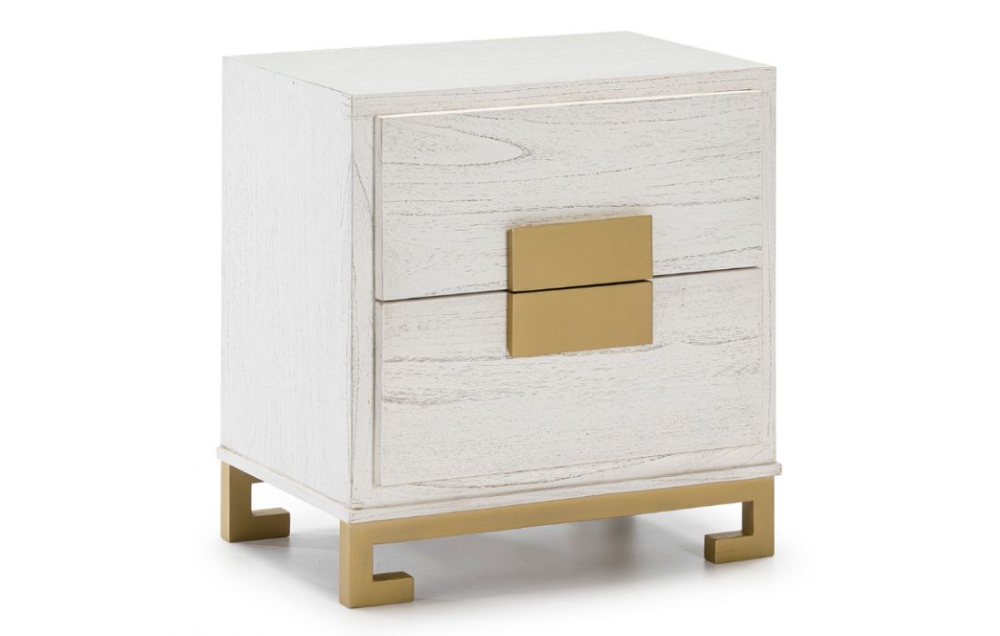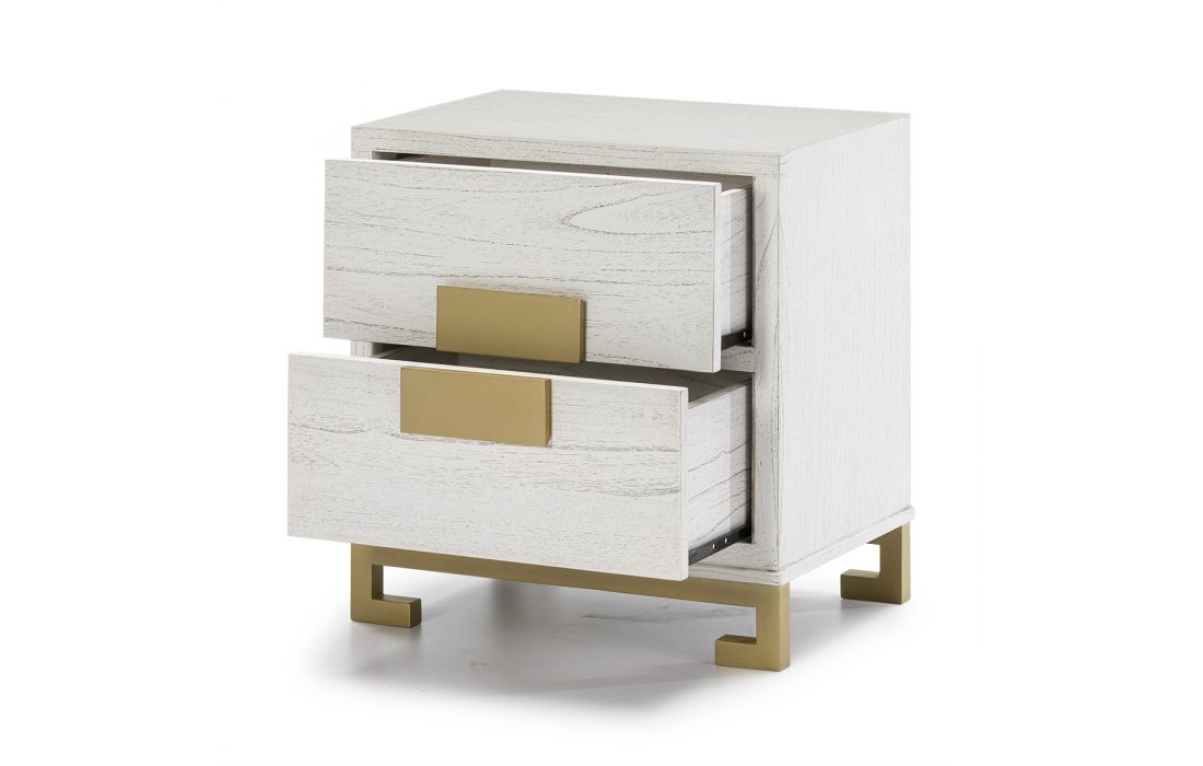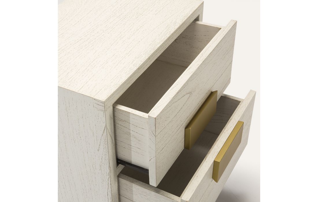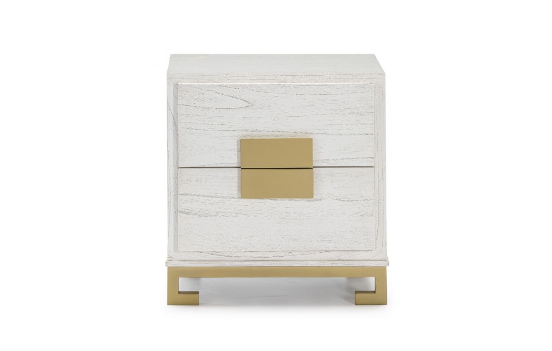 Bedside table in white wood, with two drawers and golden wood handles and legs.