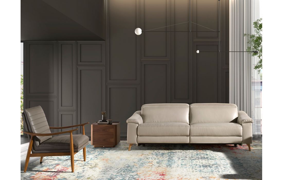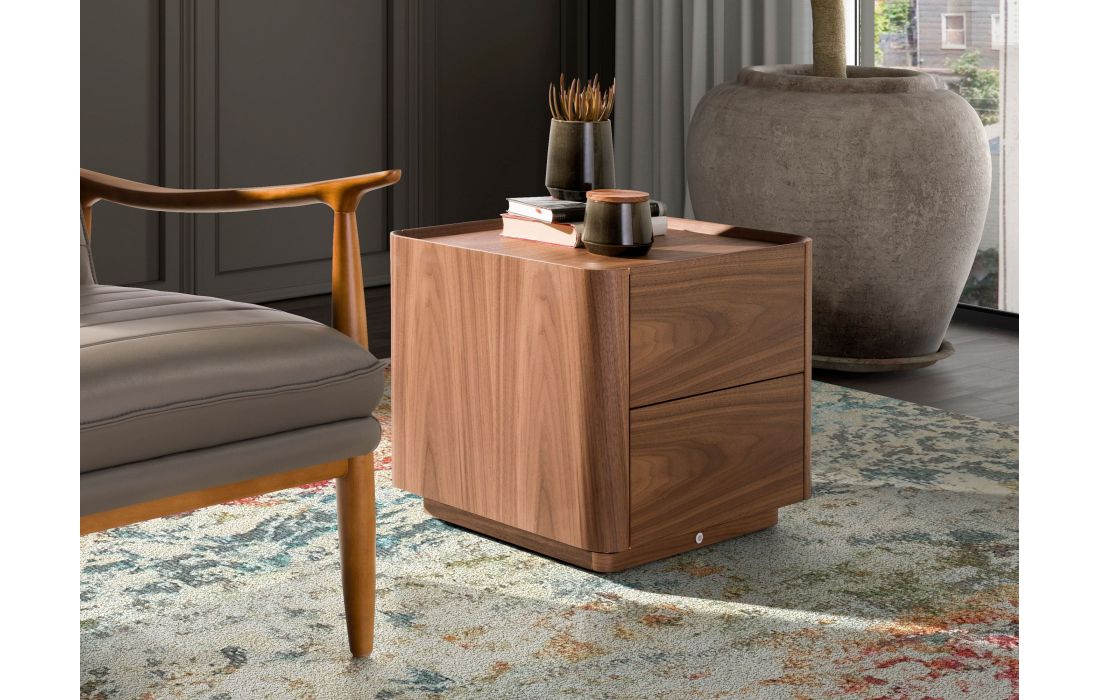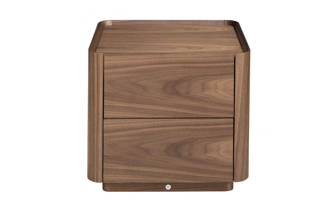Modern design bedside table with walnut veneered wood structure and base. It has ample storage space with 2 drawers with finger opening and soft closing system.