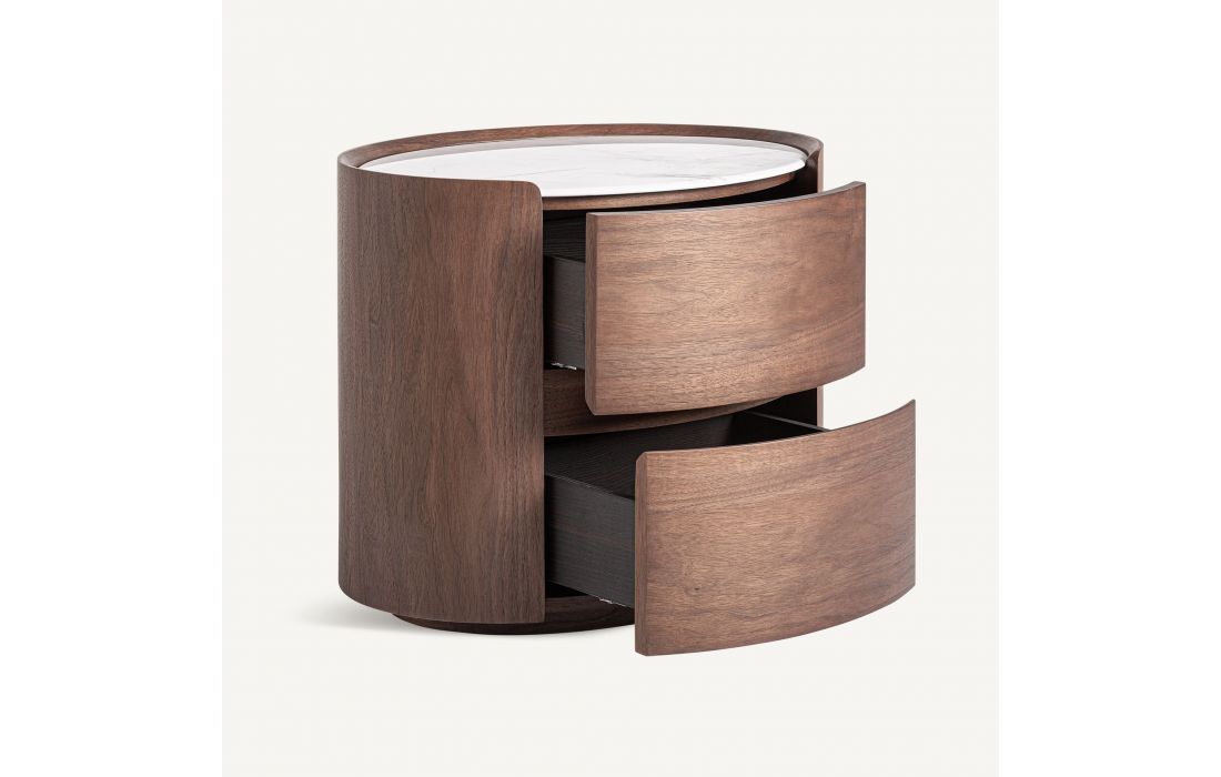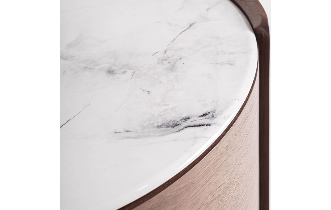 This bedside table combines plywood with oak veneer and white stone. Its compact design and mix of natural textures make it a functional piece with a warm and balanced aesthetic.Recipient :
