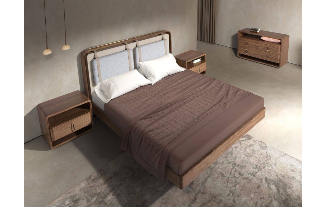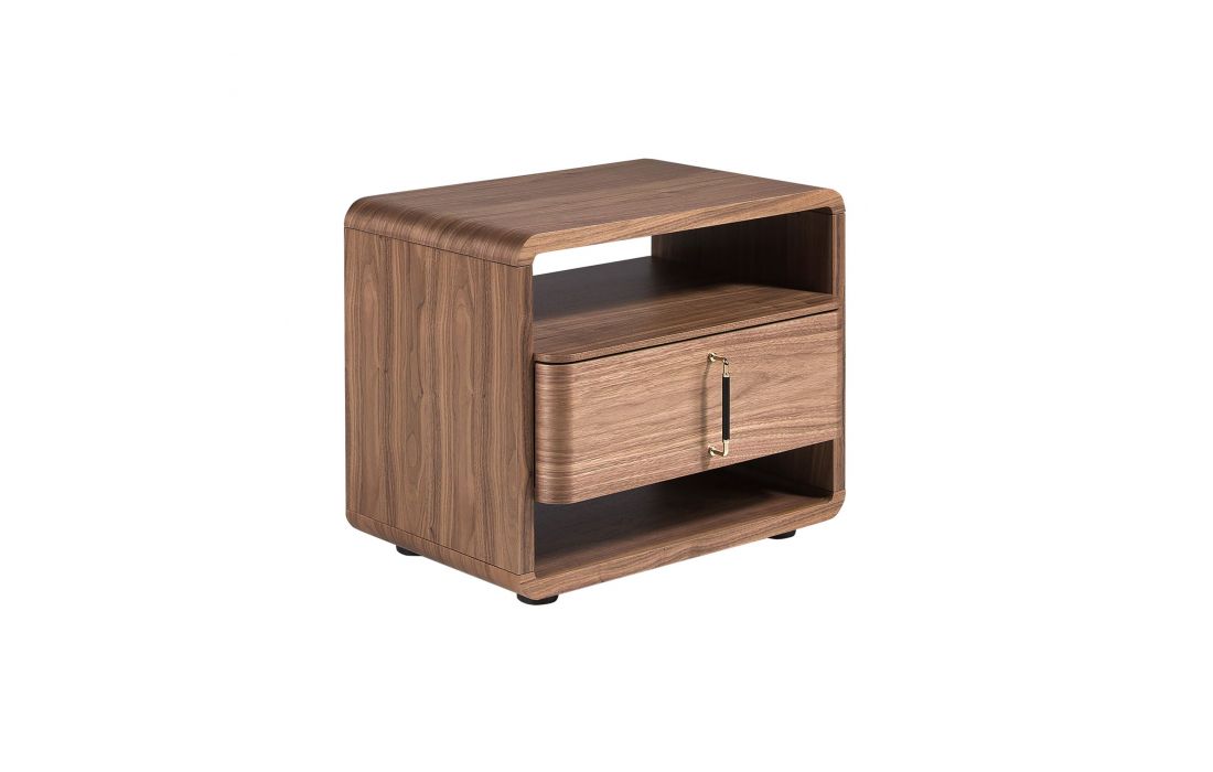 This modern bedside table features a natural walnut veneer wood frame and PVC legs. Its curved design enhances the piece's aesthetic, giving it visual softness and a distinctive character.