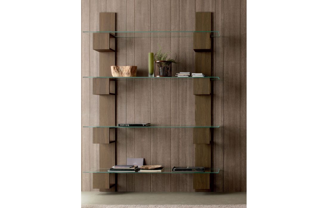 Bookseller modern wooden structure burnt walnut or oak with shelves in extra clear transparent glass