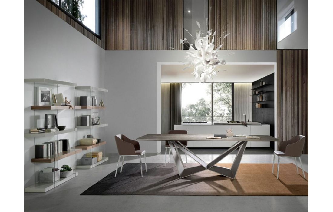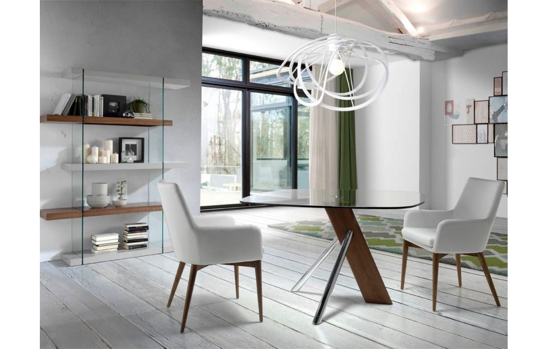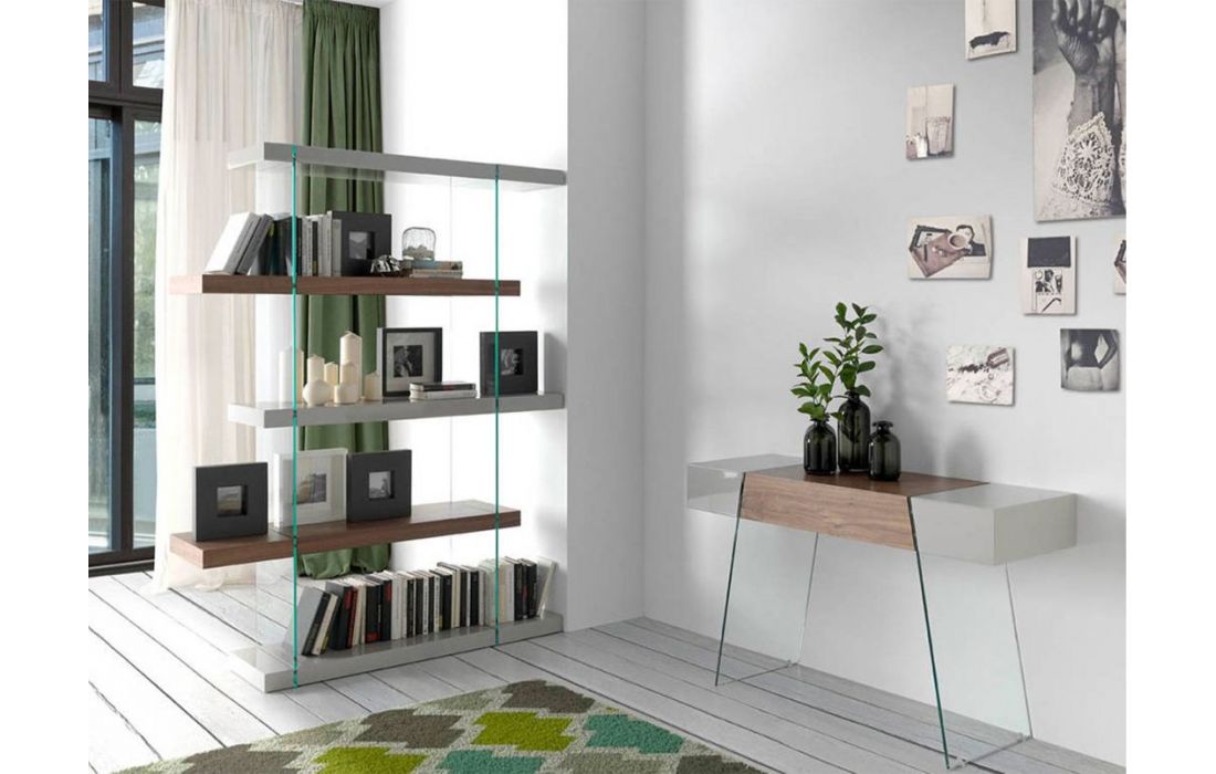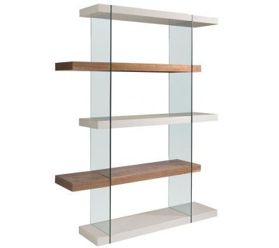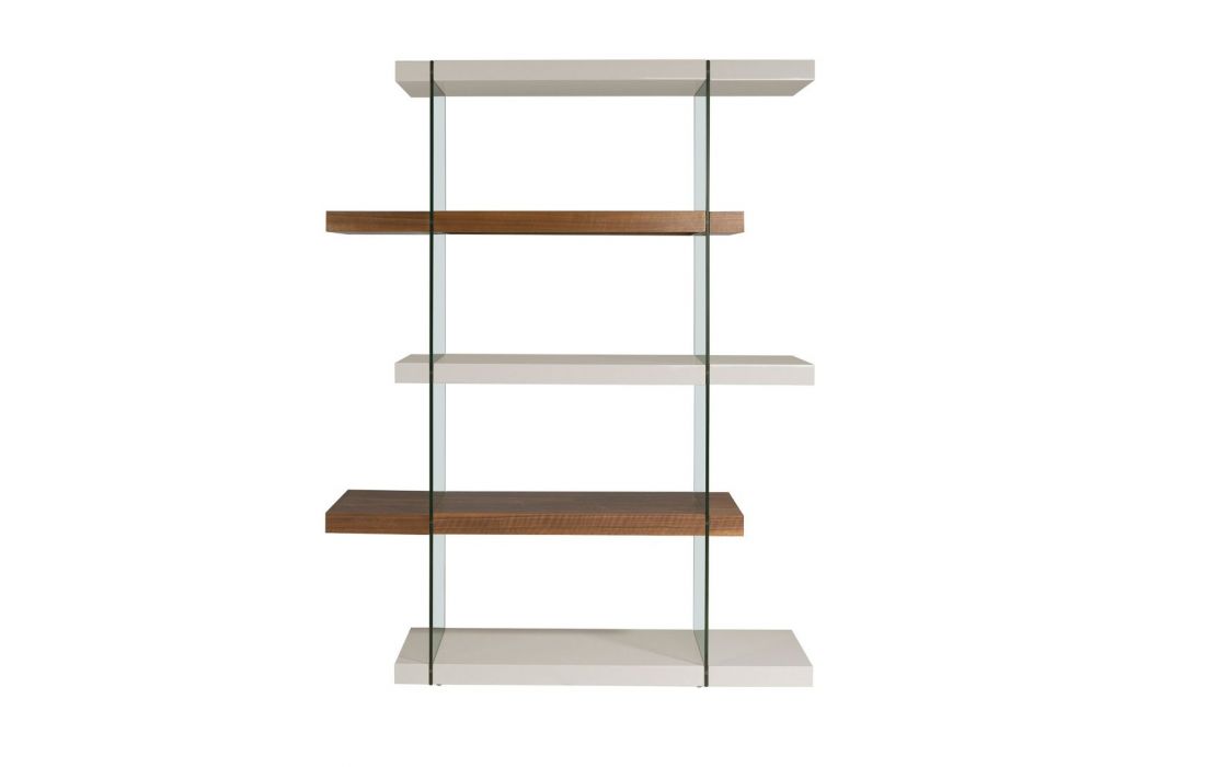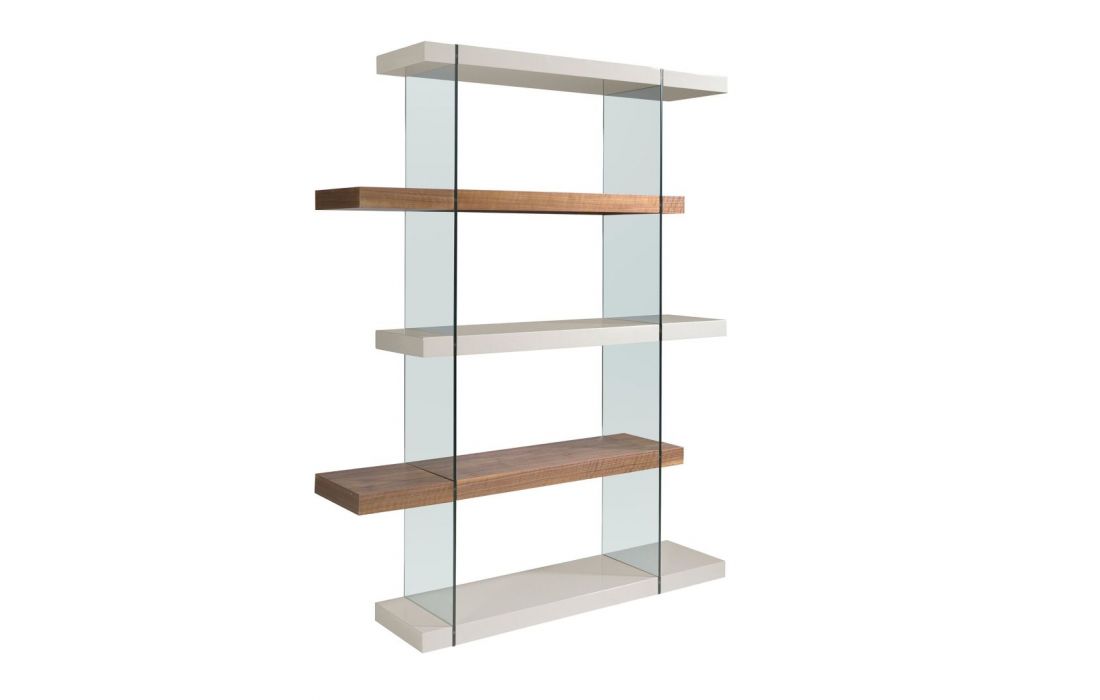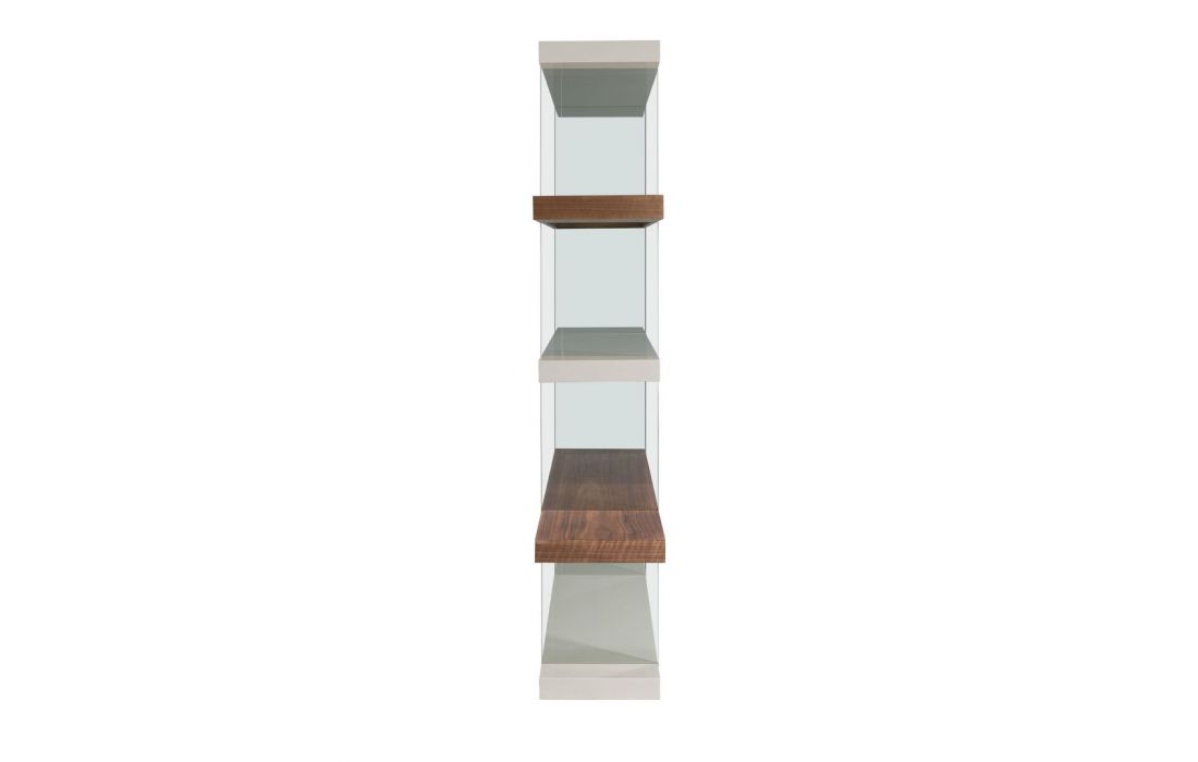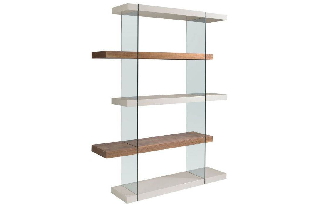 Simple and modern bookcase in walnut MDF with cubes in lacquered MDF with a glossy finish and glass detailRecipient :