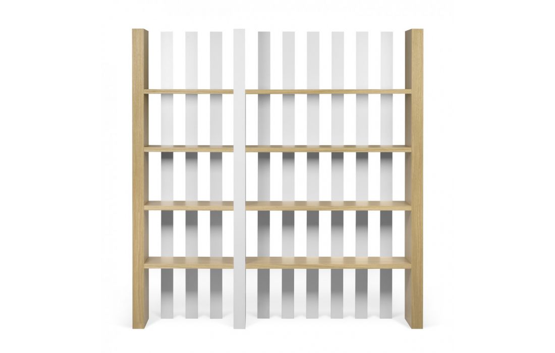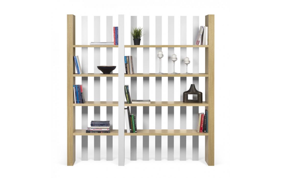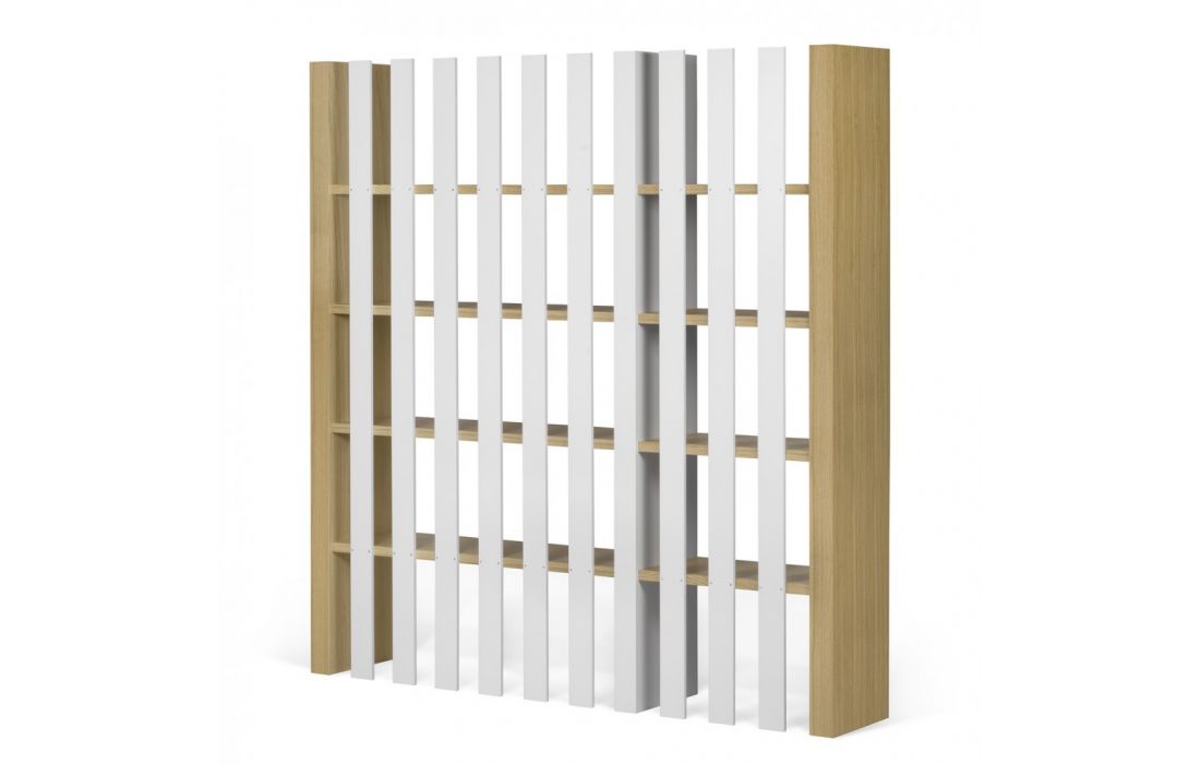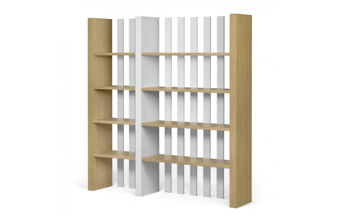 Bookseller with contemporary style, appealing white slats along its back and an interesting game thicknesses between its elements.