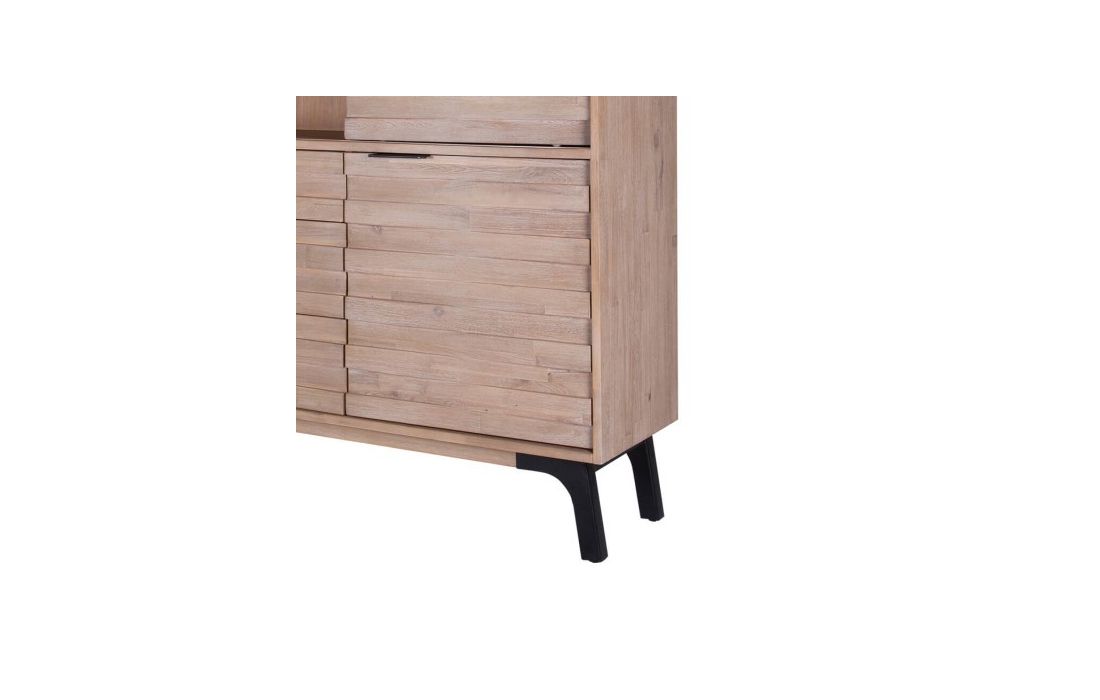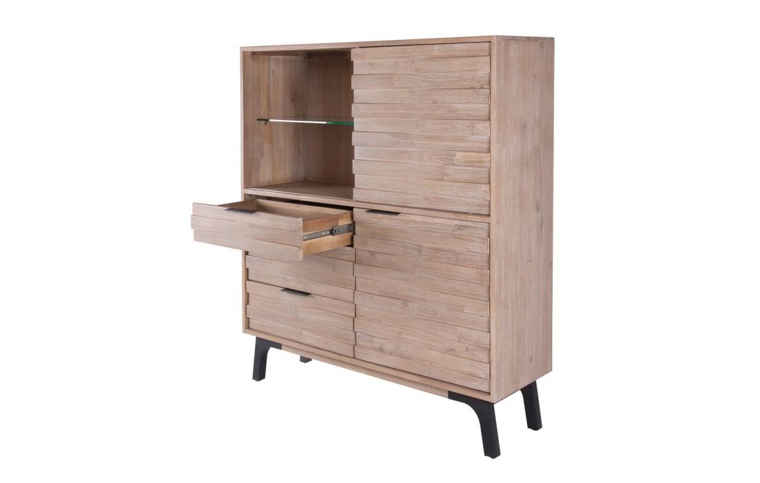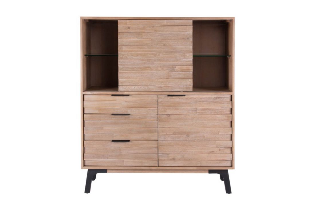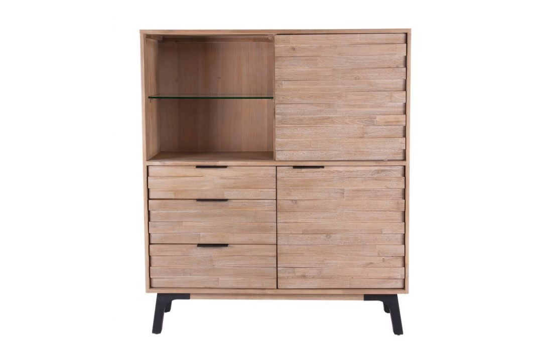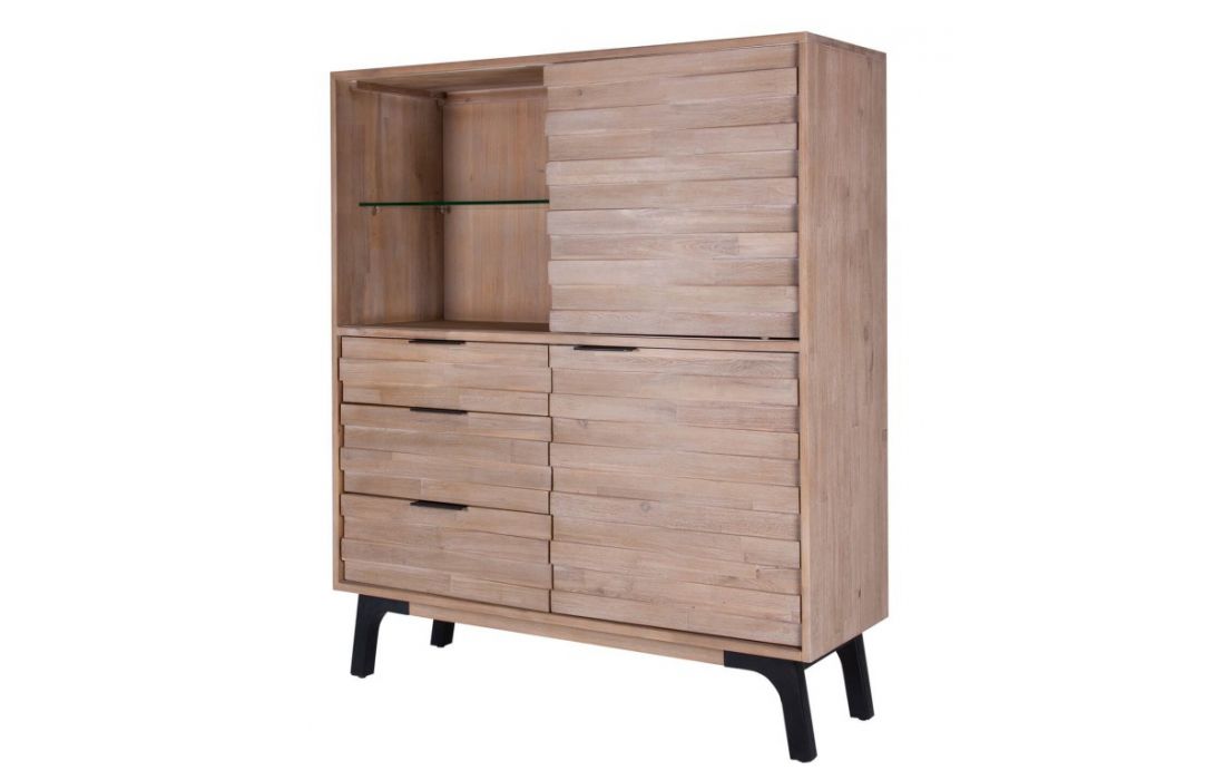 Bookseller with 3 drawers and 1 door + 1 sliding door on top with tempered glass shelf in both spaces, bookseller in solid acacia wood with natural finish