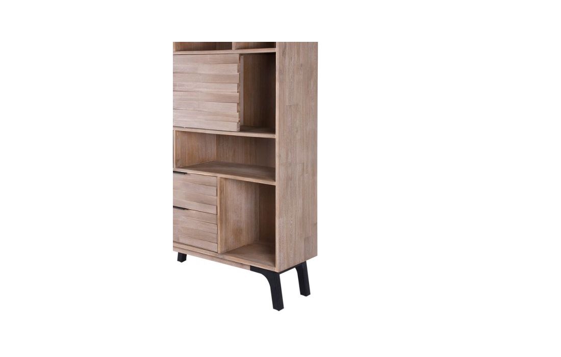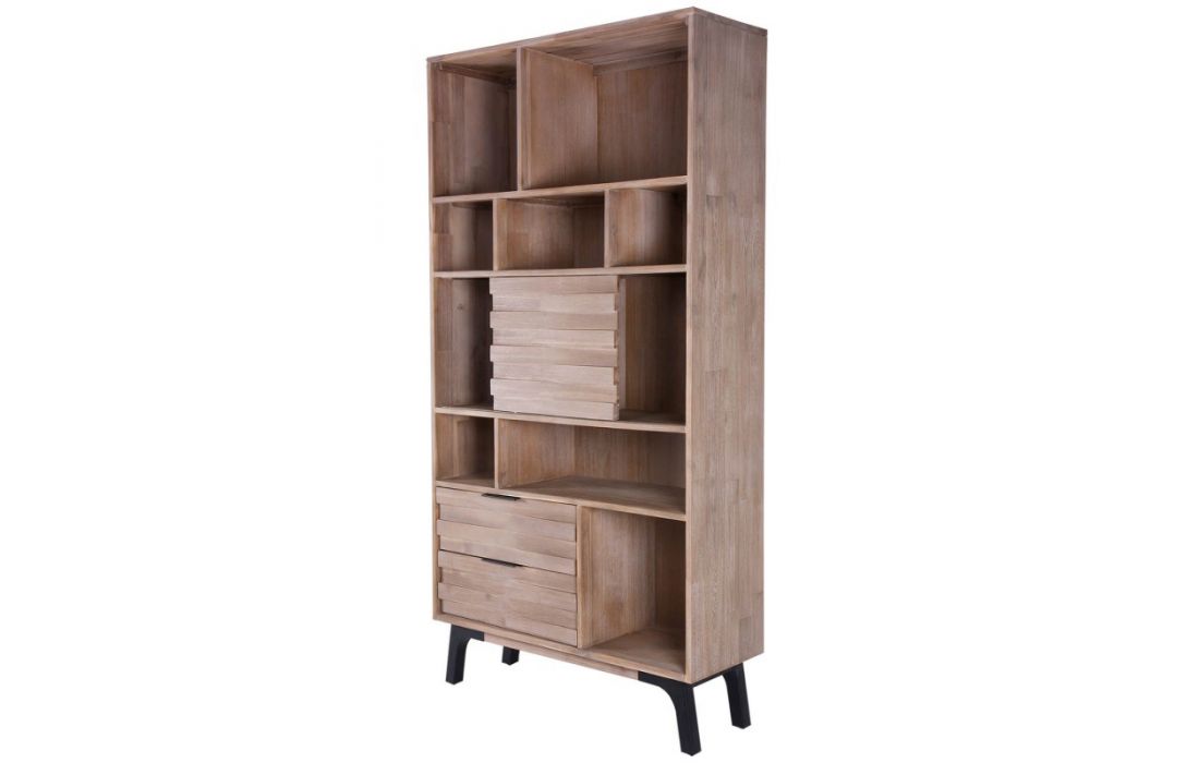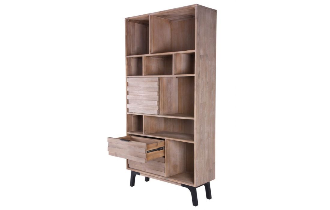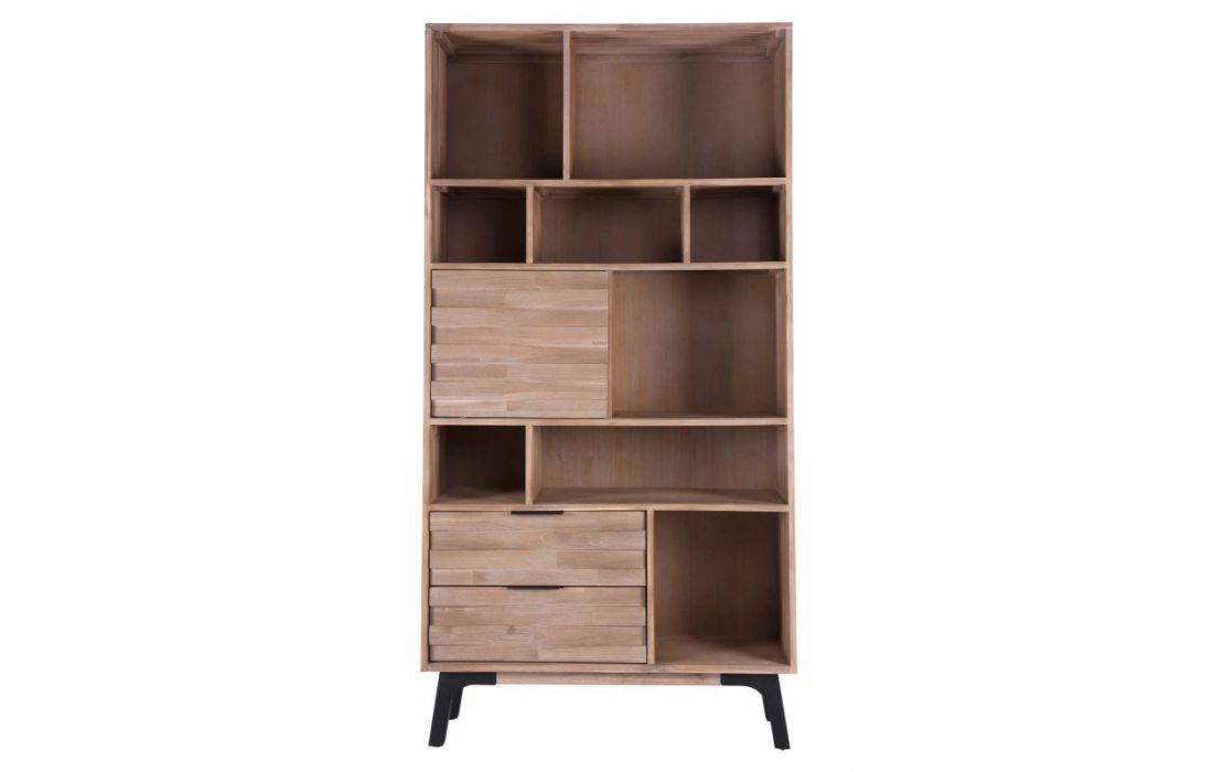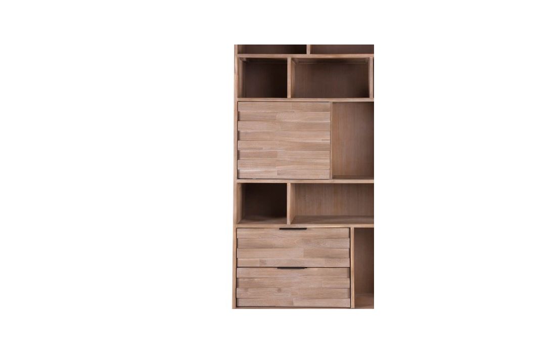 Bookseller with 2 drawers and 1 sliding door in solid acacia wood with natural finish