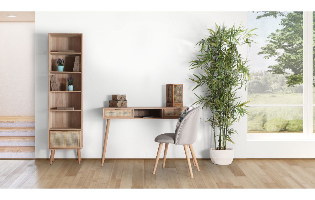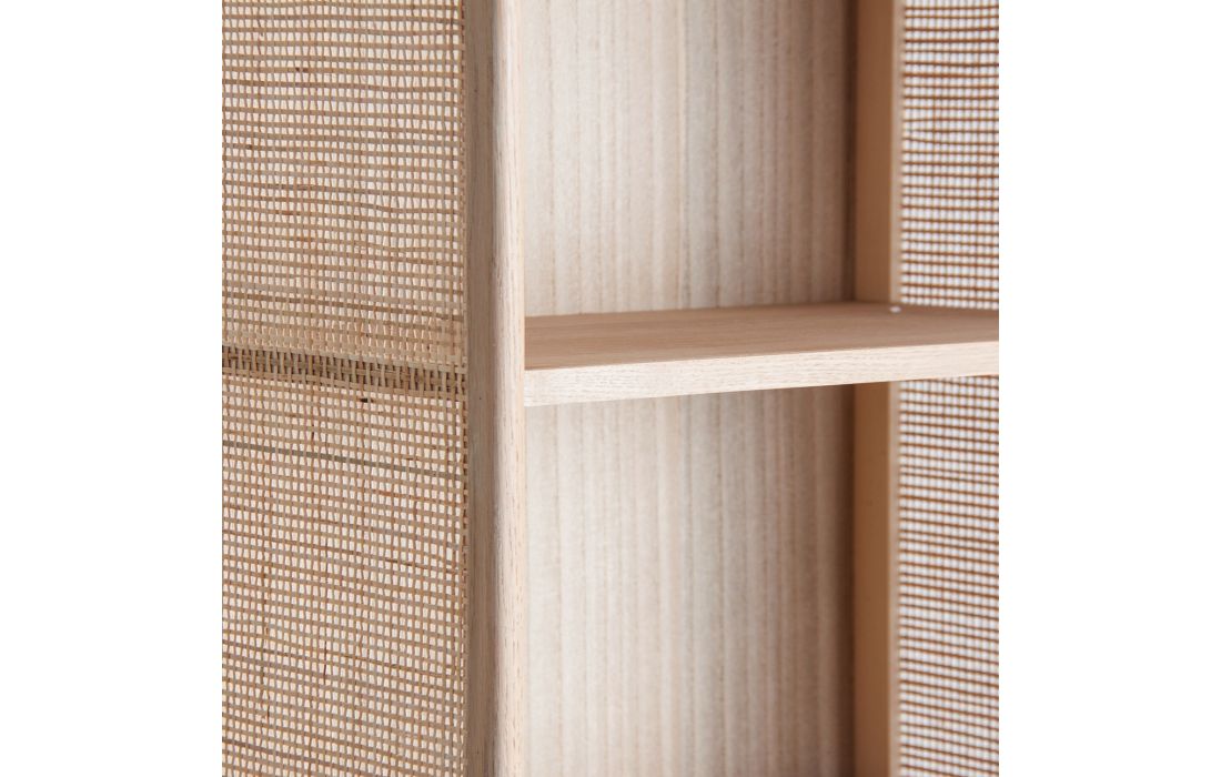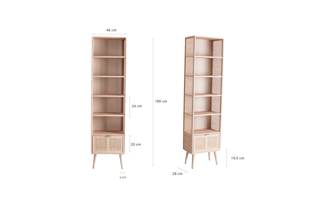 Bookseller made of pine wood and rattan, with five shelves and a small drawer