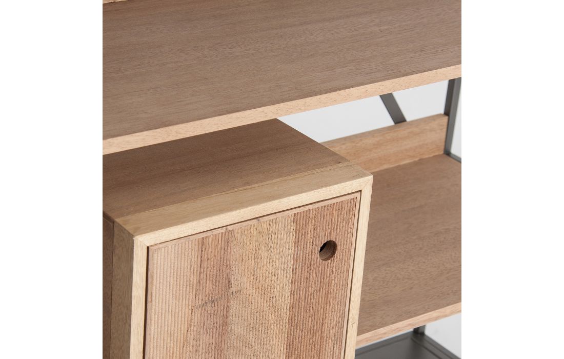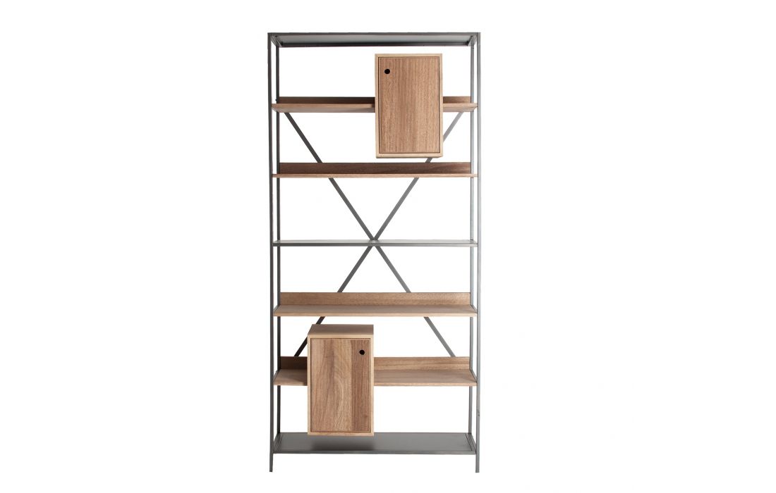 Bookseller in natural fir wood and gray iron structure, with 6 wooden and metal shelves and 2 drawers.